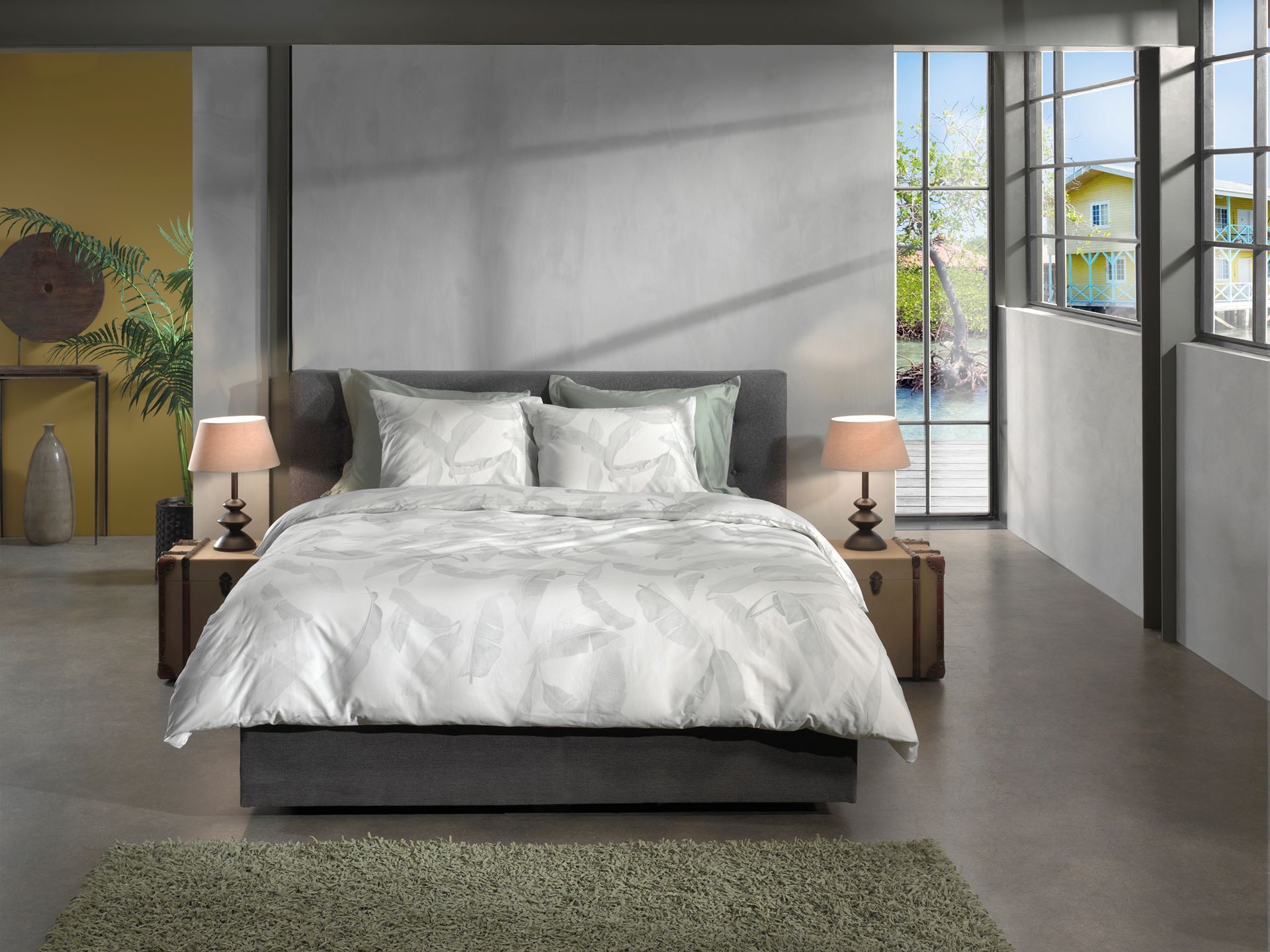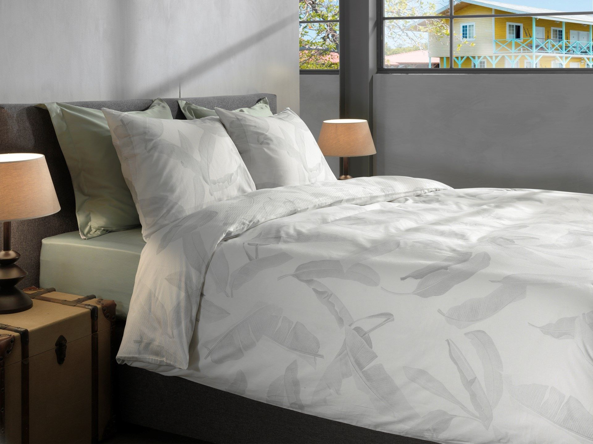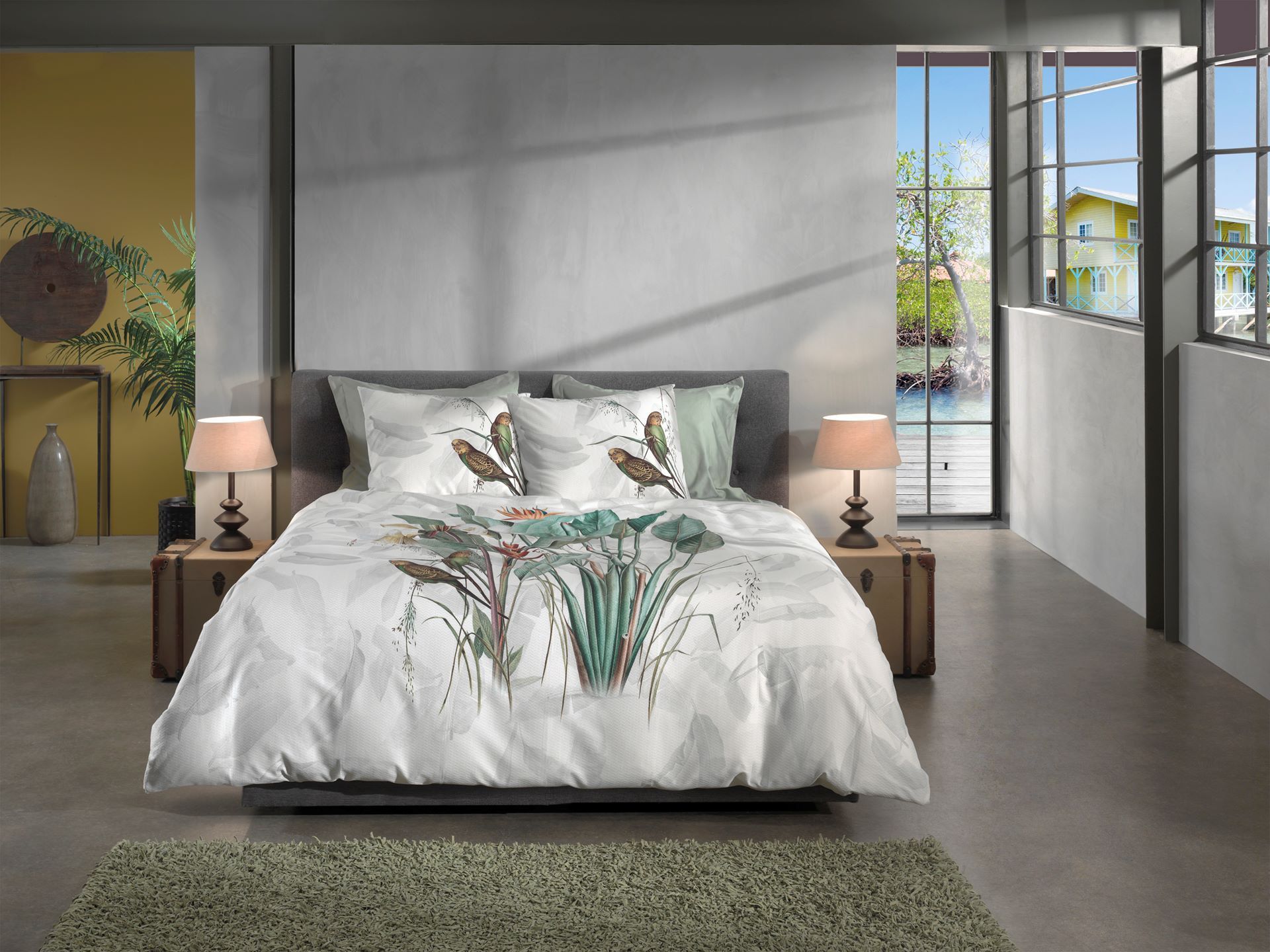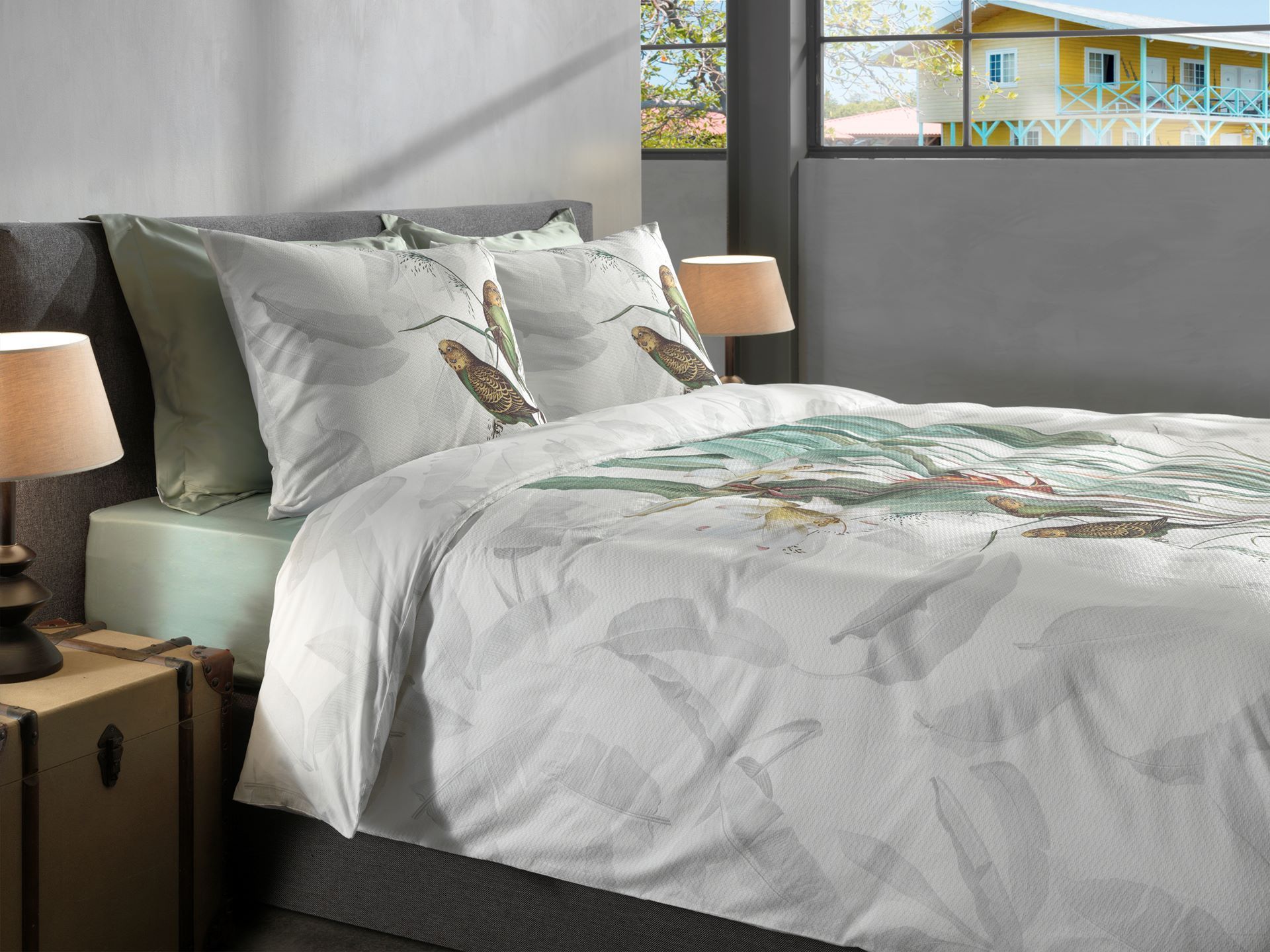 Heckett & Lane Satin Bettwäsche 135x200 Musa white Wellensittich Blätter grün