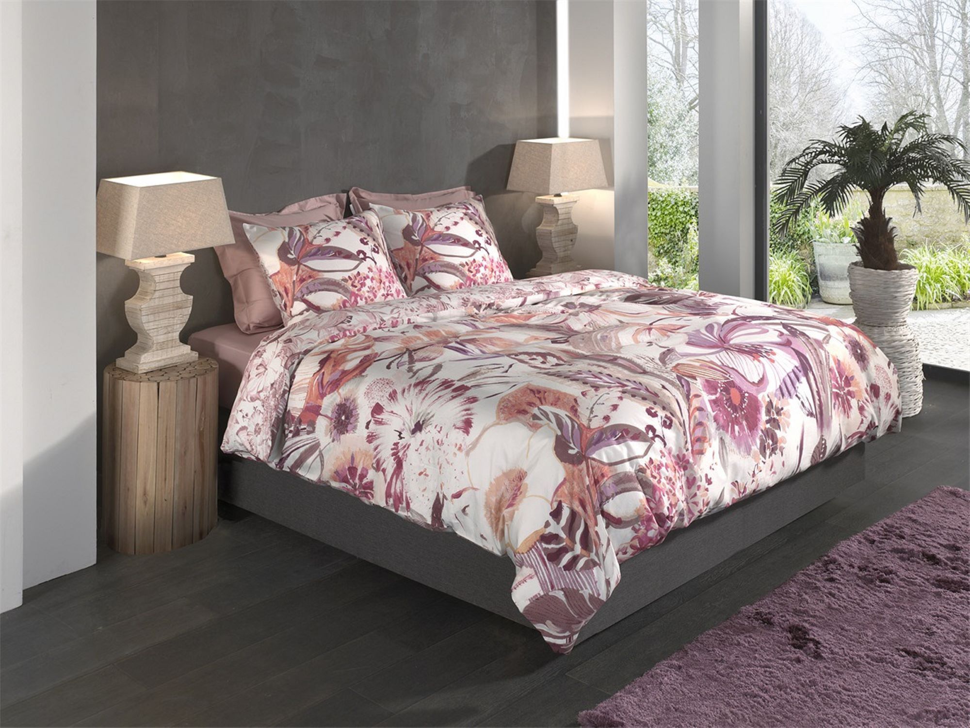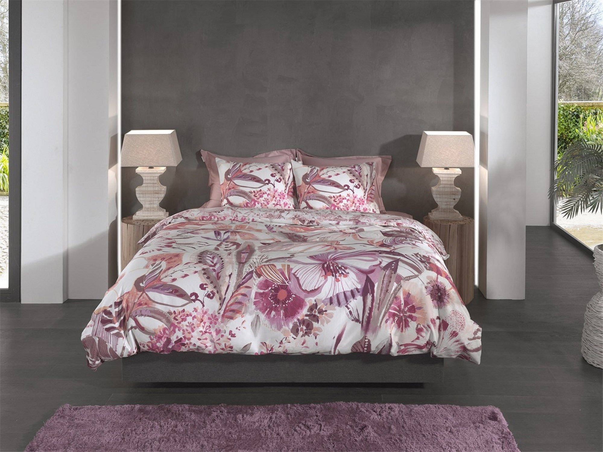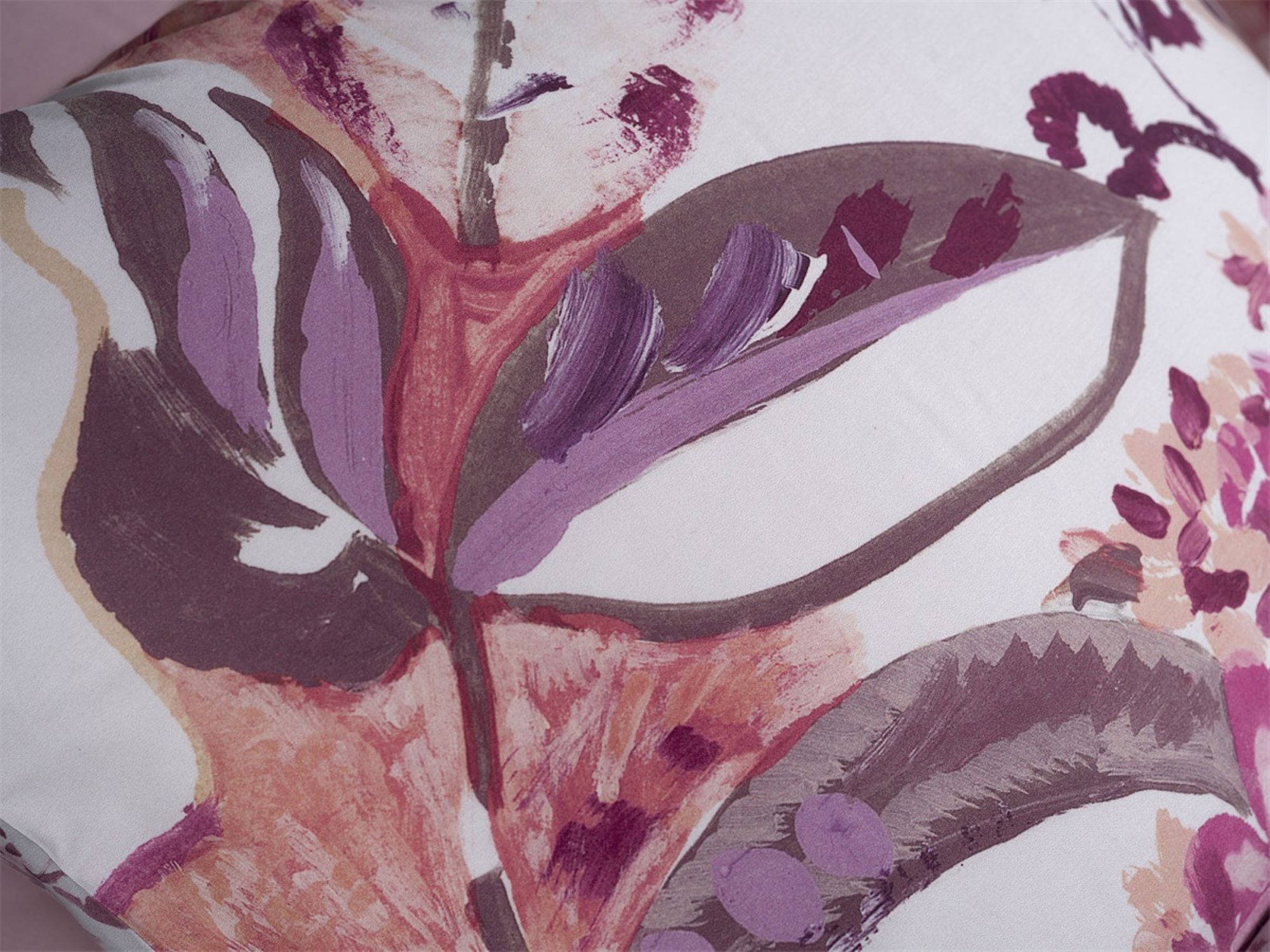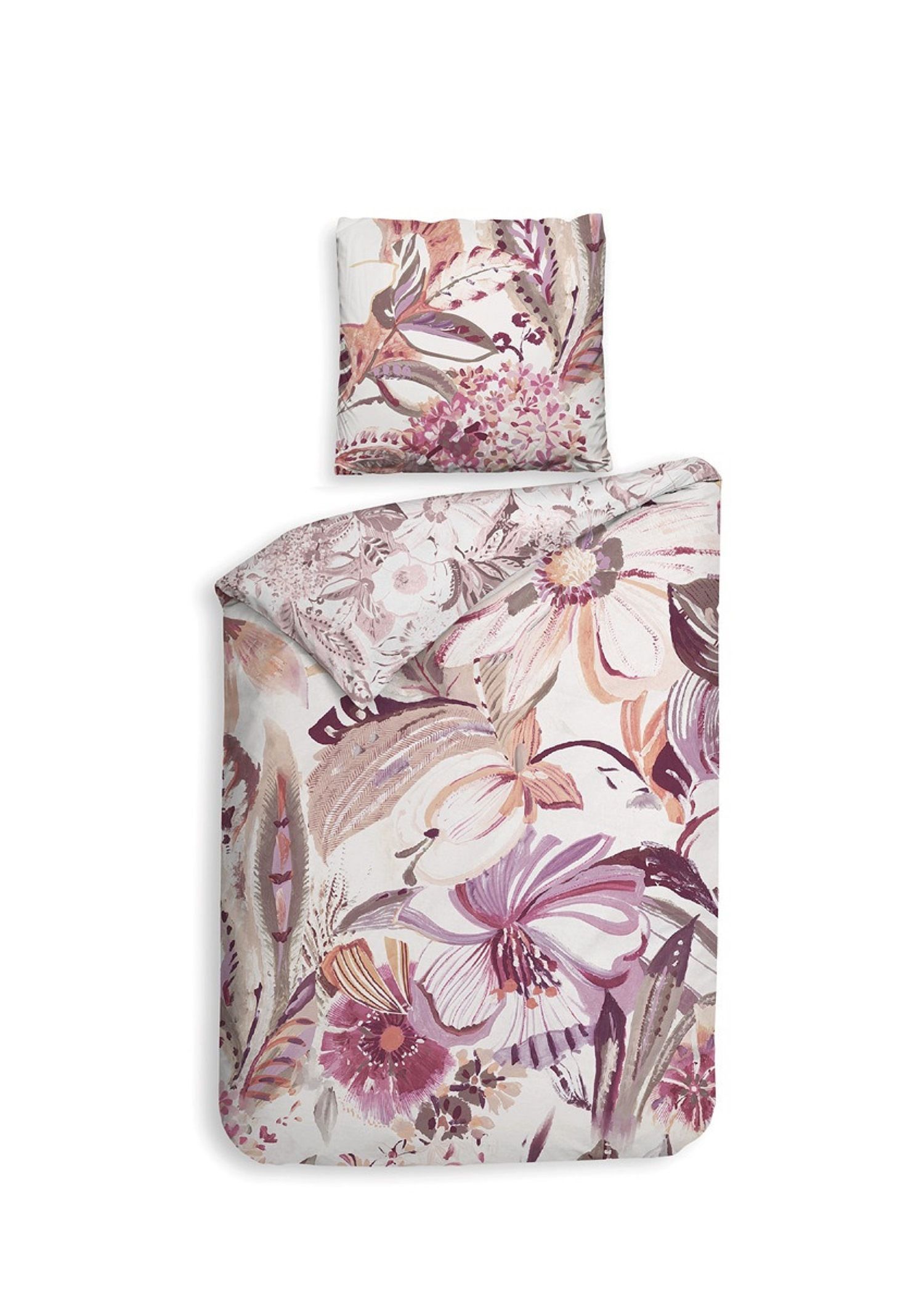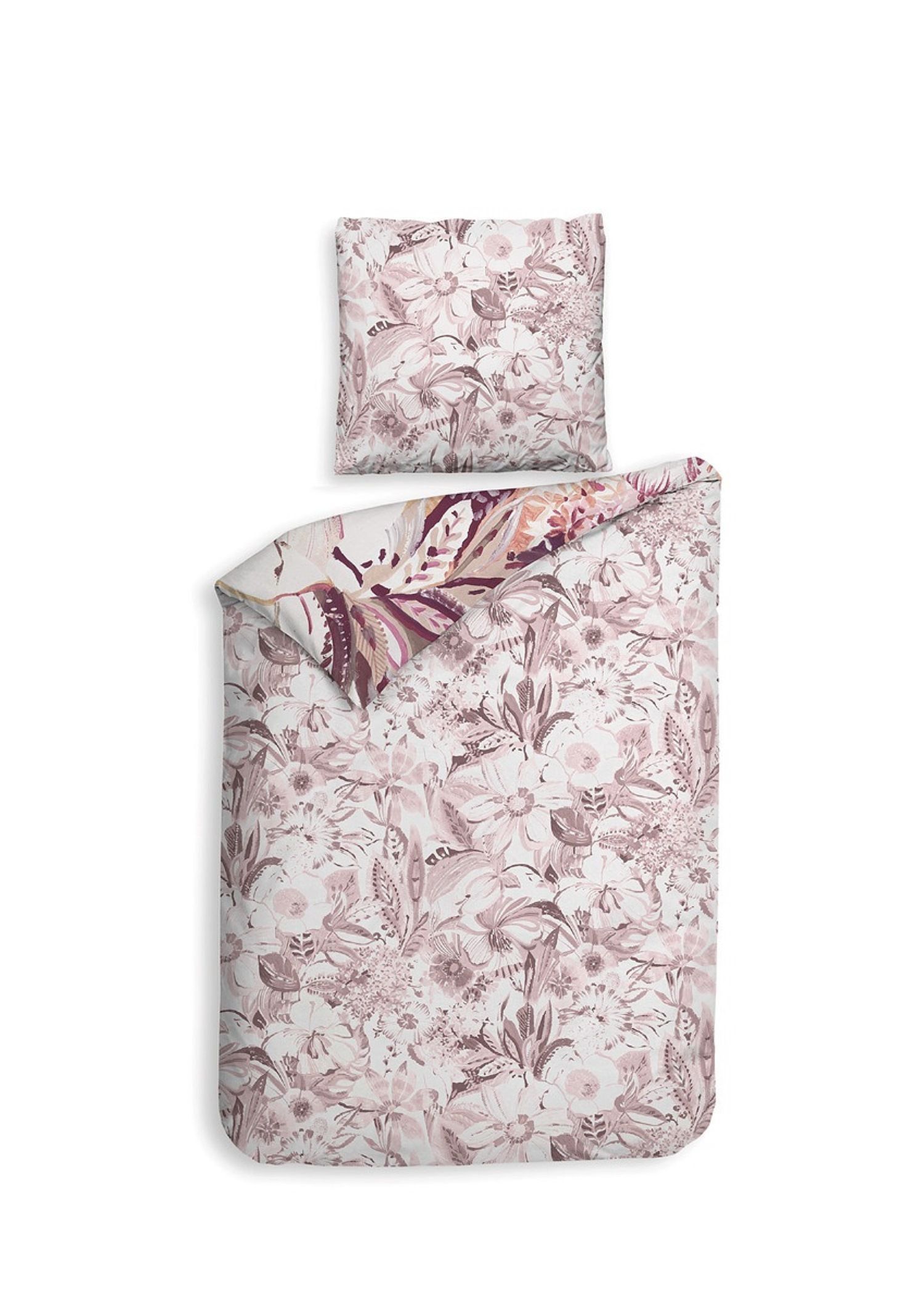Heckett & Lane Satin Bettwäsche 155x220 Kina White Blüten Blätter lila rosa Wende