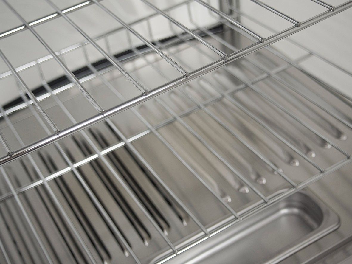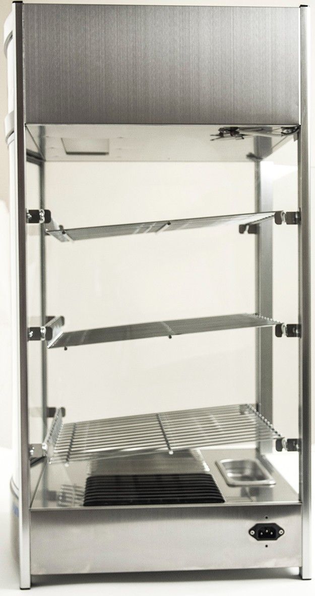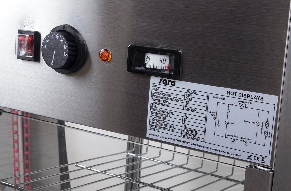 Heiße Theke Mod. FINN - Material: Edelstahl - 3 höhenverstellbare Roste, verchromt - Tür auf der Rückseite - Manuelle Temperaturkontrolle - Inkl. Wasserschale zur Befeuchtung der Luft - Beleuchtetes Display - Gewicht: 24 kg - Maße: B 460 x T 448 x H 785 mm - Inhalt: 97 Liter - Temp. +30/+90 °C - Anschluss: 230 V - 50 Hz - 1,2 kW