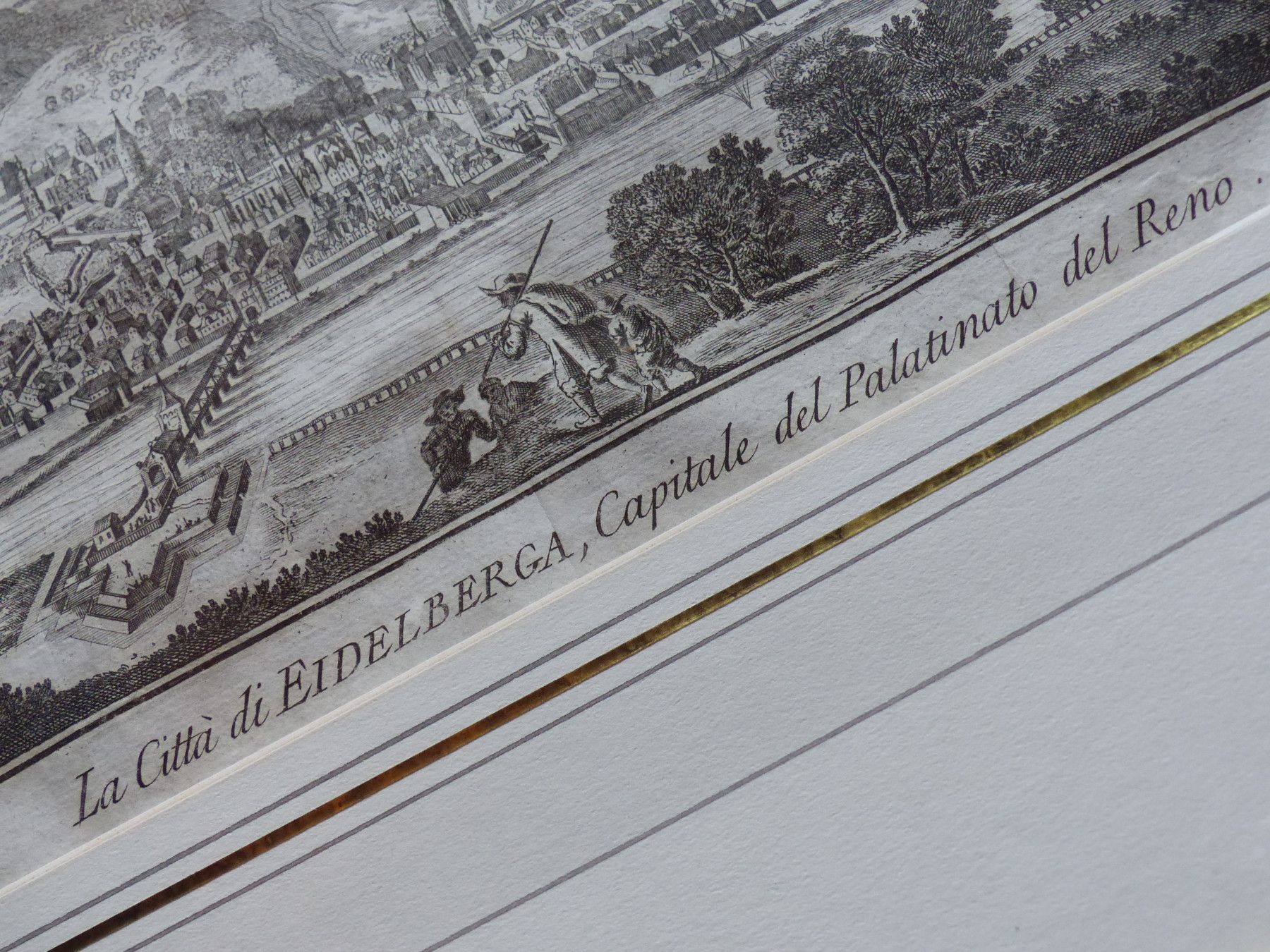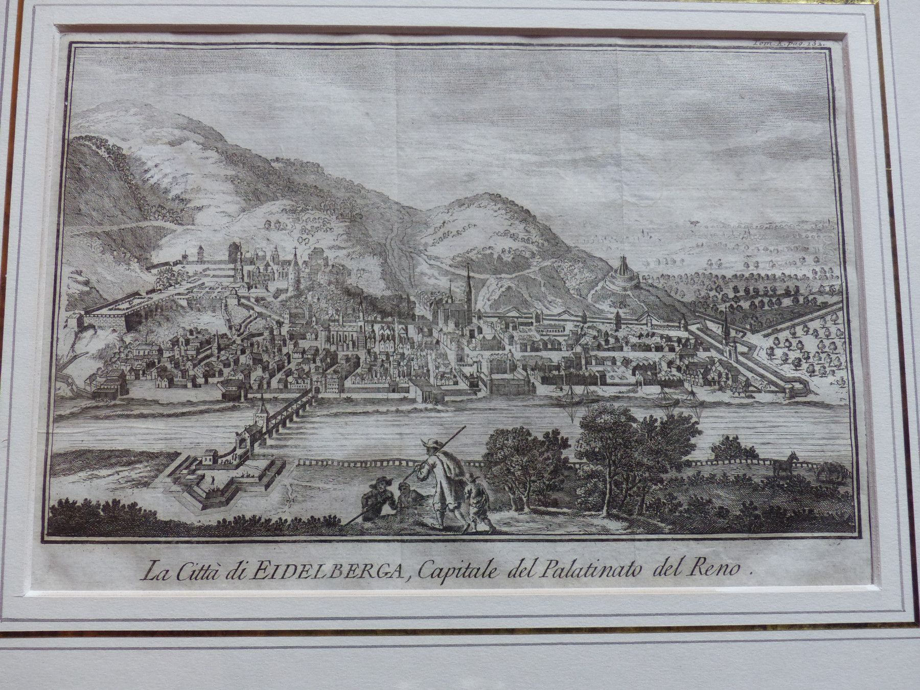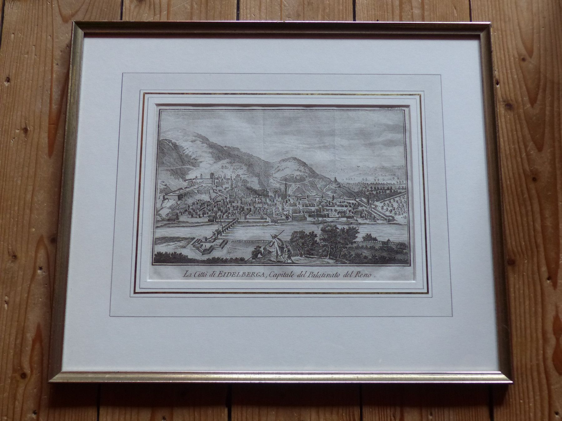 Original alter Kupferstich von Heidelberg Aus Nachlass, wurde einmal in einerr Kunstgalerie erworben Gesamtansicht Heidelberg La Citta de Eidelberga, Capitale del Palatinato del Reno Zeitraum um 1740 - von Filosi Salmon Maße des Stiches selbst: Ca. 21,5 x 14 cm Gesamtmaße Bild im Rahmen ca. 37 x 31