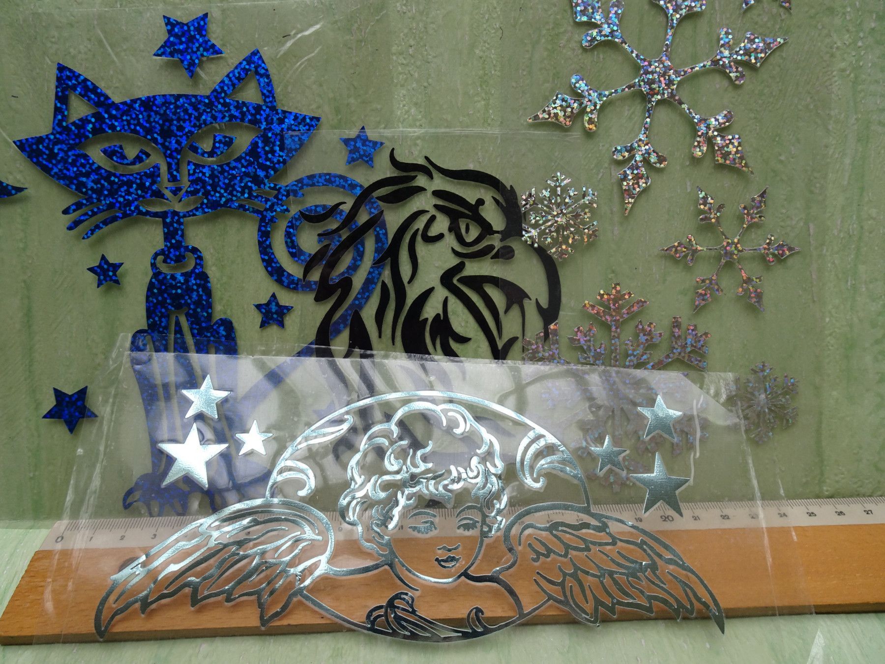 Engel, Schneekristalle, Adler und Katze