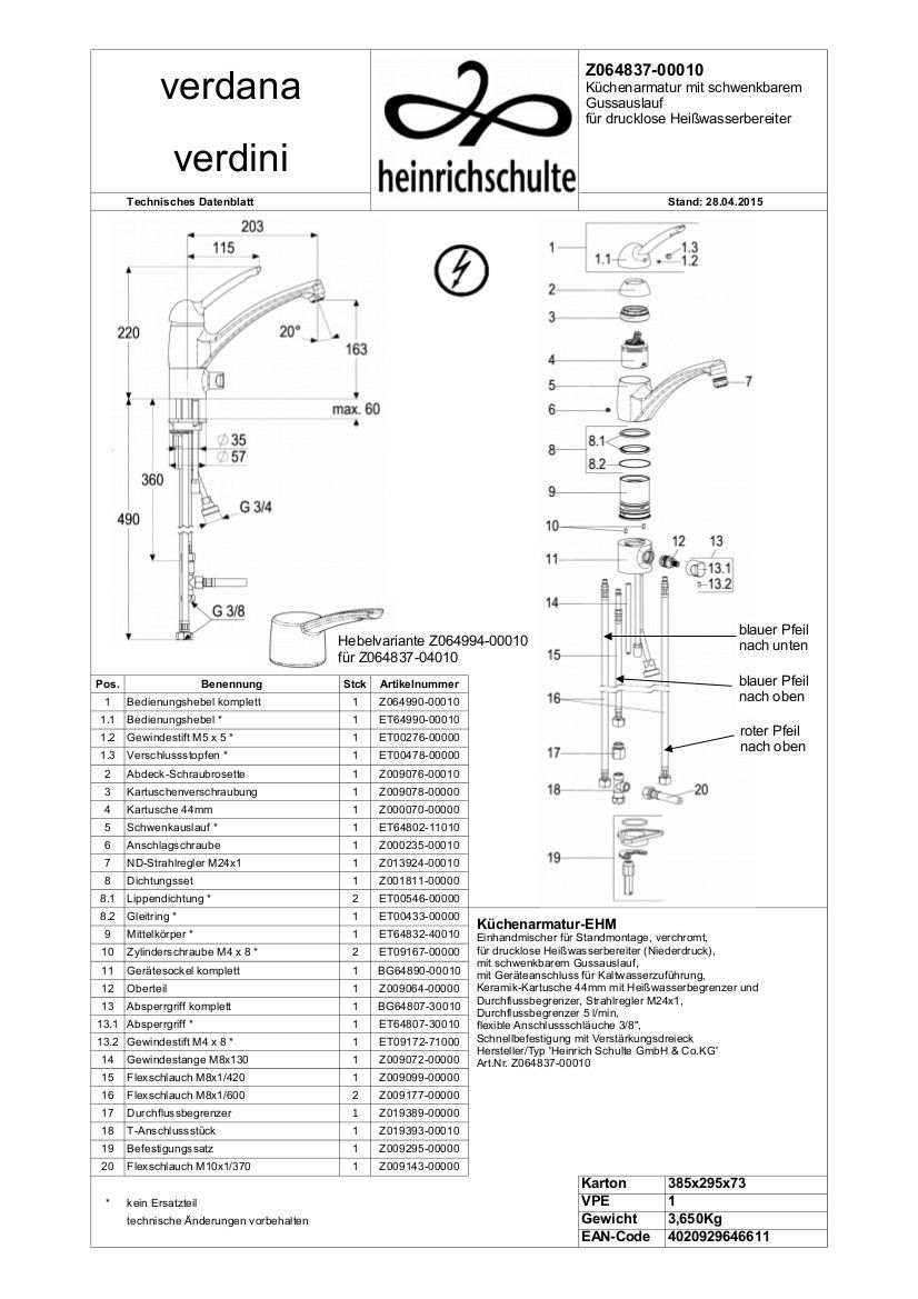 Heinrich Schulte verdini Küchenarmatur Niederdruck Nr. Z064837-04010