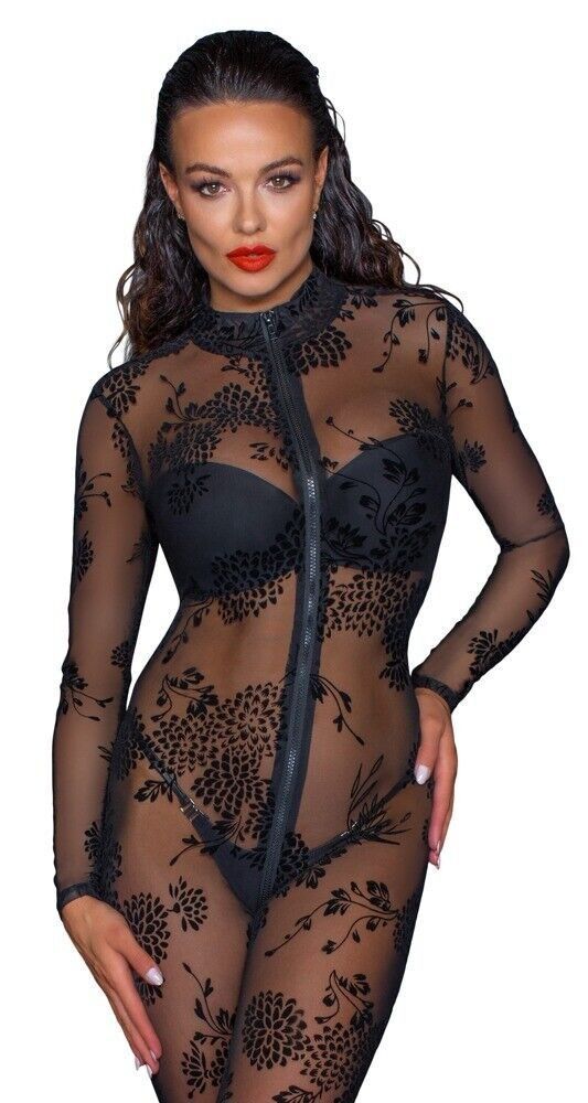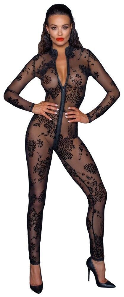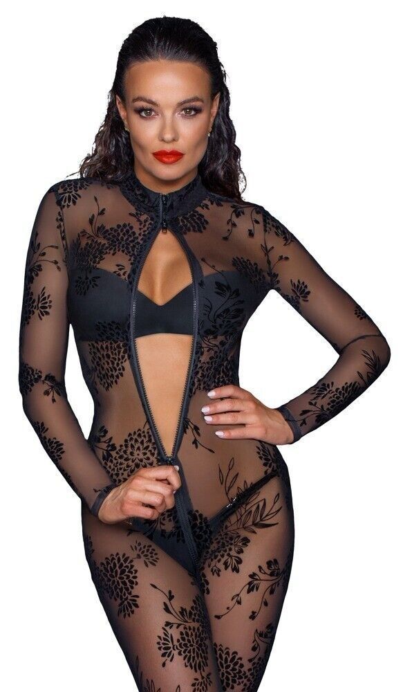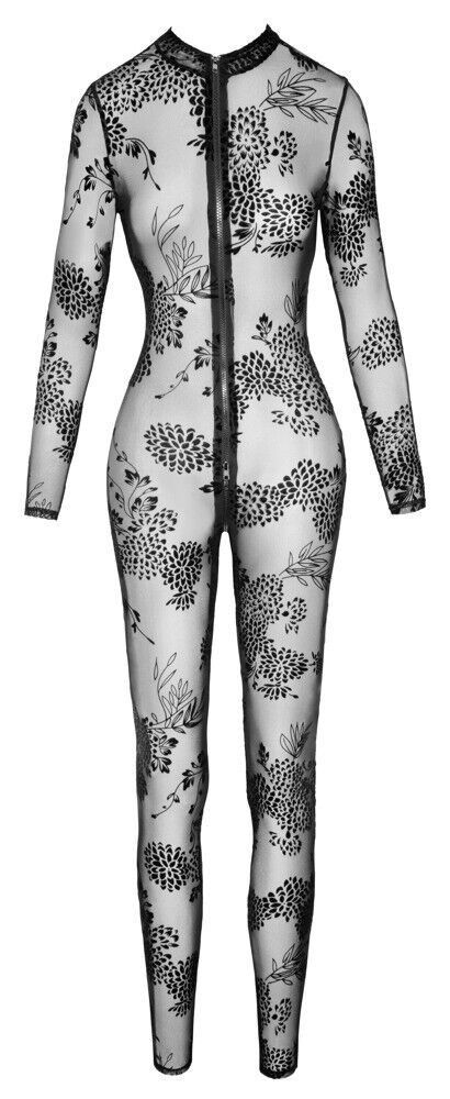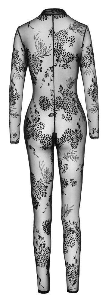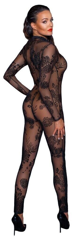 Heißer Overall Schwarz Sexy Catsuit mit Allover-Samtflockprint Gr. S bis 3XL
