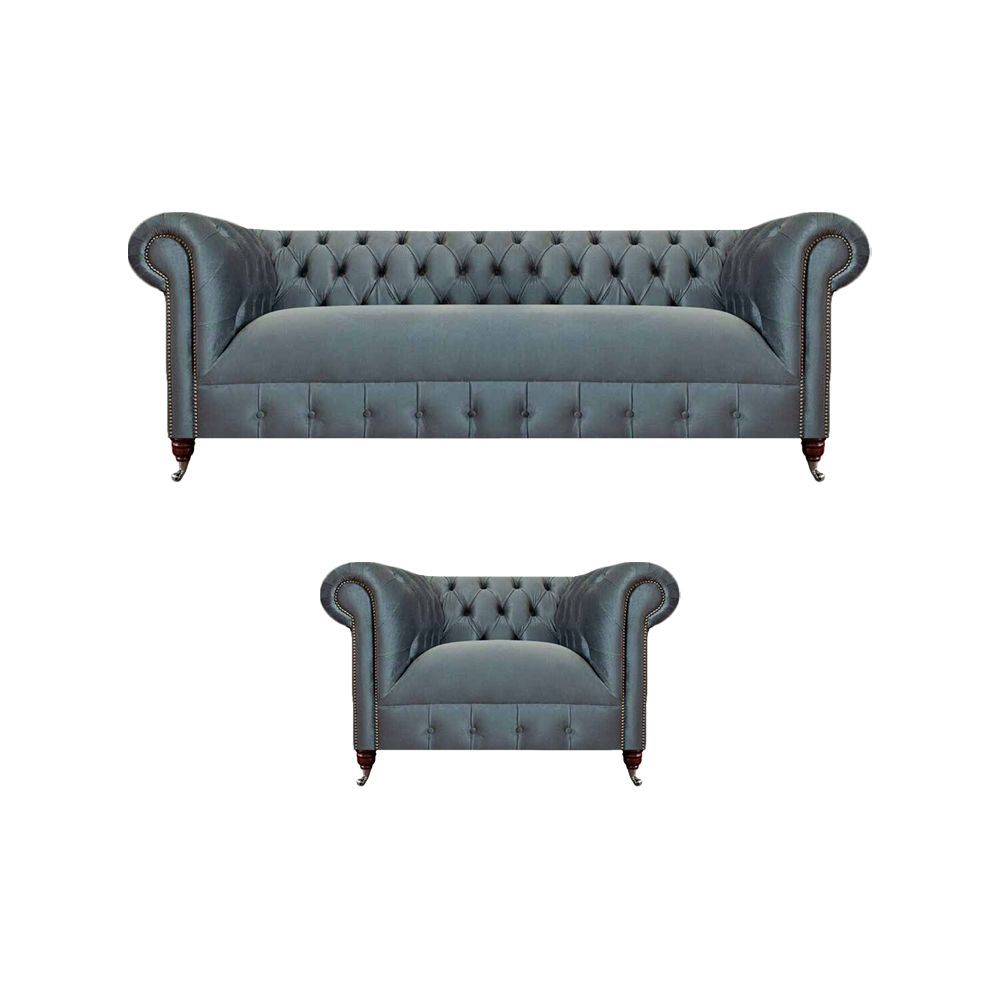 Hellgraue Polster Chesterfield Garnitur Wohnzimmer Dreisitzer Sessel
