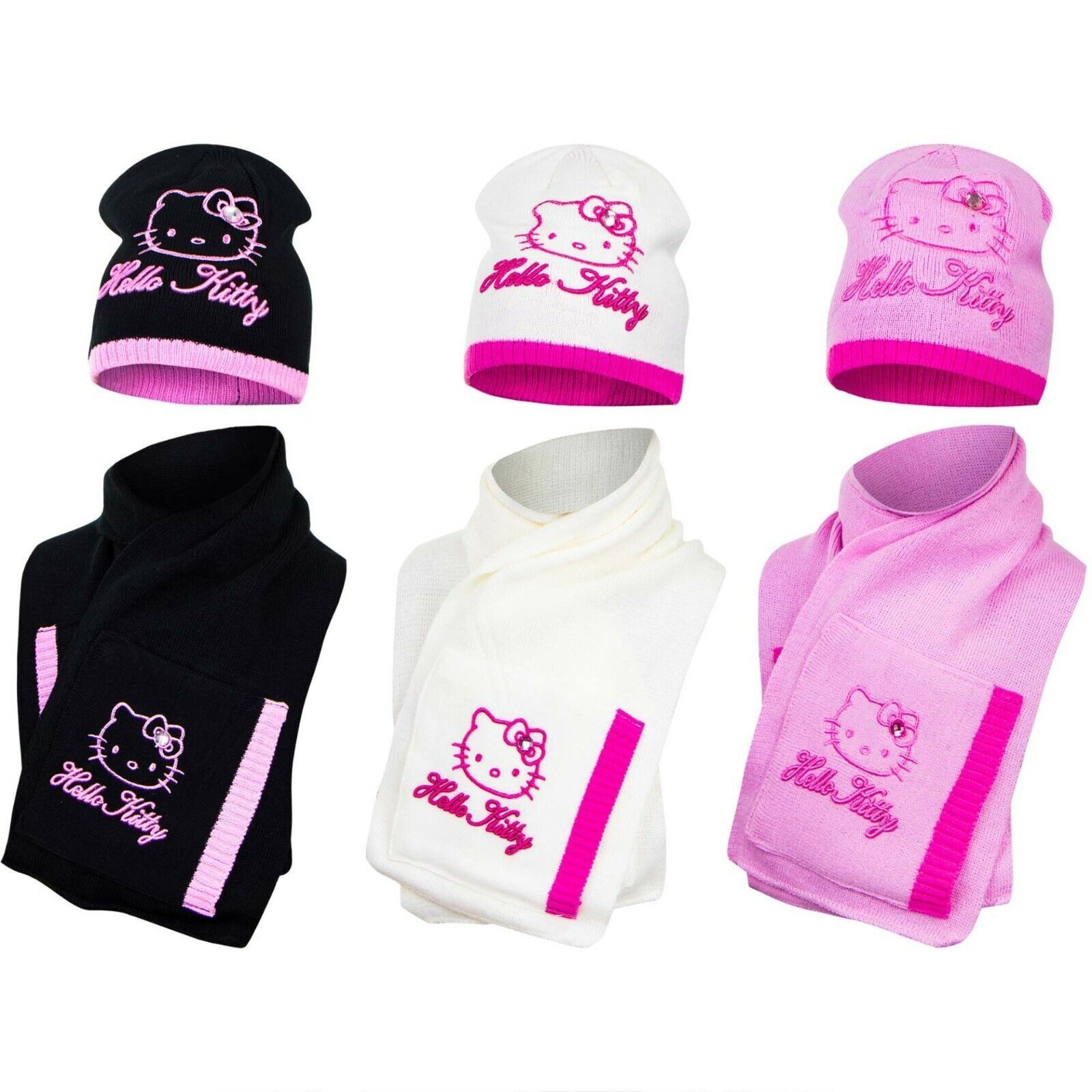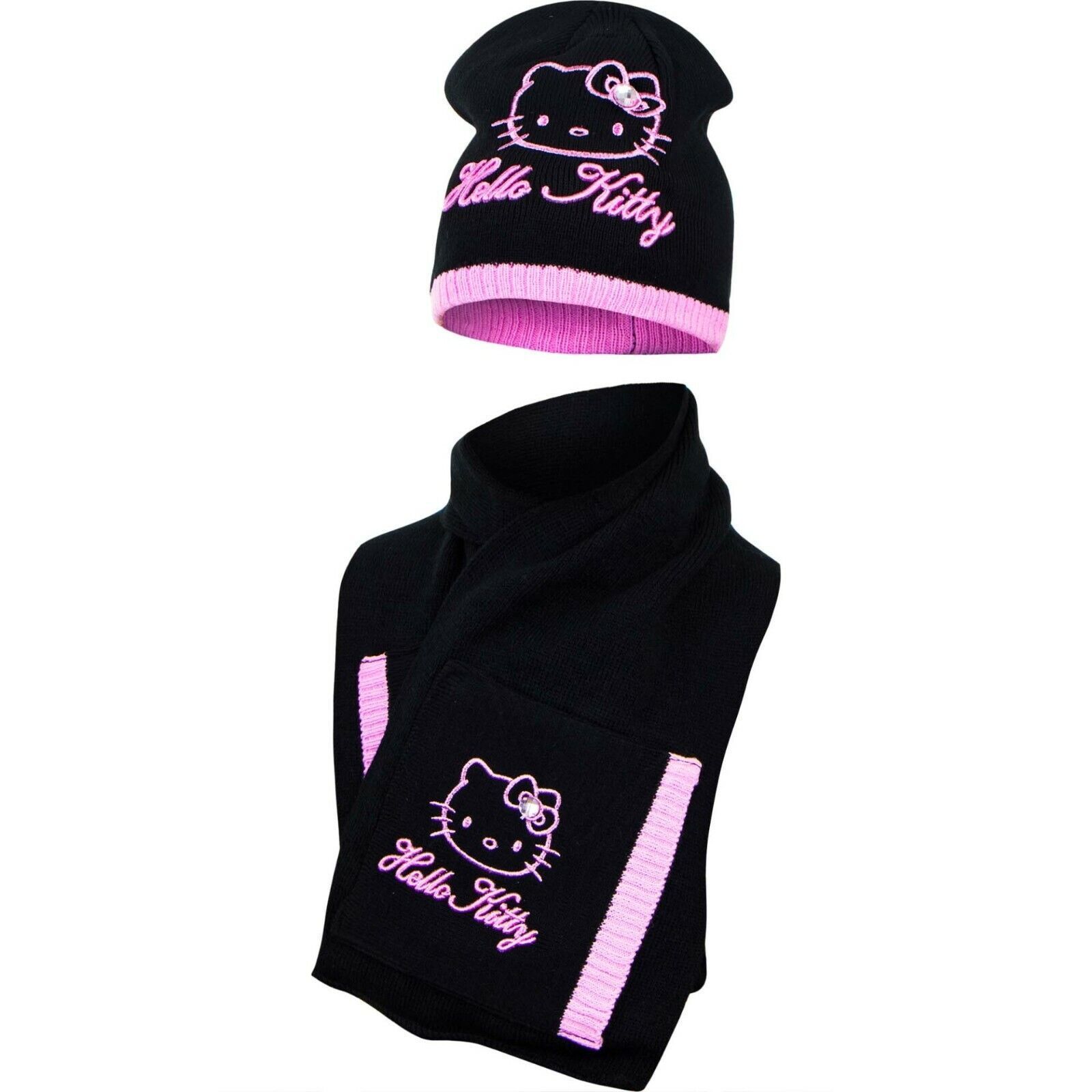 Hello Kitty Mütze Schal Set, Schwarz, Rosa, Weiß - 52 oder 54 - Kinder Mützenset