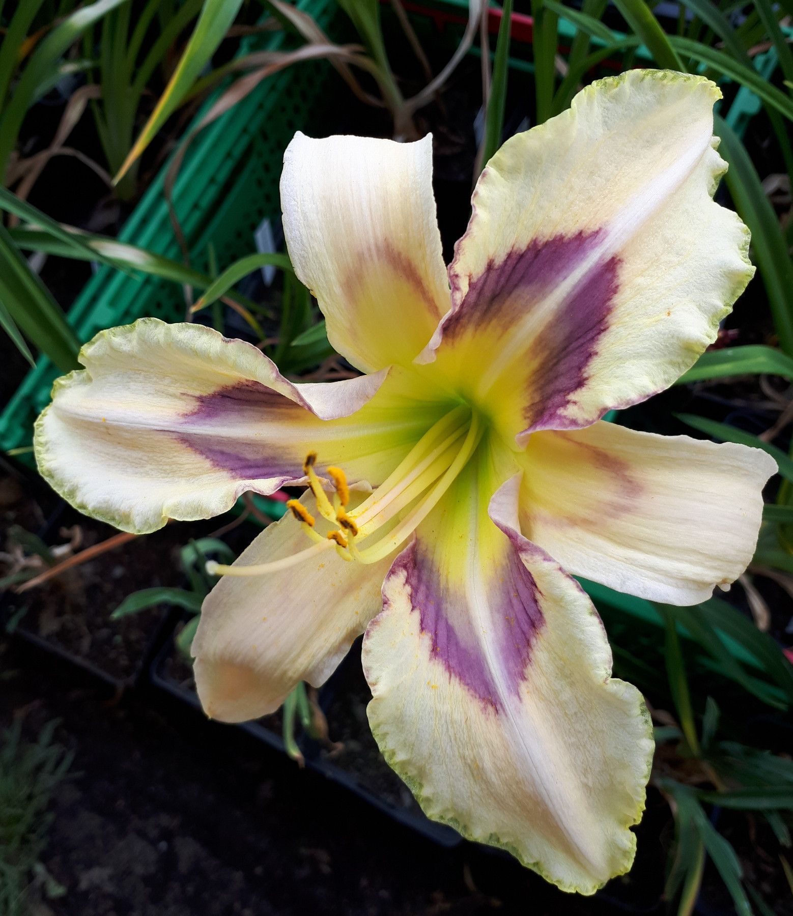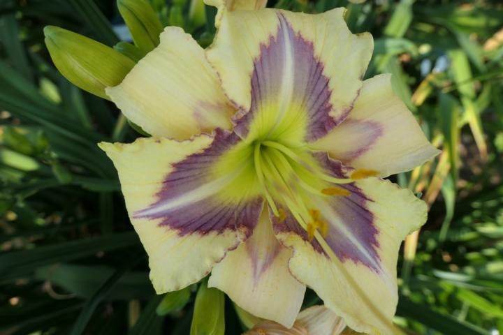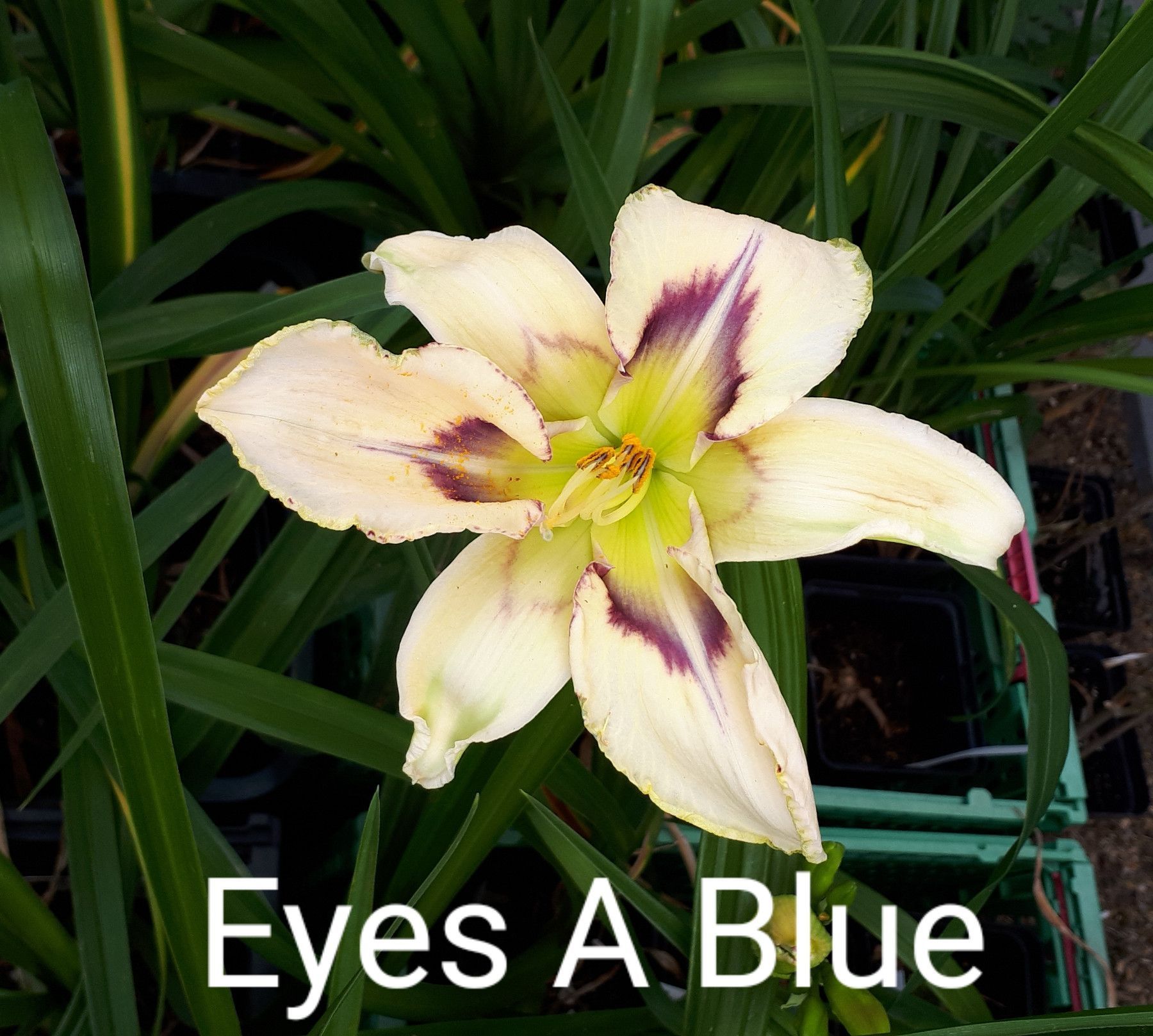 Hemerocallis - Taglilie Eyes A Blue Lambertson 1998 Höhe ca. 63 cm Blüte ca. 15 cm mind. 1 Fächer tet sev (ausgepflanzt winterhart) cremeweiß mit spitz zulaufendem blauen Auge und grünem Schlund Die Pflanzen werden wurzelnackt und eingekürzt versendet Versand bis zur Blüte Anfang Juni, nach der Blüt