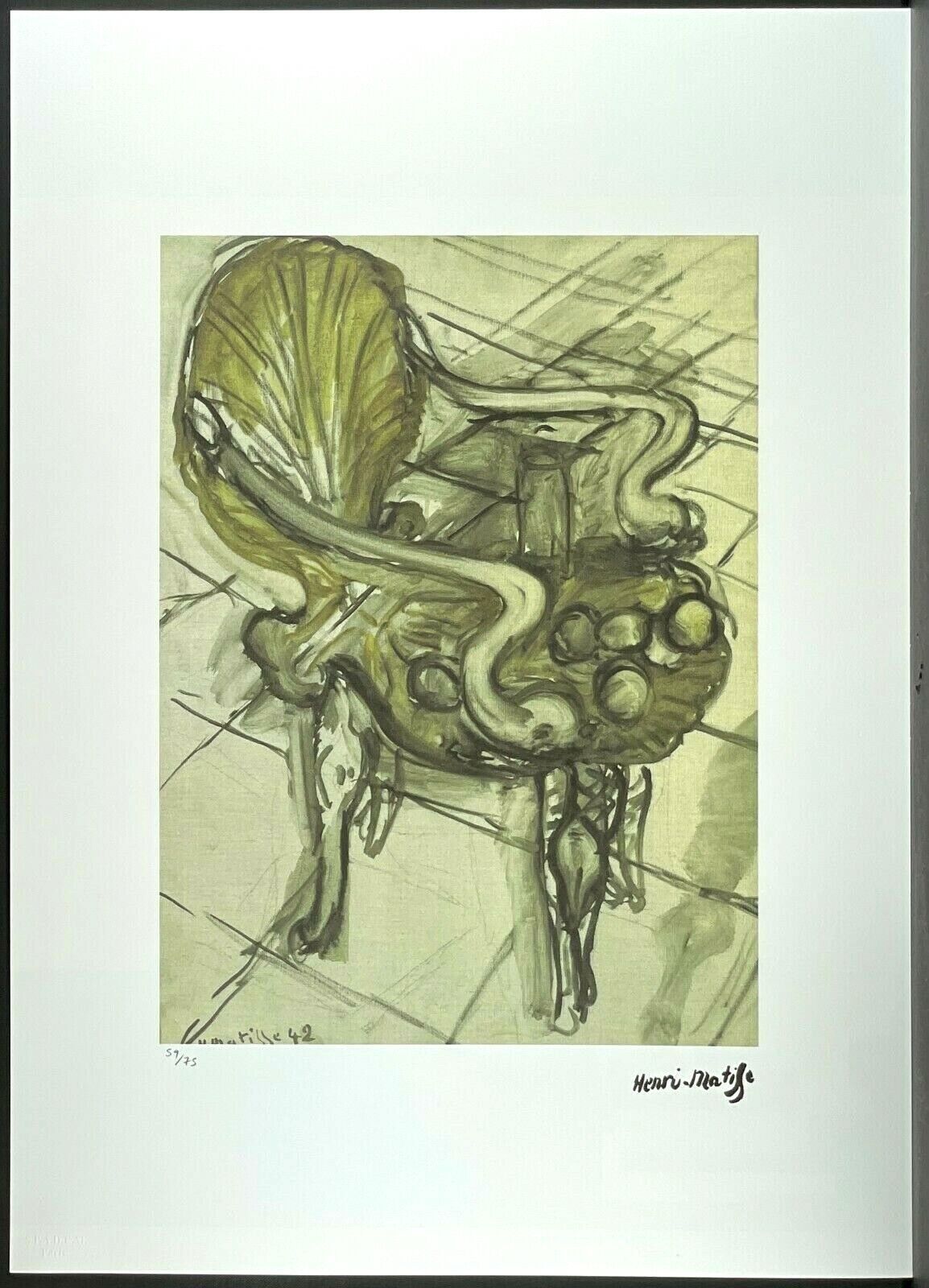 Lithographie Venezianischer Sessel mit Früchten In der Platte signiert und mit der Hand nummeriert Limitierte Auflage von 75 Stück Jedes Stück ist einzeln nummeriert 59 75 Gesamtgröße : 50 cm x 70 cm Nach dem Original von Henri Matisse Das Blatt wird flach verschickt, nicht gerollt! Alle angebotenen