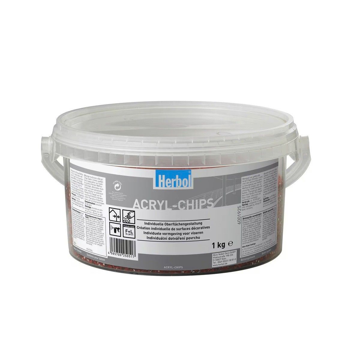 Herbol Acryl-Chips 3 mm 1 kg Details für Acryl-Chips 3 mm 1 kg: DIE FARBIGEN DEKO-CHIPS FÜR BODENFLÄCHEN Dekorative, 3 mm-große Acryl-Chips zur individuellen Oberflächengestaltung. Acryl-Chips (untereinander mischbar): weiß, gelb, rot, blau, grün, hellgrau, graphit-grau, schwarz Farbton: Div. T. Ver