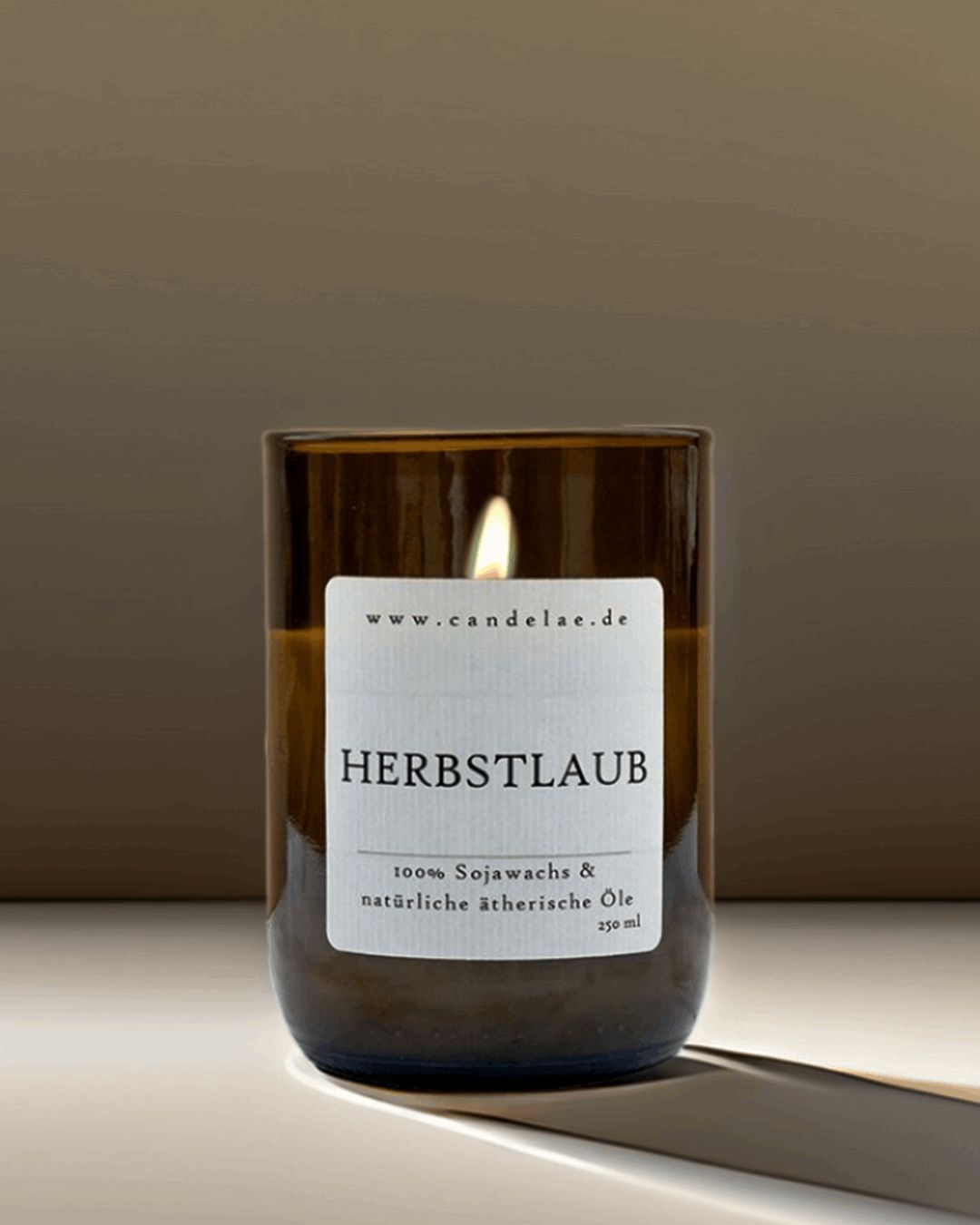 Ein besonderes Highlight ist das nachhaltige GefäÃ?: Die Kerze wird in upgecycelte Weinflaschen gegossen und verbindet so Umweltbewusstsein mit stilvollem Design. Mit einer Brenndauer von ca.50 Stunden ist Herbstlaub ein langlebiger Begleiter für gemütliche Herbstabende â?? perfekt auch als Geschenk.