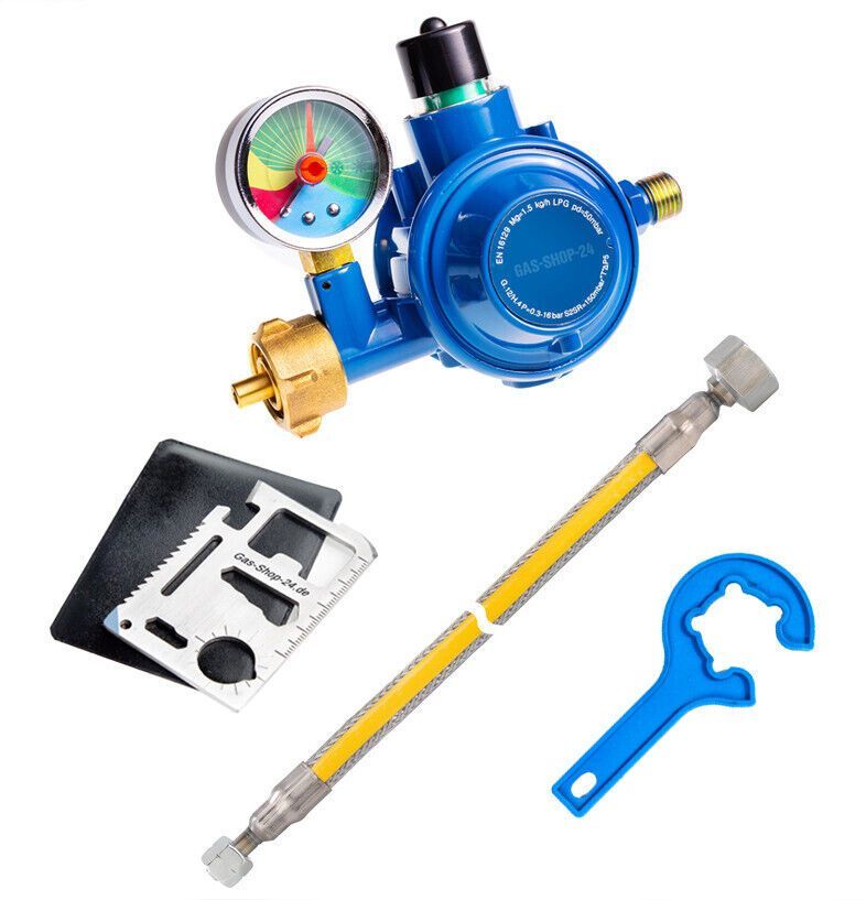 Herdanschlußset PRO: zum Anschluss von Flüssiggasflaschen bis 14 Kg an Haushaltsgeräten mit Anschluss R 1 2 - direkt mittels Edelstahl Wellschlauch. Für die Hausinstallation zugelassen! Entspricht den gesetzlichen Anforderungen. Vorteile: direkter Anschluss des Edelstahl Wellschlauch (1 m) an den Dr