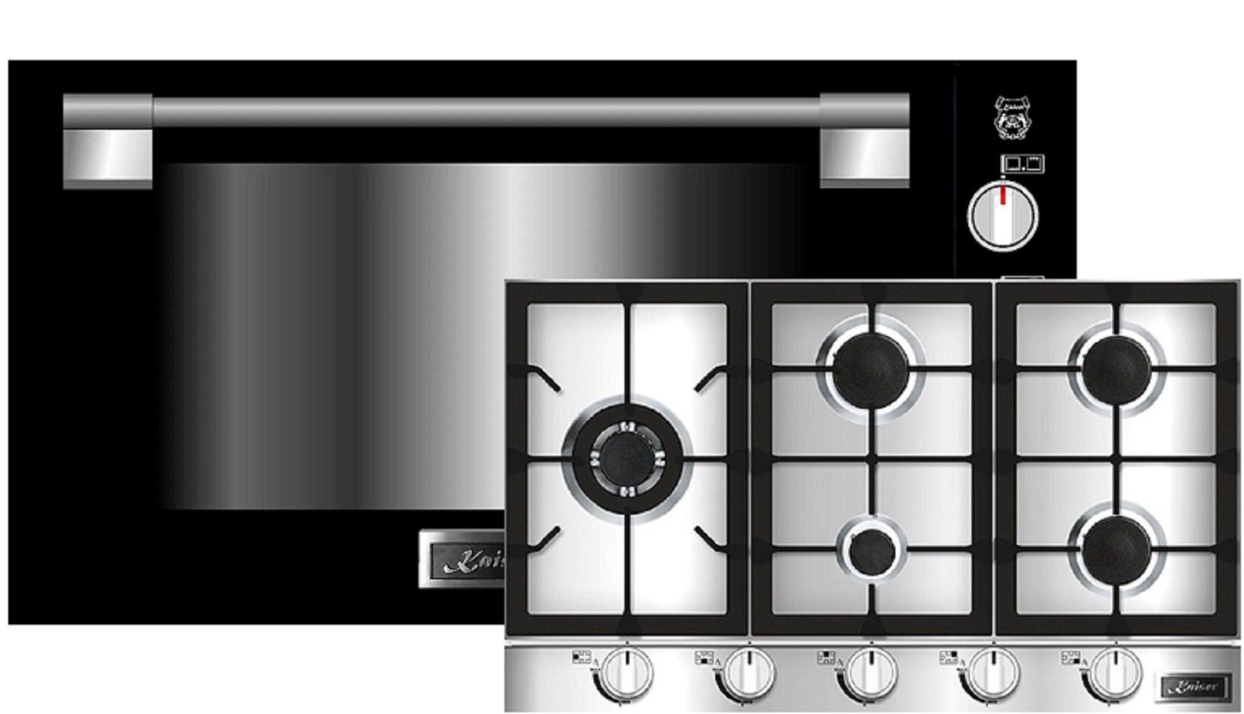 Kaiser Küchengeräte Gasherd-Set EG 9371+KG 9357/3, Einbau Gas Backofen 90 cm 79L autark Grill Selbstreinigung Schwarz Glas+Gas-Kochfeld,Einbau Gasherd 90cm, Edelstahl, WOK Turbo-Brenner – 3,8 kW.