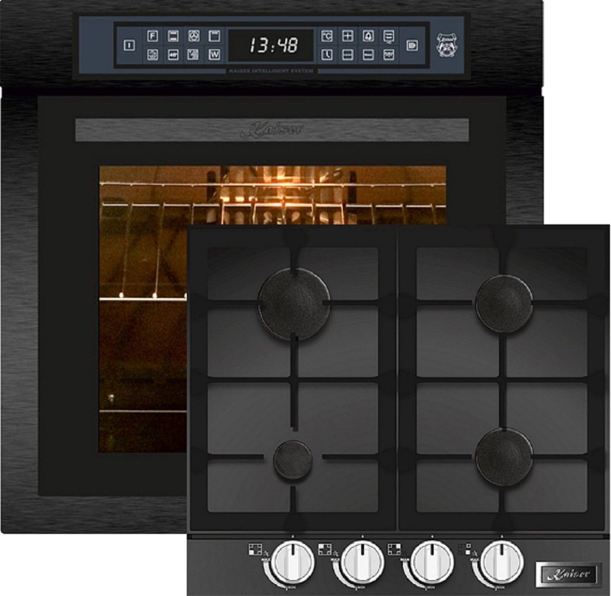 Kaiser Küchengeräte Backofen-Set EH 6306 RS + KCG 6387, Einbaubackofen,Schwarzes Stahl, schwarzes Glas,79L 15 Fkt. Grill Air fryer Full Touch,Funktion Heißluftfritteuse,Autark, Heißluftofen, Herausnehmbare Glasstür, mit Grill, Umluftofen, Katalytisches Reinigungssytem+Einbau Gaskochfeld 60cm, Schwarzglas mit Facette vorne, Einbau Herd, 3,8kW WOK, Erdgas Propangas