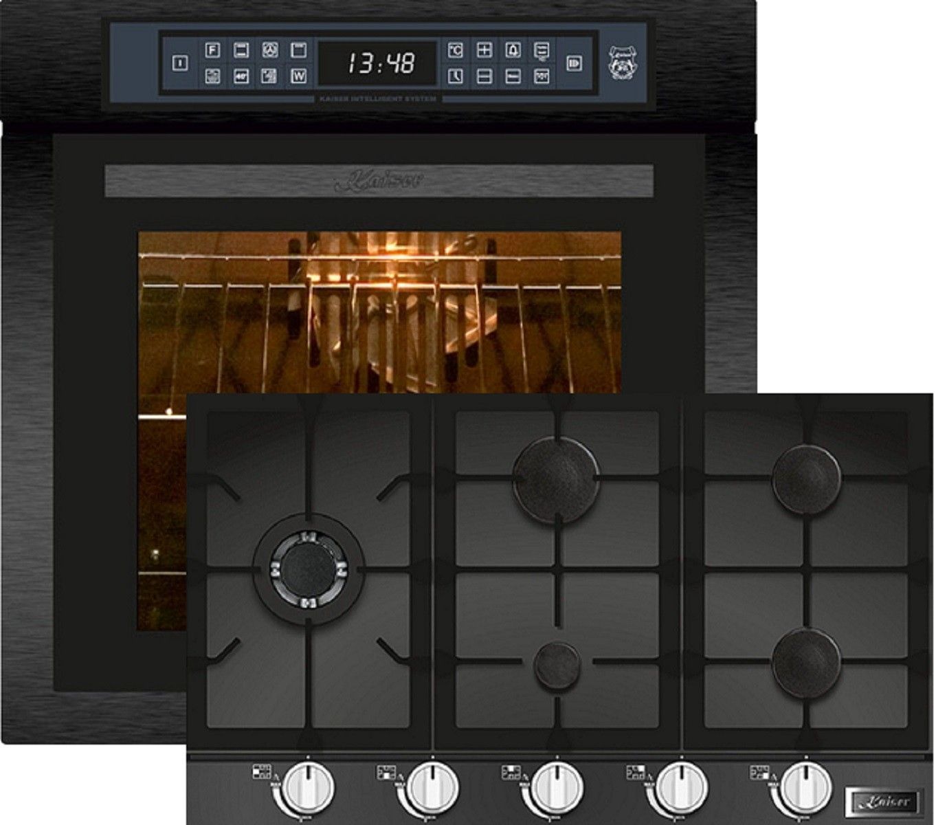 Kaiser Küchengeräte Backofen-Set EH 6306 RS + KCG 9387, Einbaubackofen,Schwarzes Stahl, schwarzes Glas,79L 15 Fkt. Grill Air fryer Full Touch,Funktion Heißluftfritteuse,Autark, Heißluftofen, Herausnehmbare Glasstür, mit Grill, Umluftofen, Katalytisches Reinigungssytem+Kaiser Küchengeräte Gas-Kochfeld KCG 9387, 90cm,Einbau Herd, Knebel aus Edelstahl,Schwarz Glas, 3,8 KW WOK
