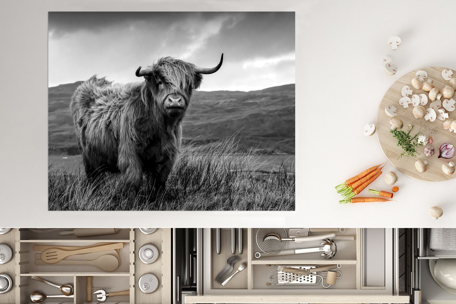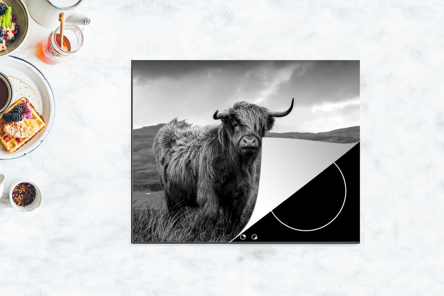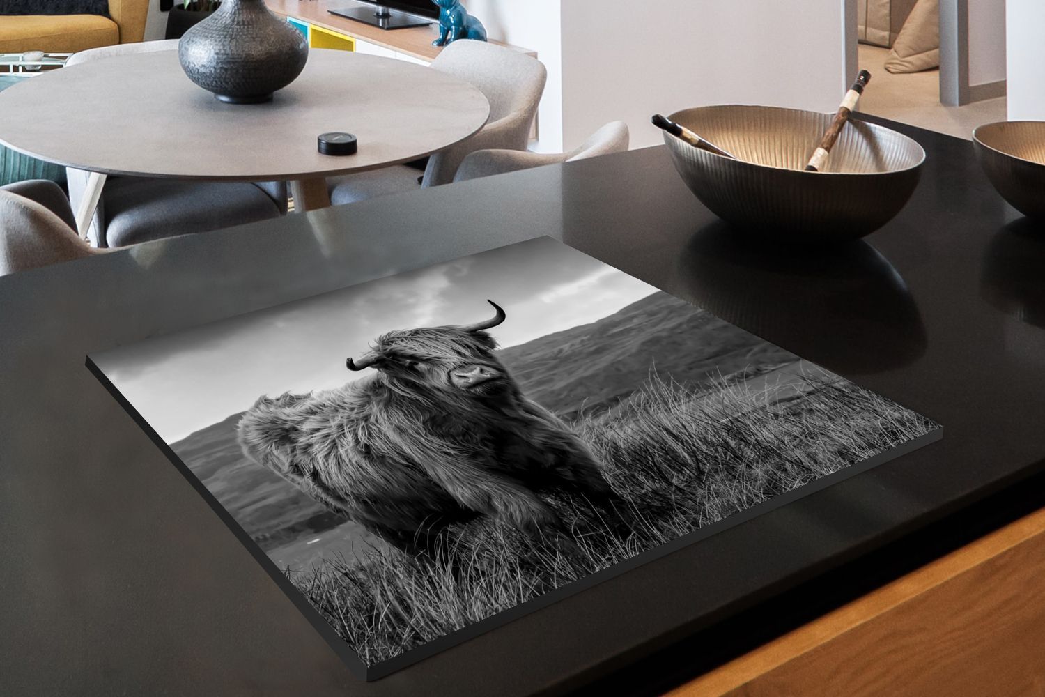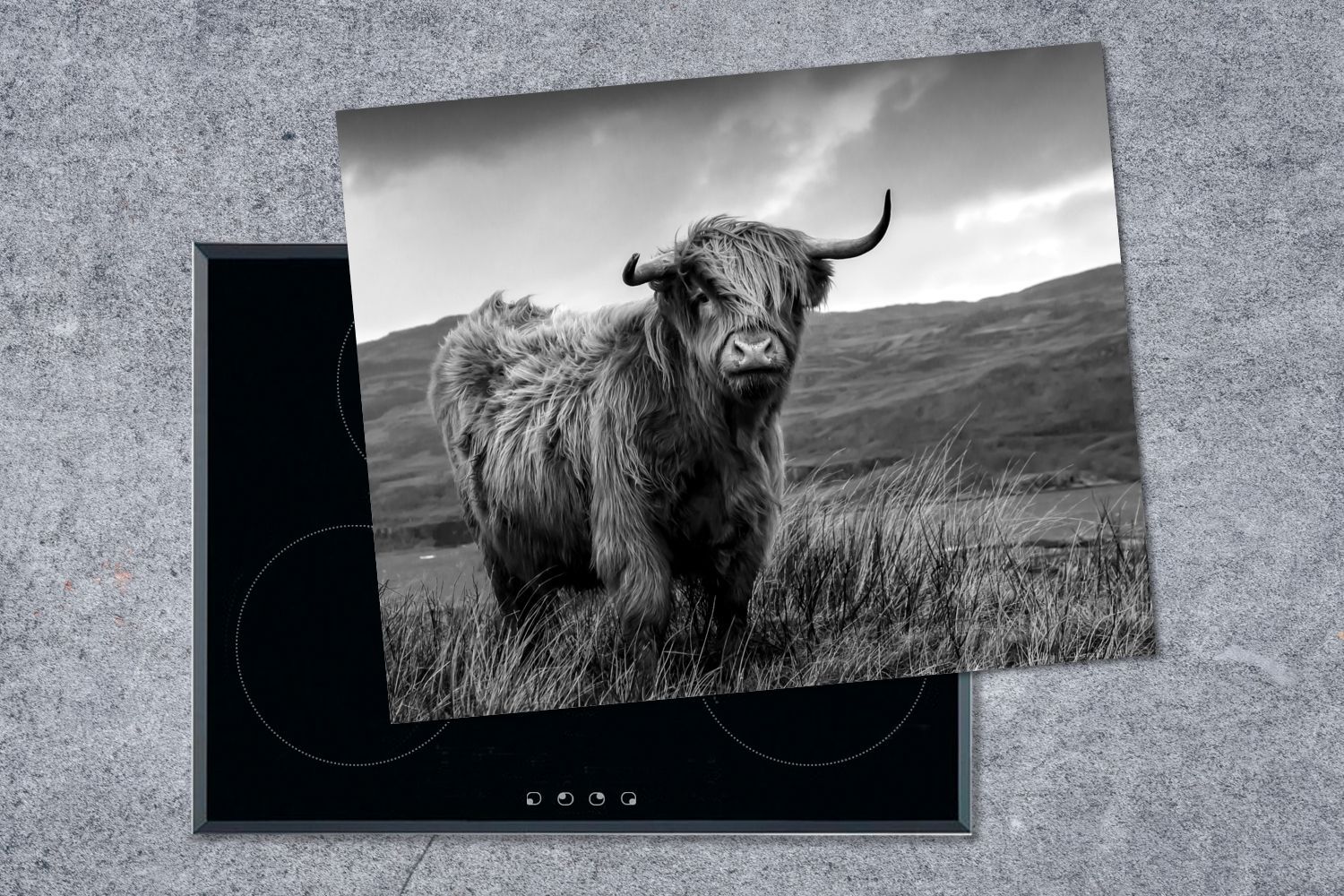 Herdabdeckplatte - 65x52 cm - Schottischer Highlander auf schottischer Insel - schwar
