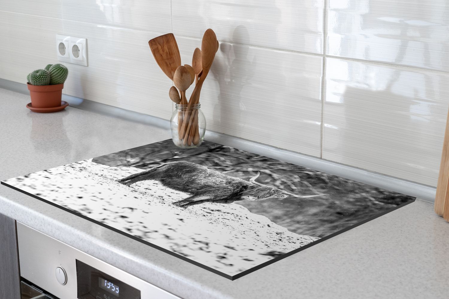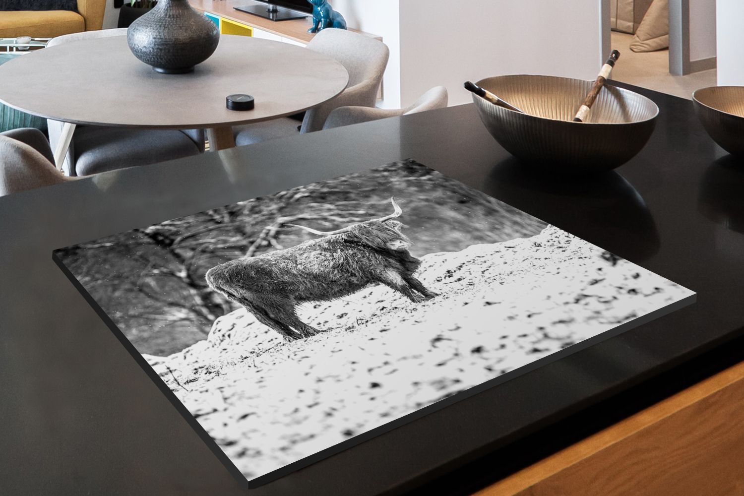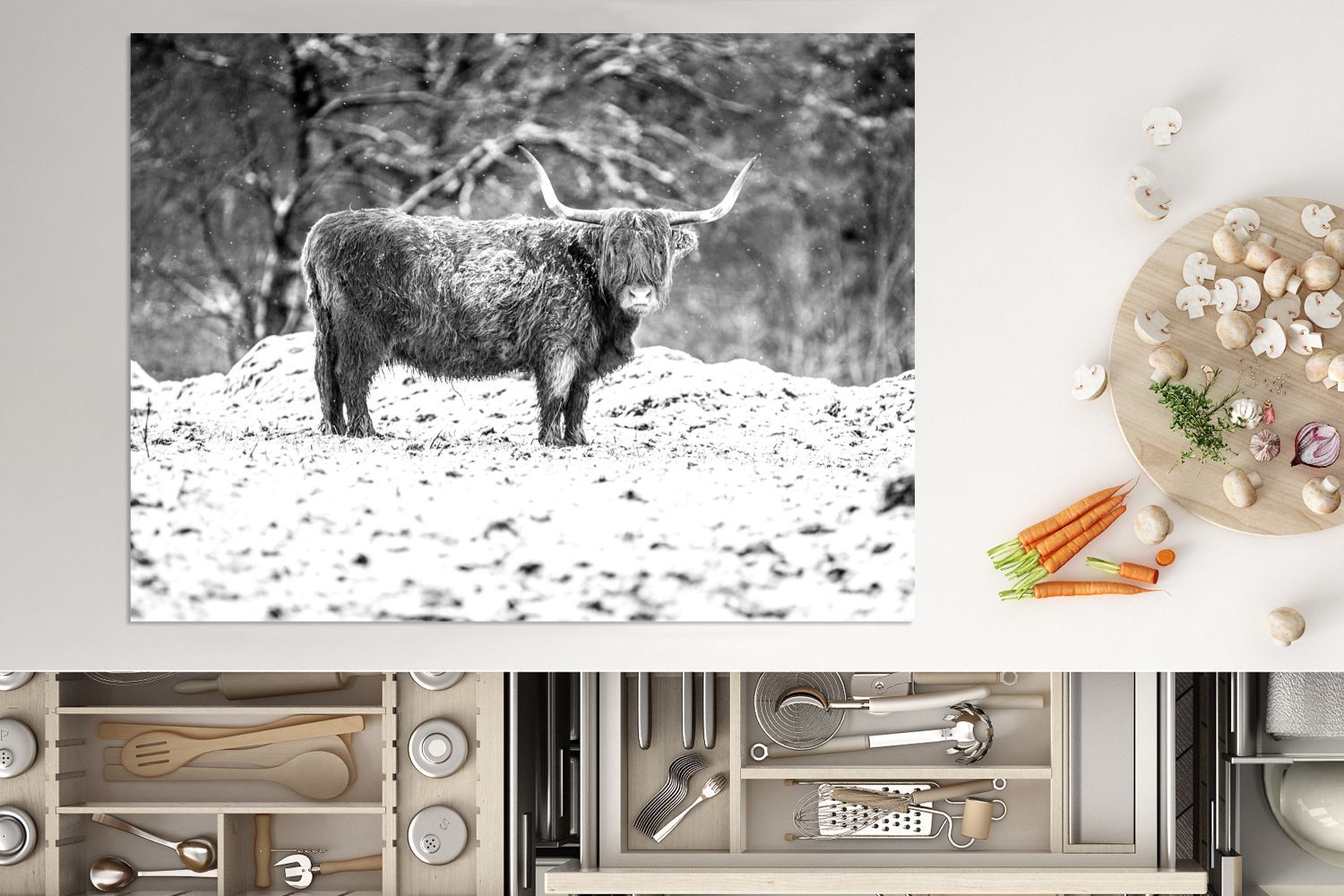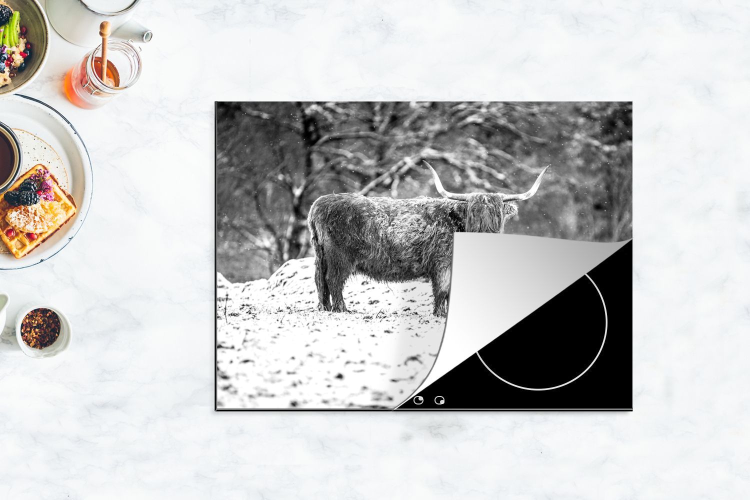 Herdabdeckplatte - 70x52 cm - Schottischer Highlander im verschneiten Wald - schwarz
