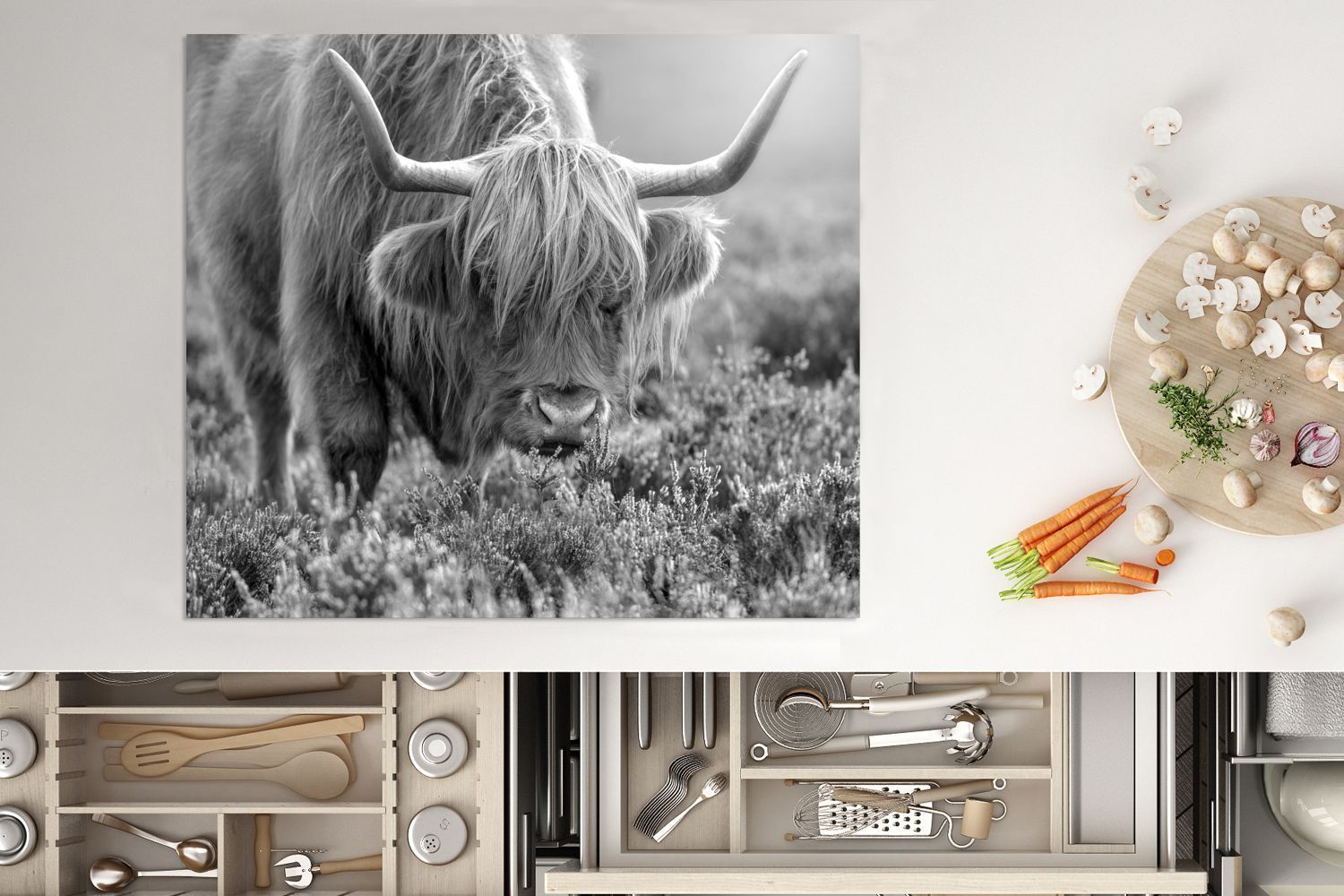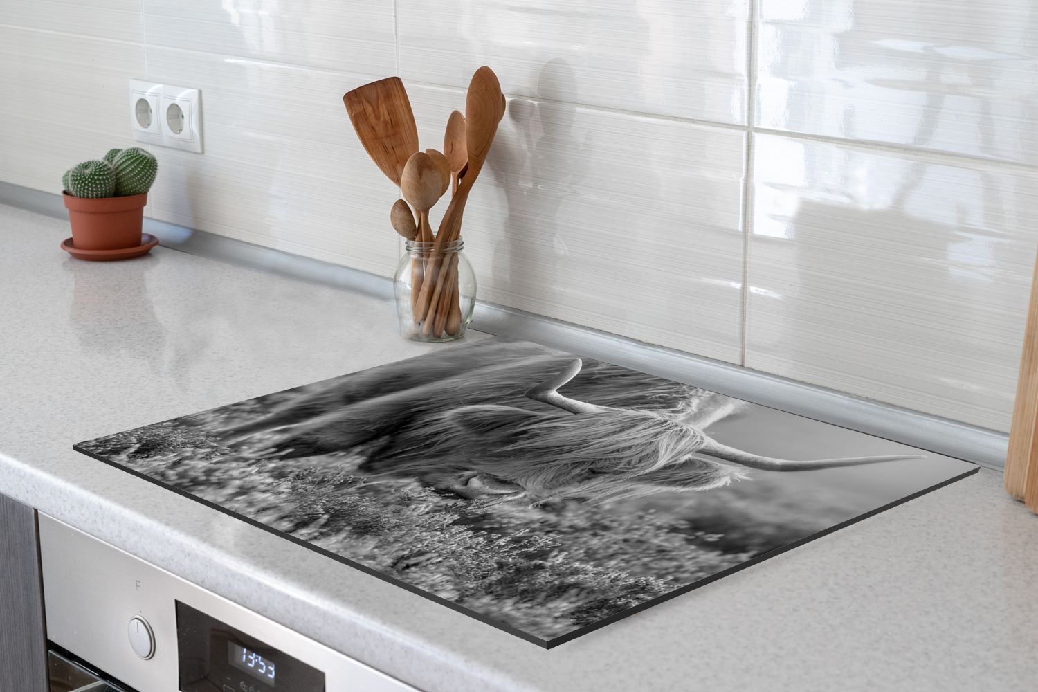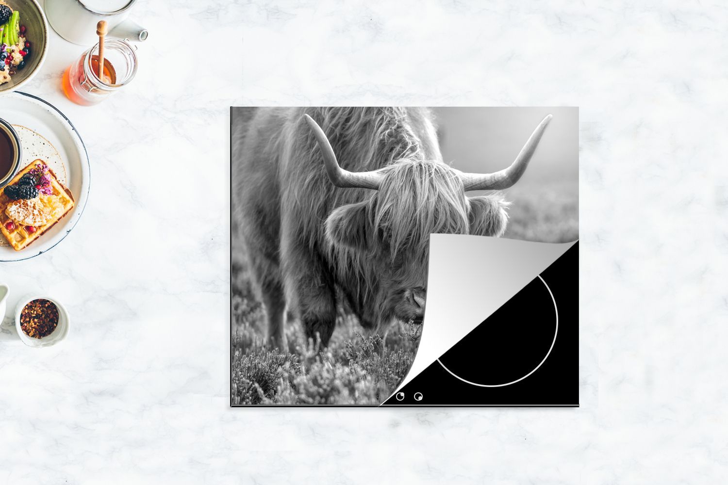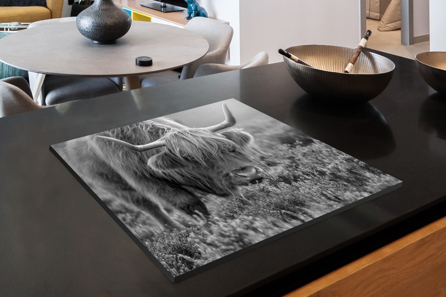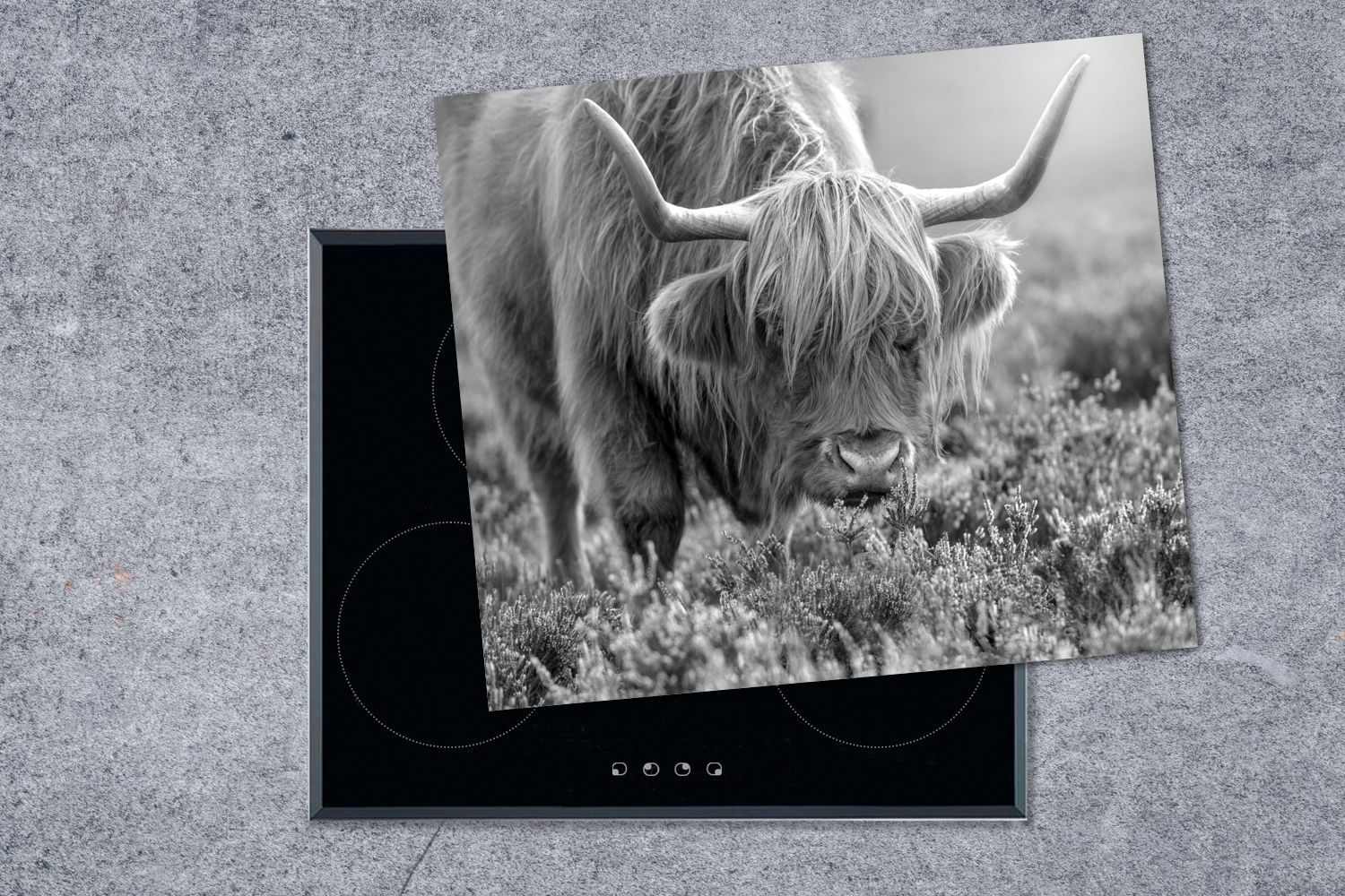 Herdabdeckplatte - 75x52 cm - Weidender schottischer Highlander - schwarz und weiß