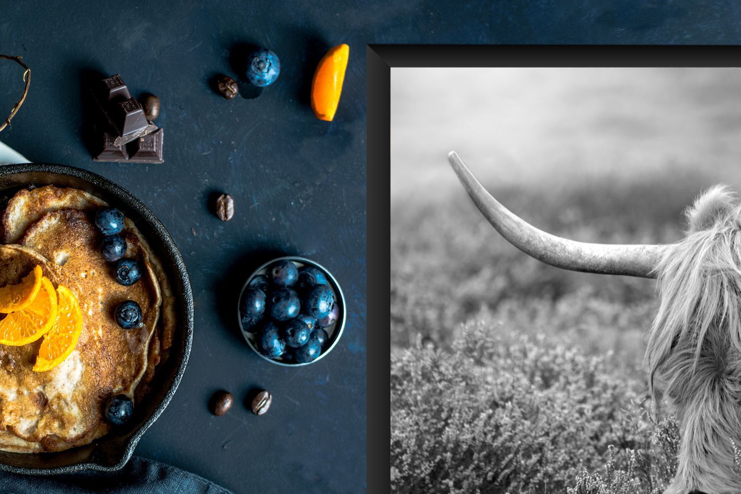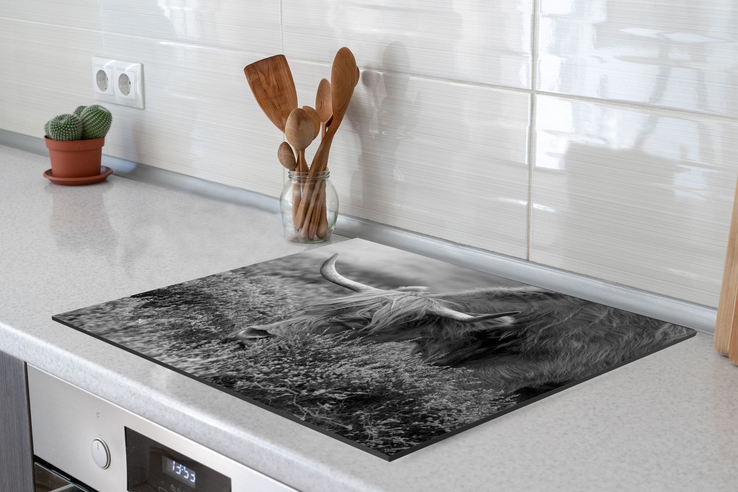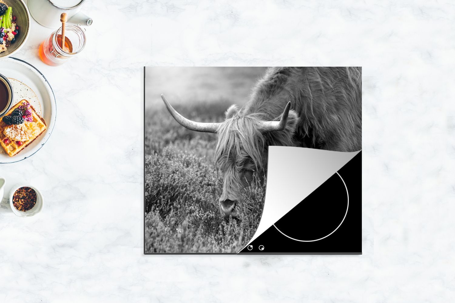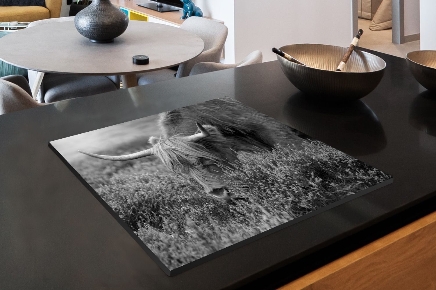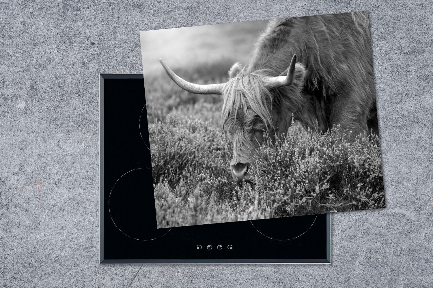 Herdabdeckplatte - 75x52 cm - Weidender schottischer Highlander - schwarz und weiß