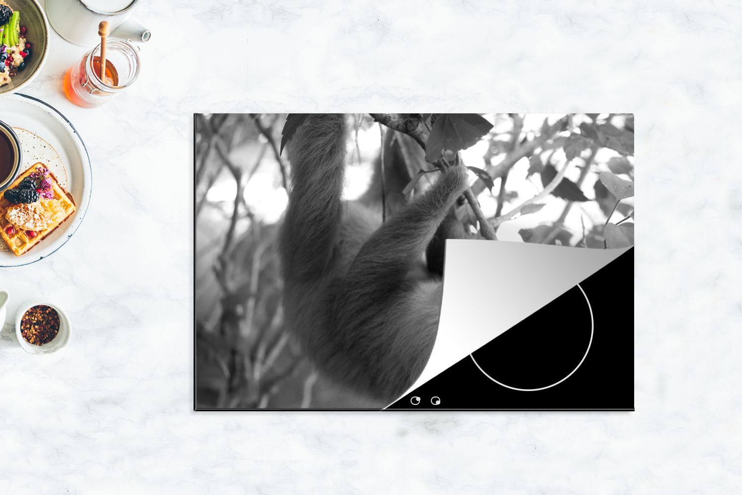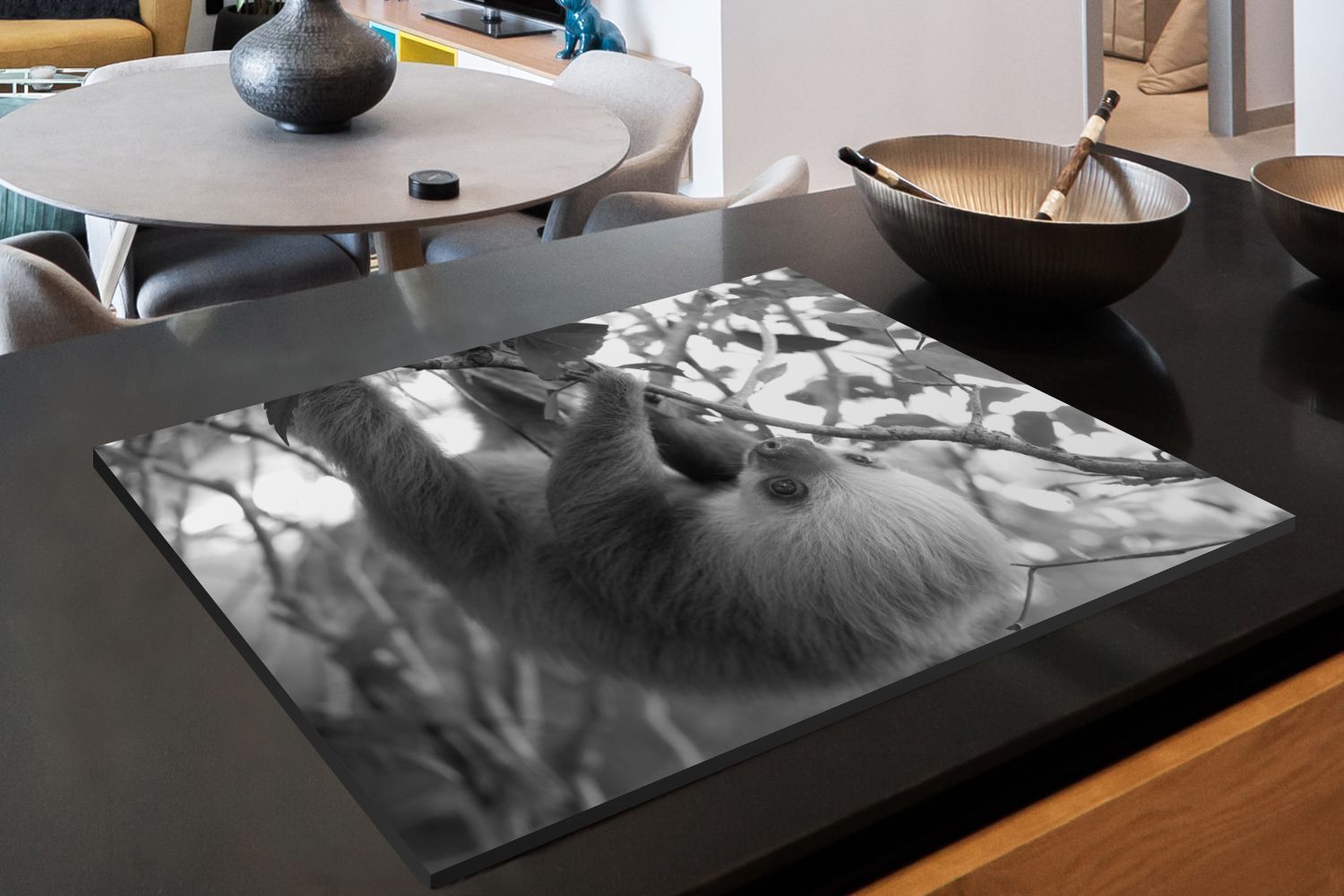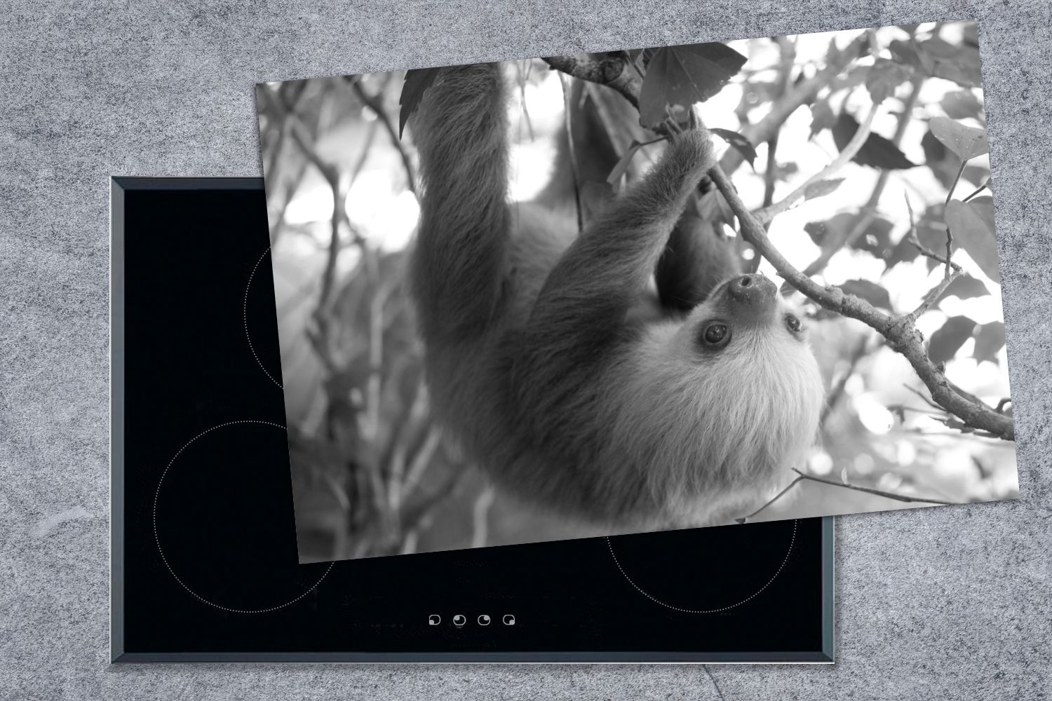 Herdabdeckplatte - 78x52 cm - Baby-Faultier im Regenwald von Costa Rica in schwarz un
