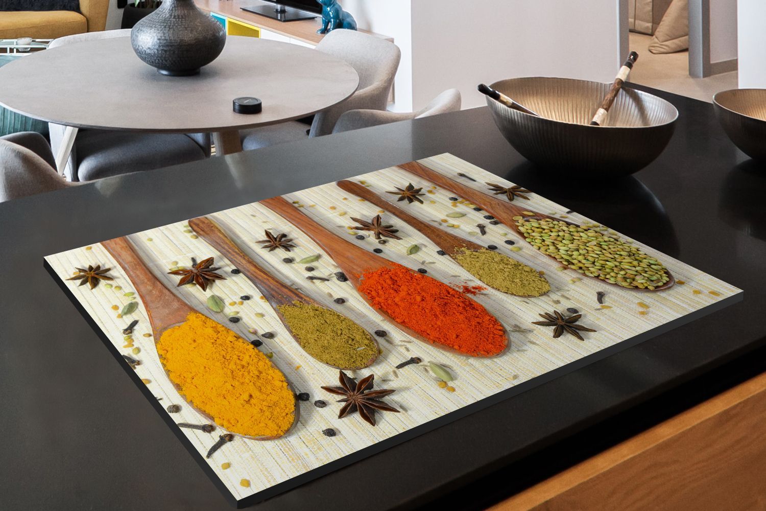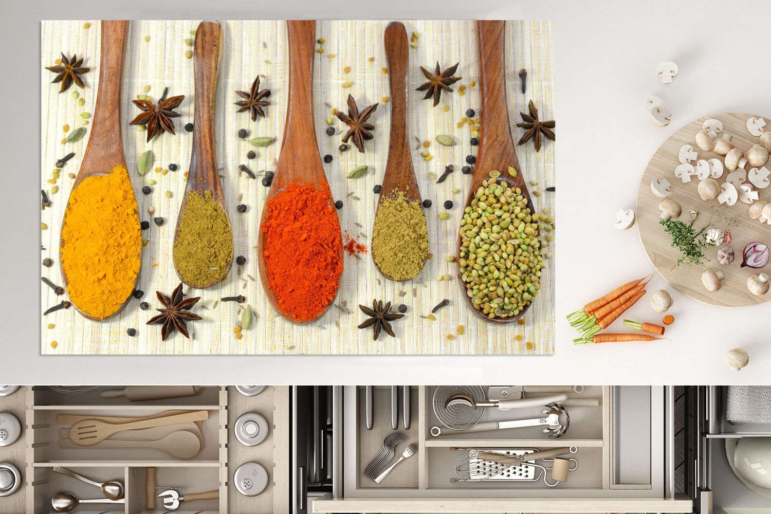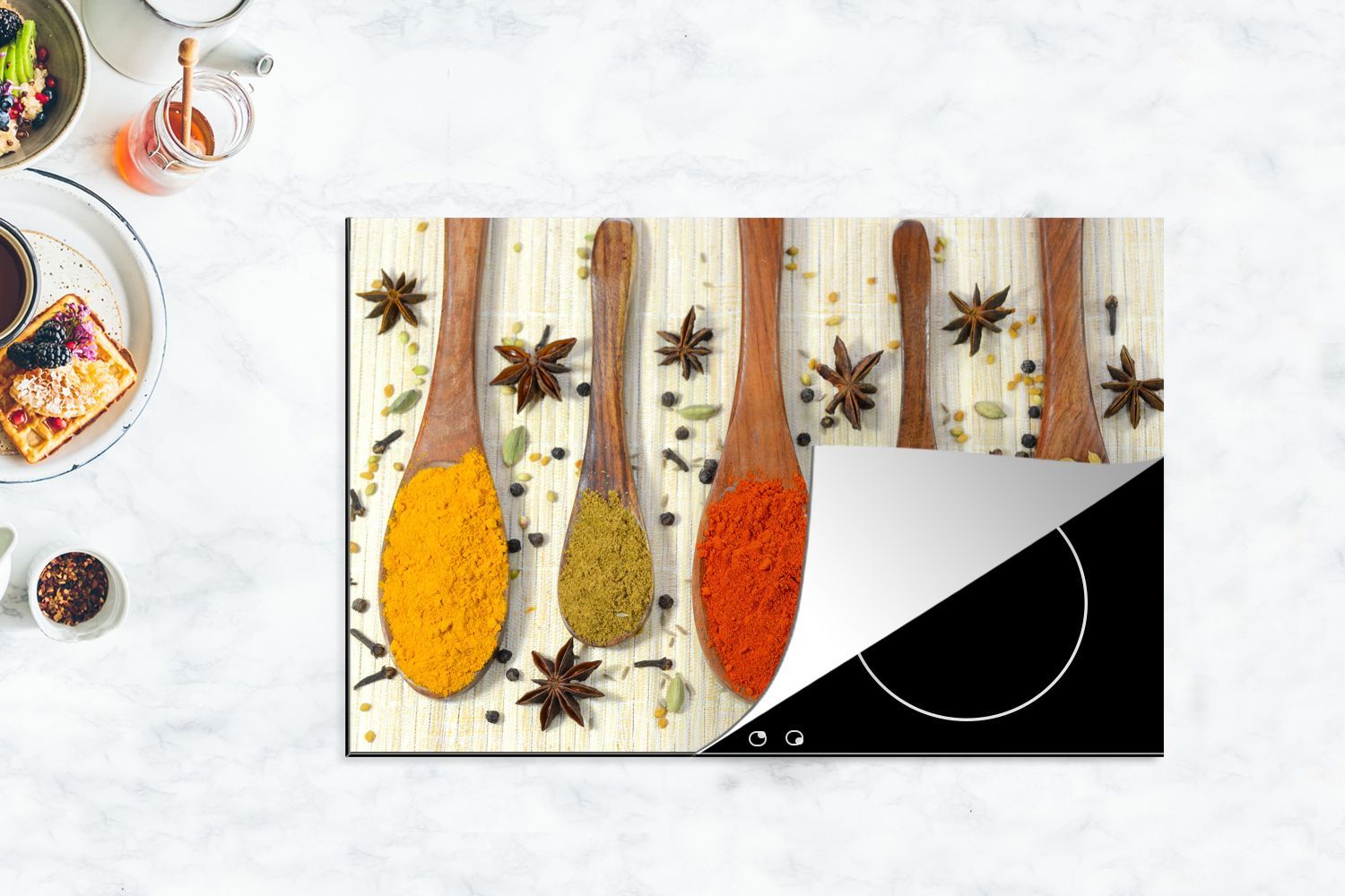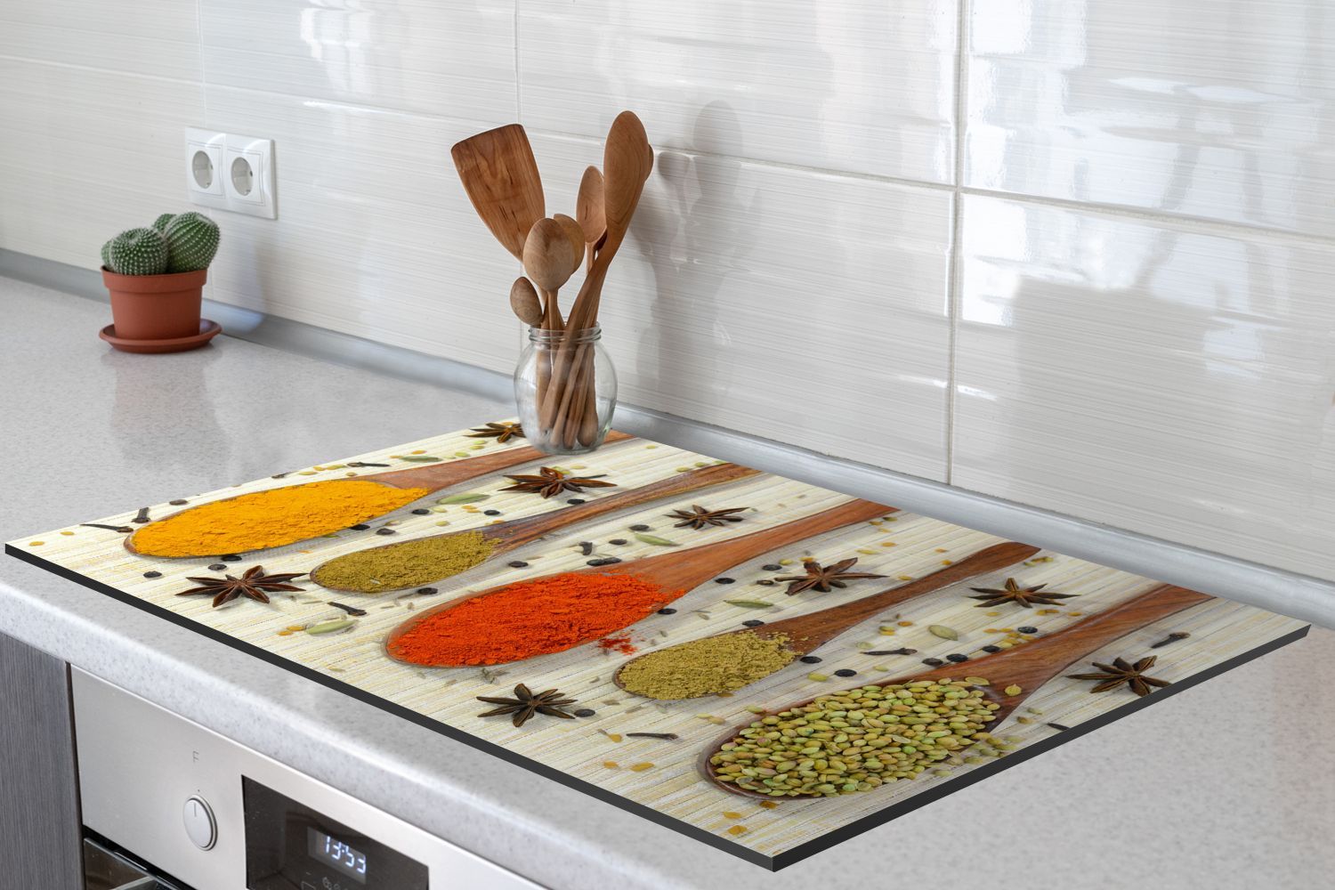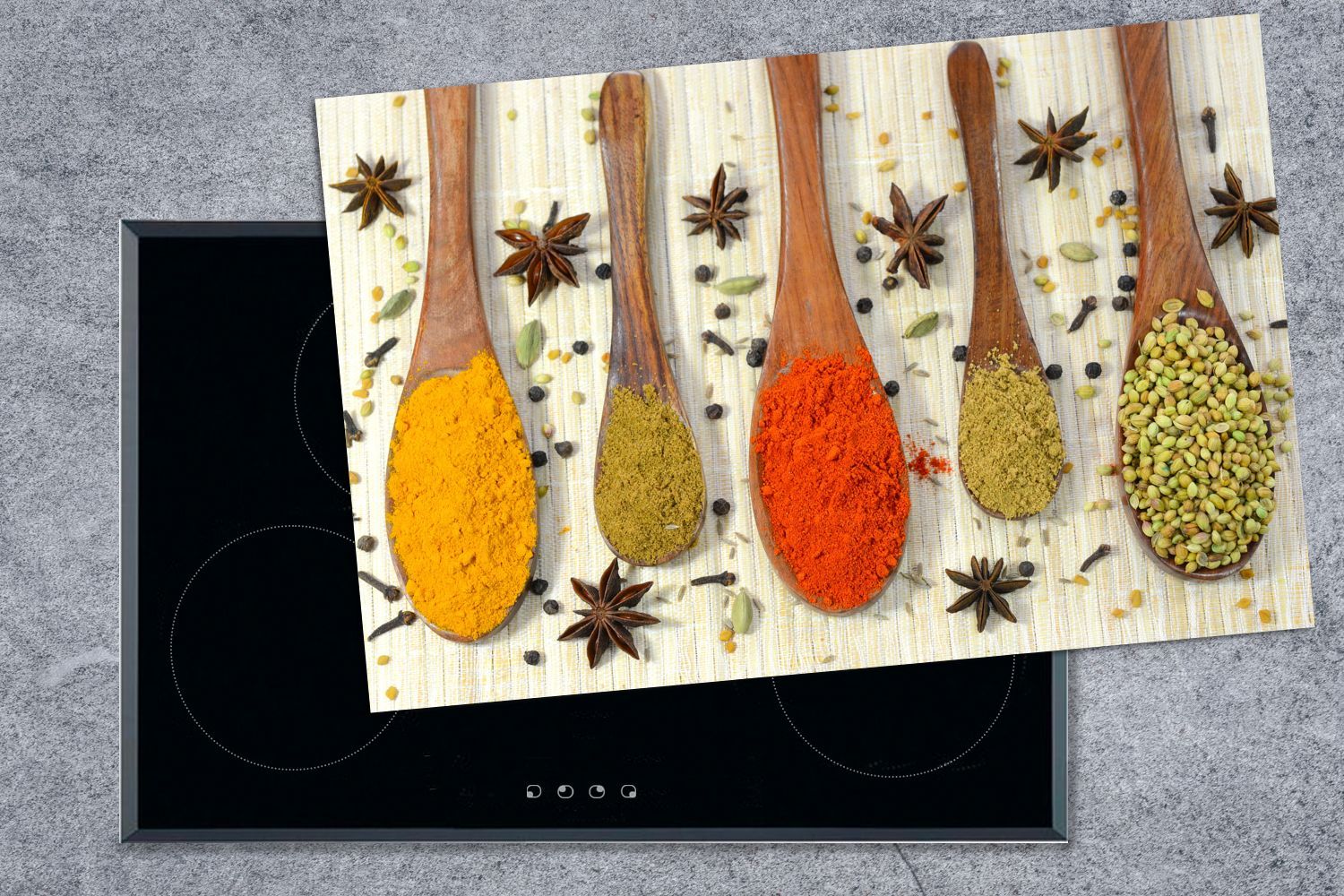 Herdabdeckplatte - 80x52 cm - Bunte Kräuter auf einem Holzlöffel