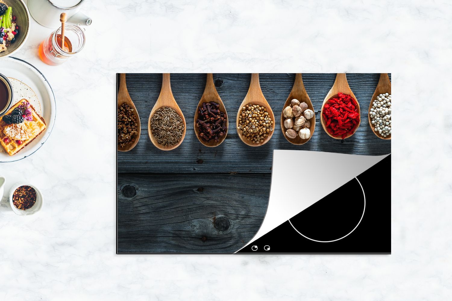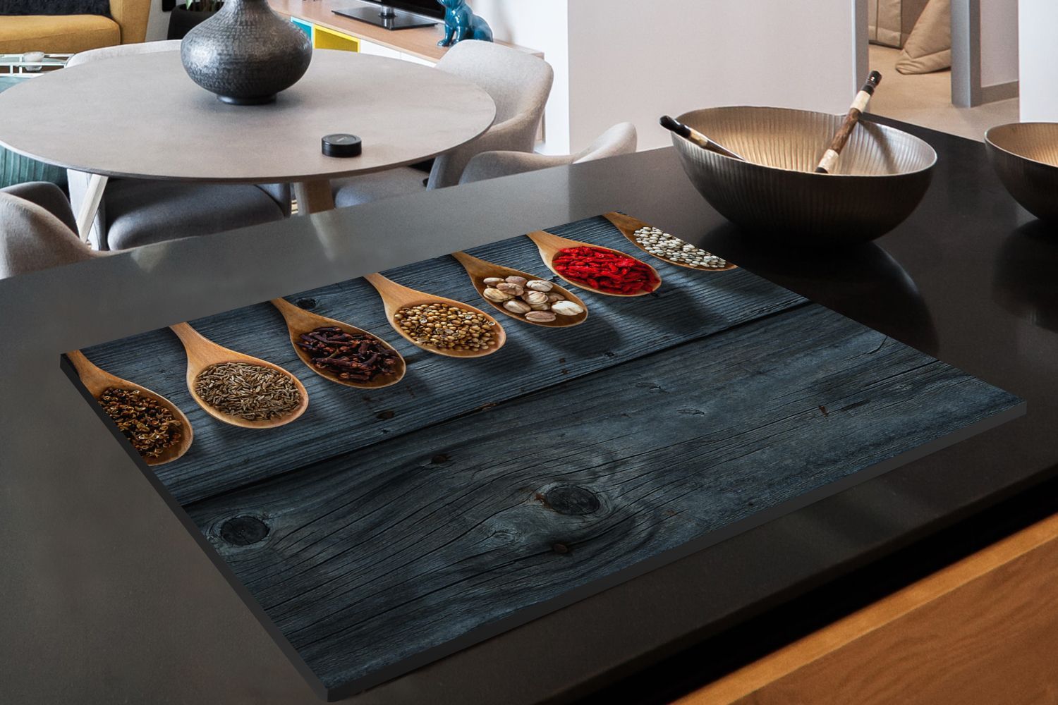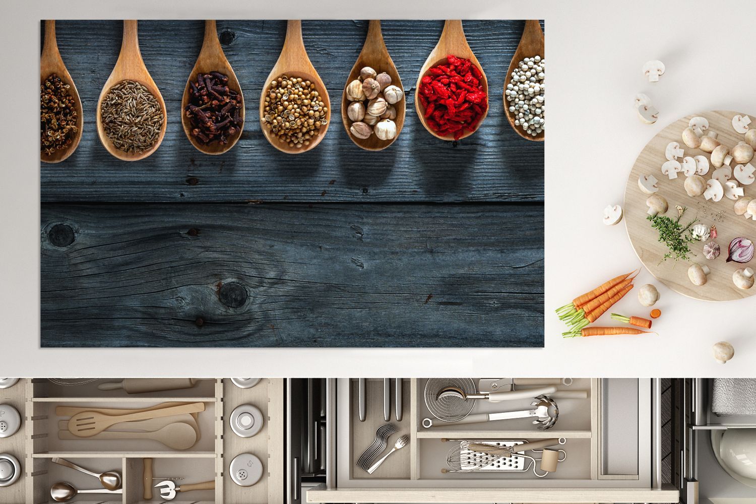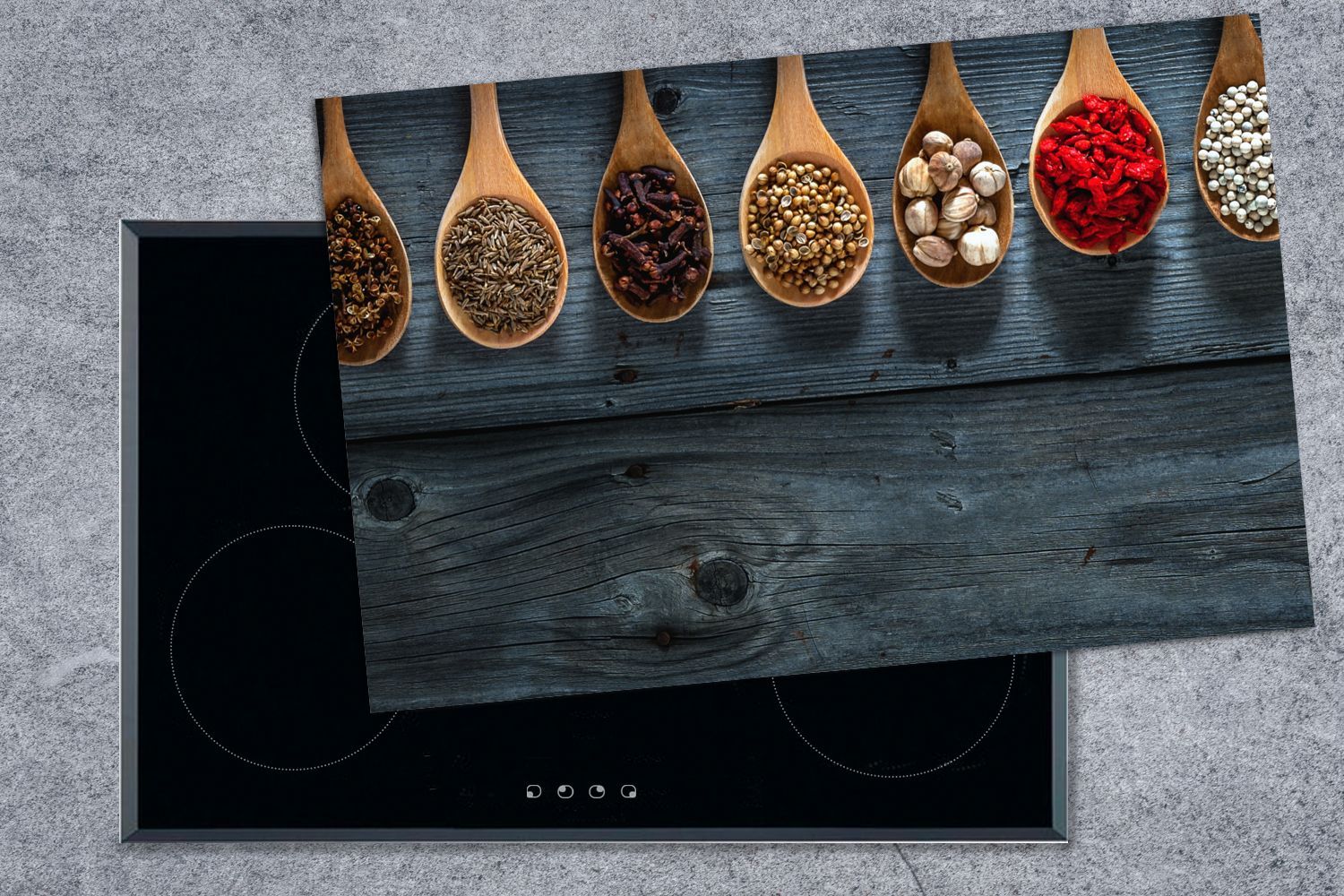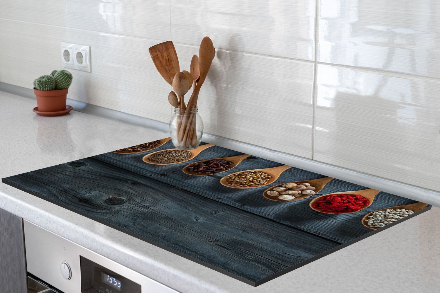 Herdabdeckplatte - 80x52 cm - Kräuter auf Löffeln auf einem hölzernen Hintergrund