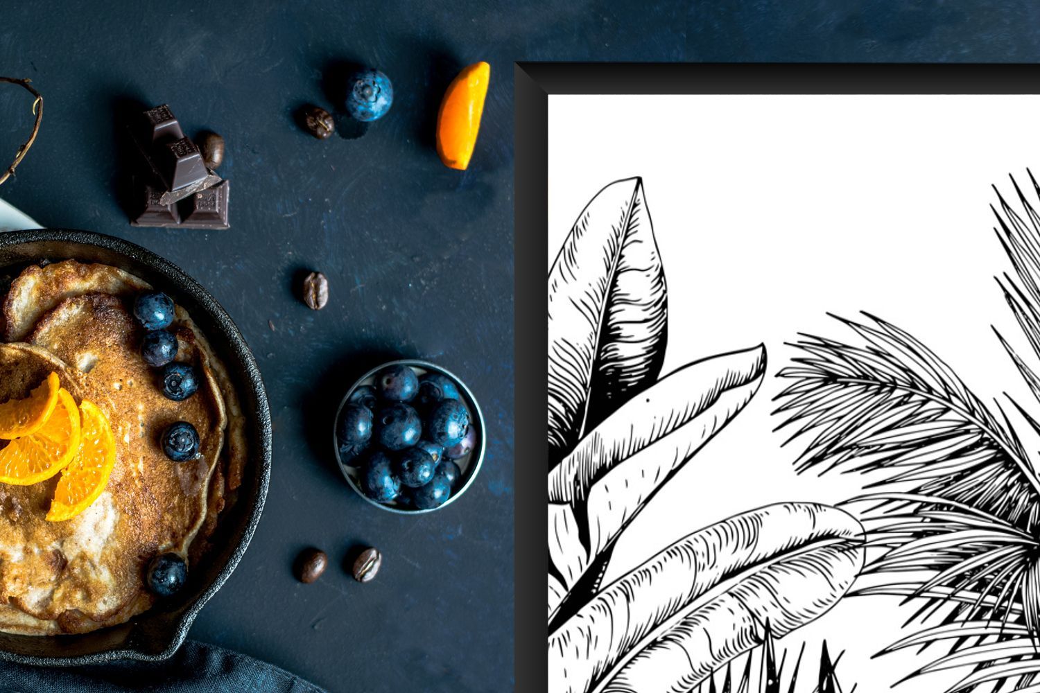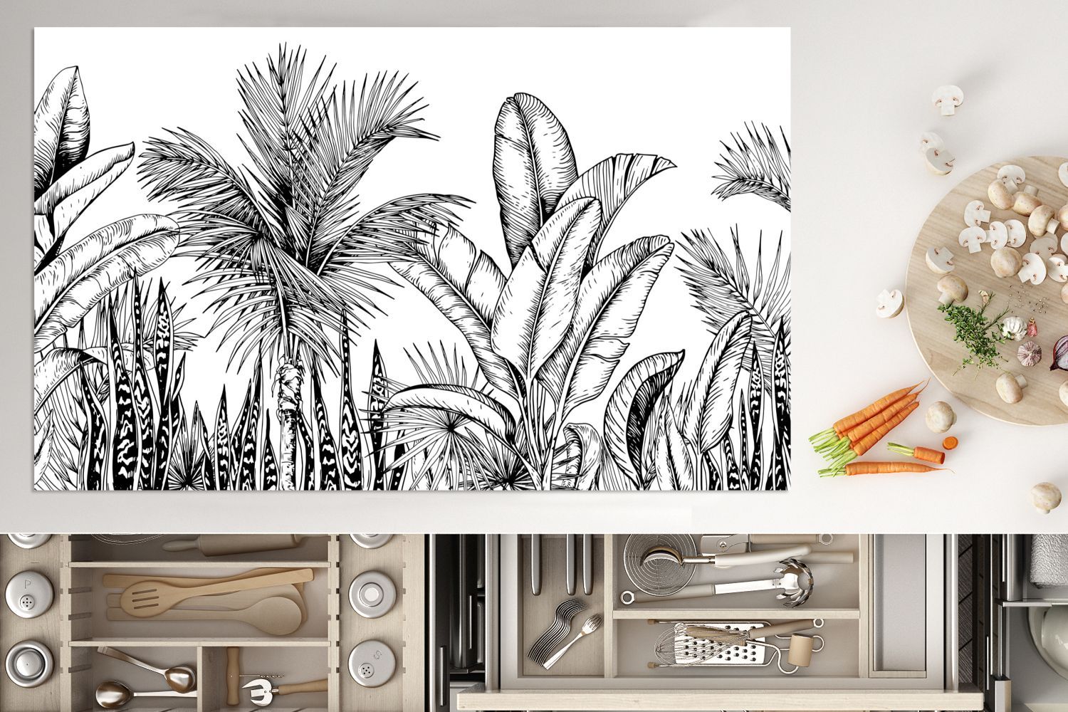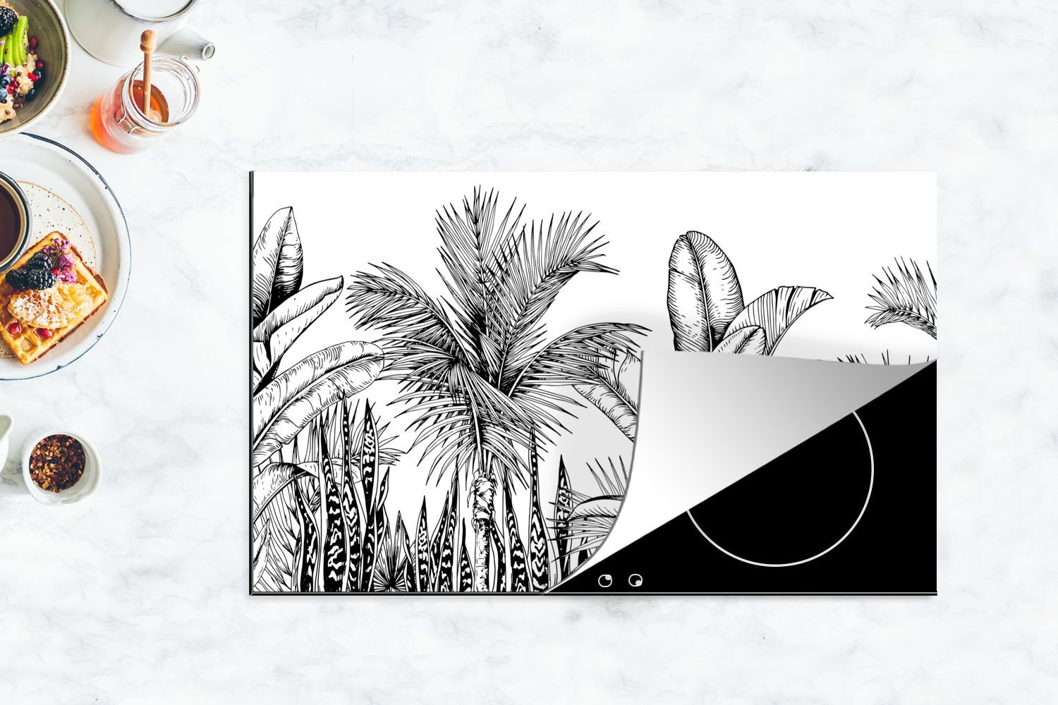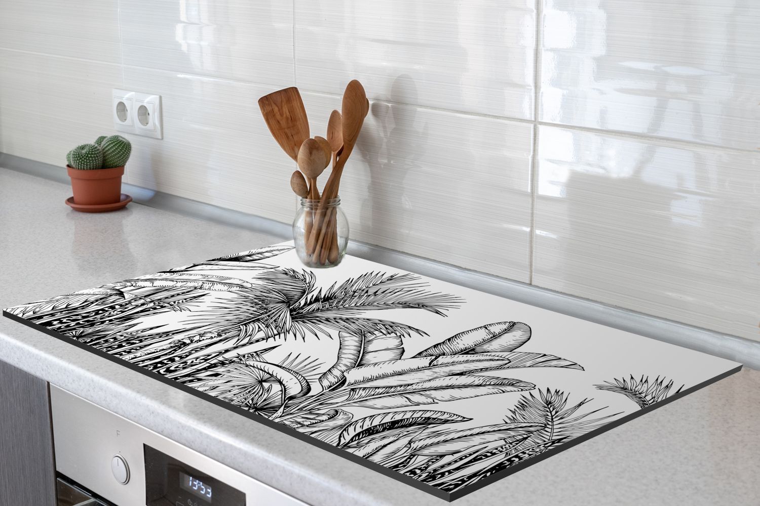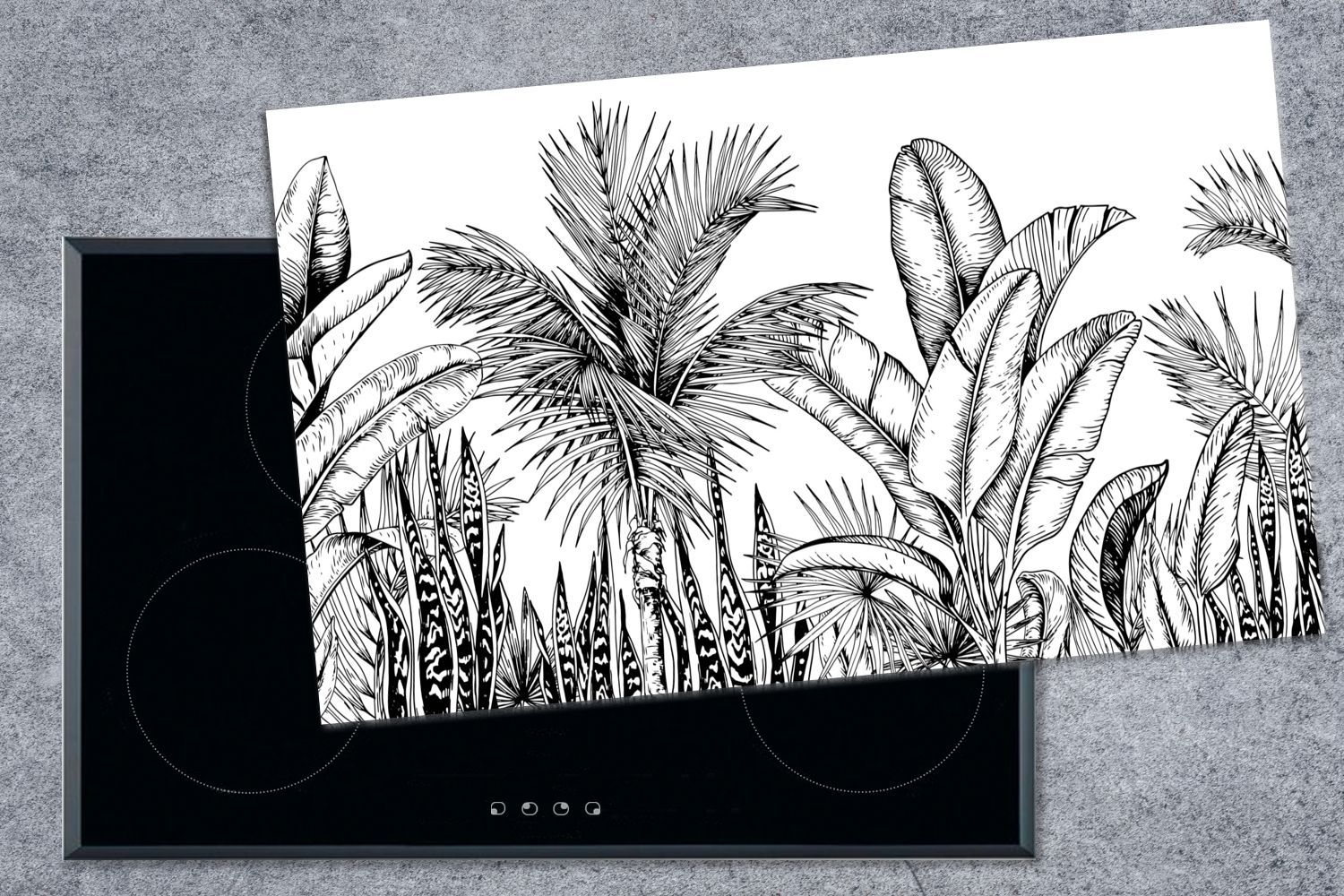 Herdabdeckplatte - 90x52 cm - Blätter - Illustration - Schwarz - Weiß