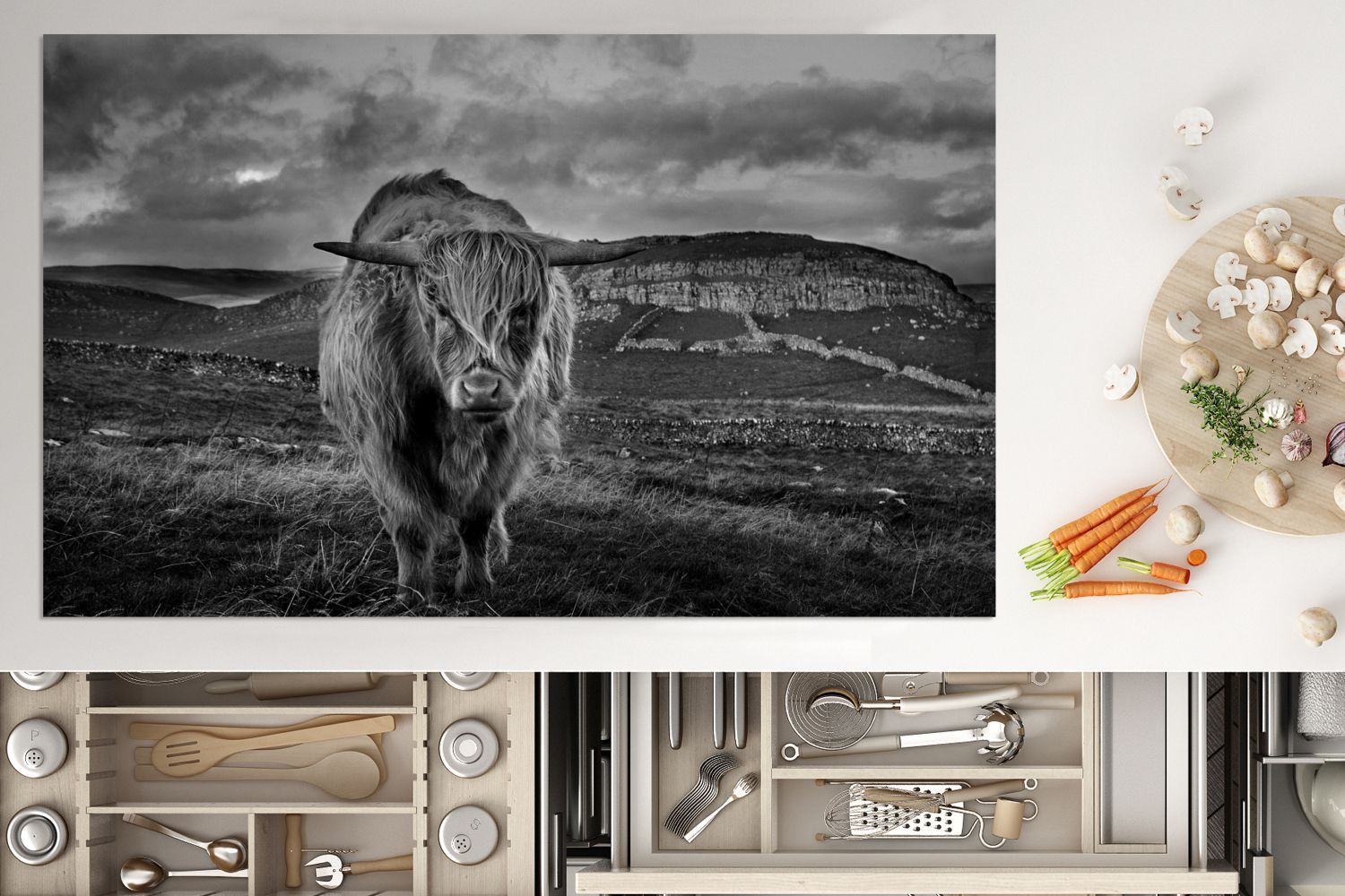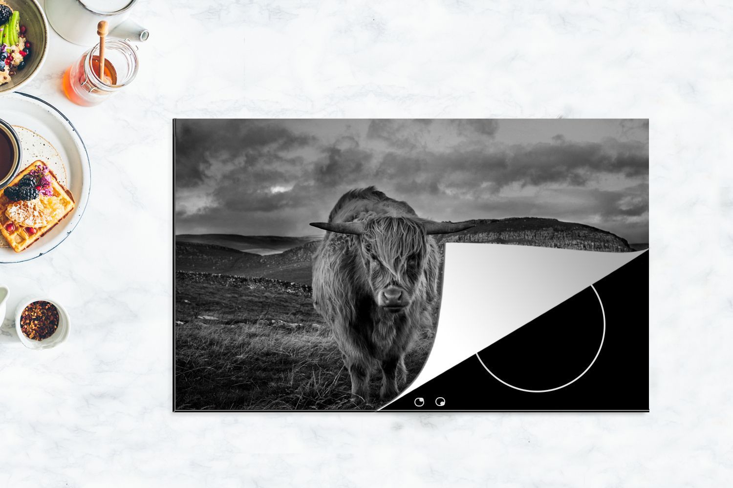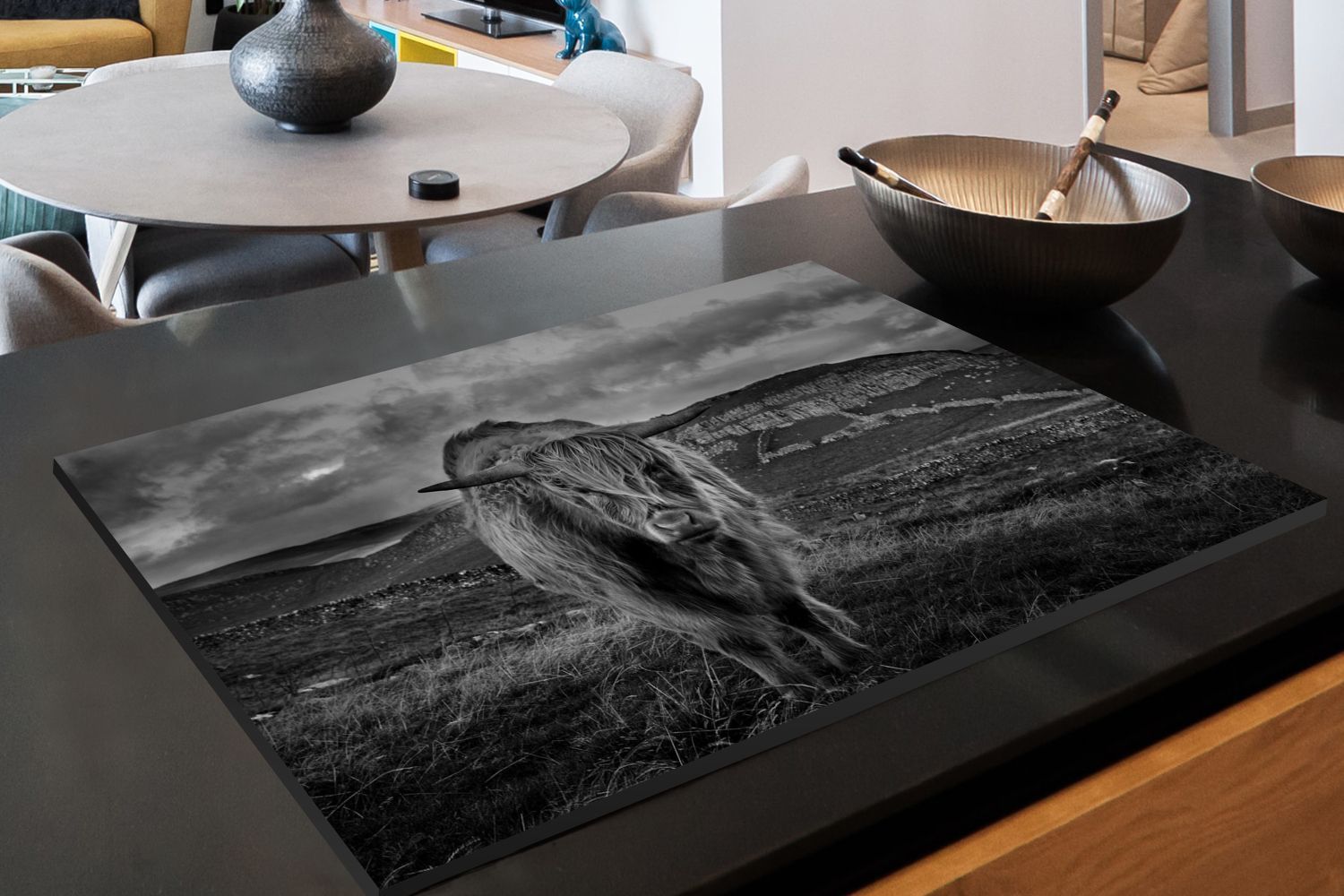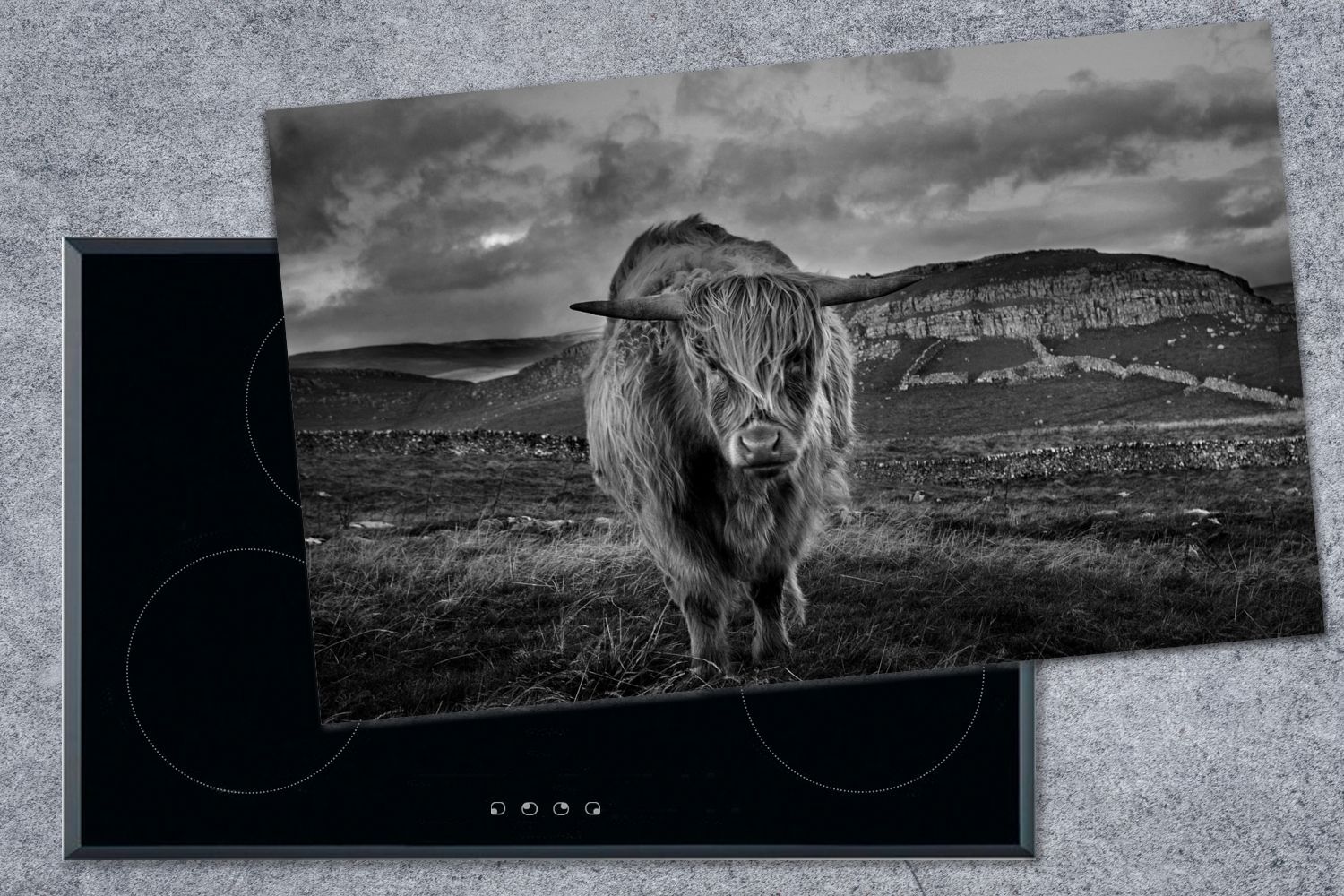 Herdabdeckplatte - 90x52 cm - Haariger schottischer Highlander in der Heide - schwarz