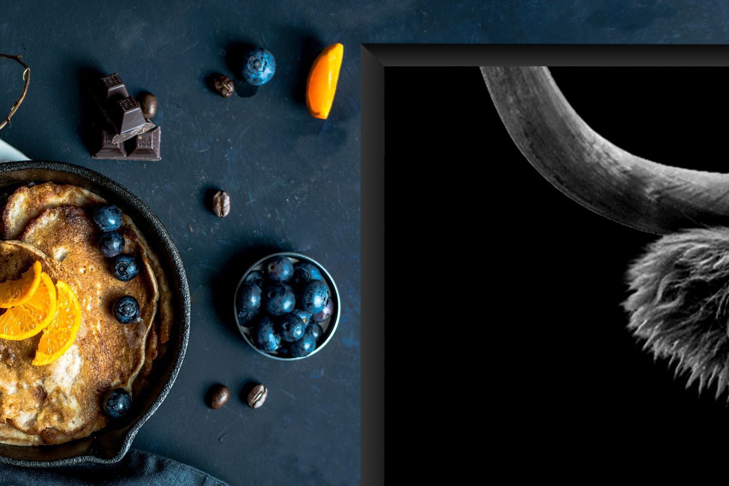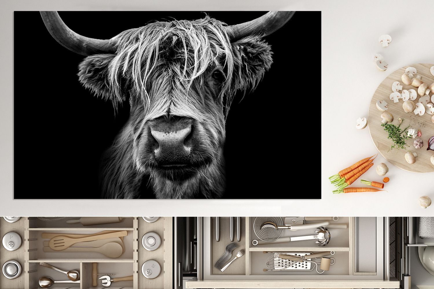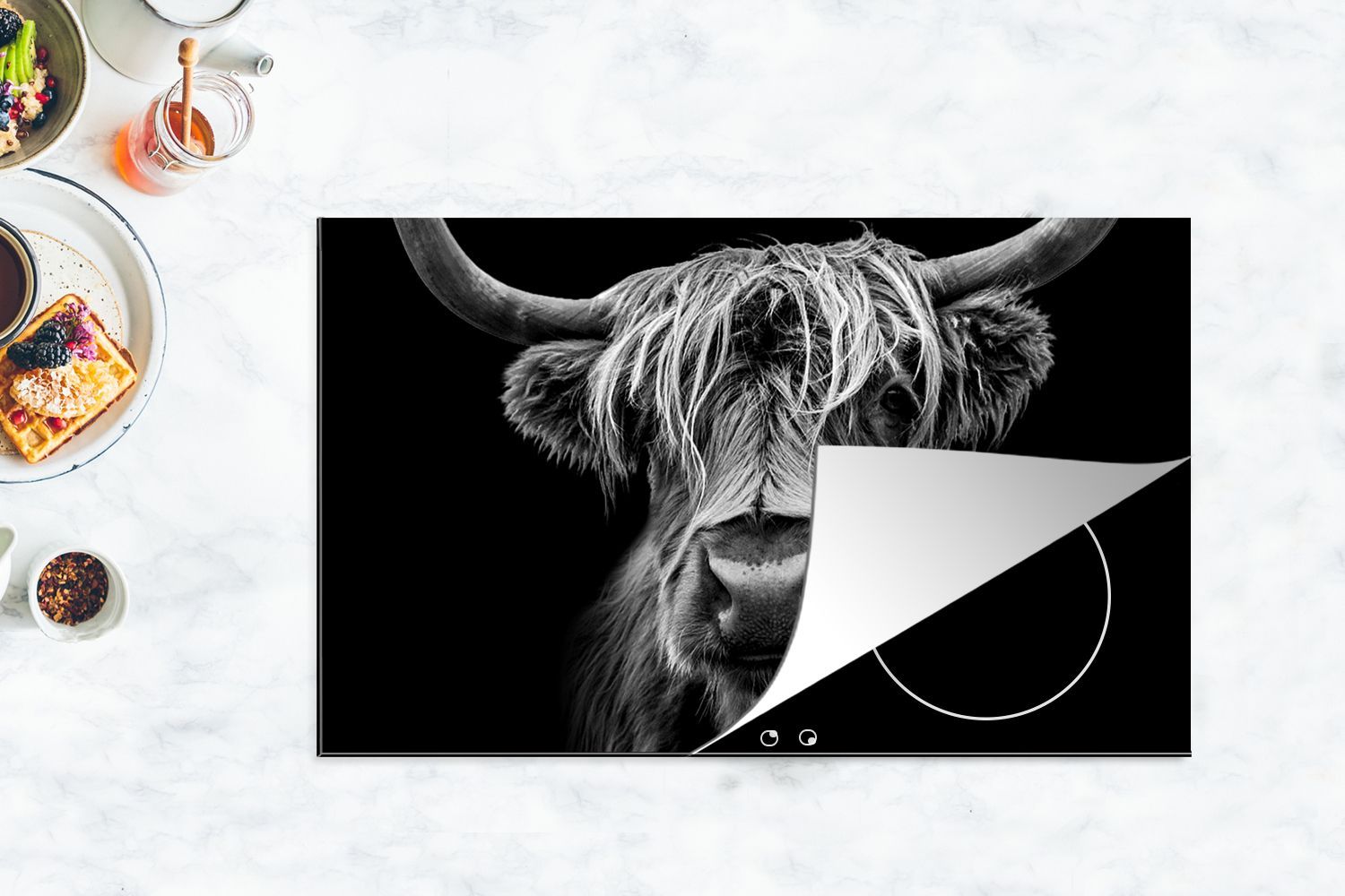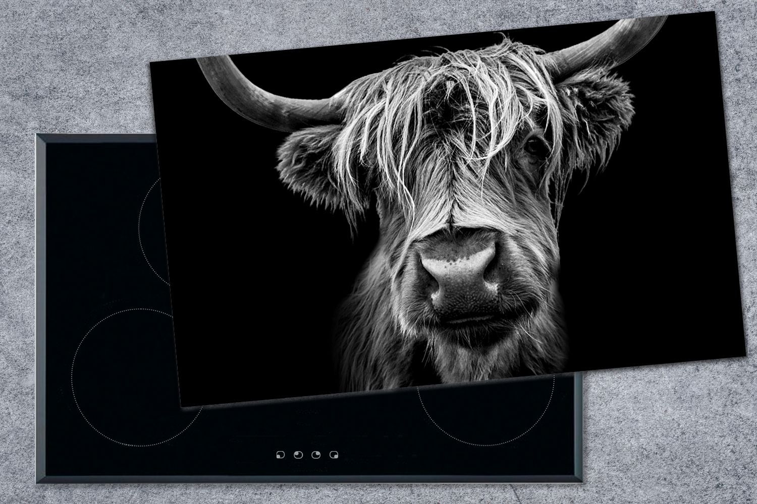 Herdabdeckplatte - 90x52 cm - Nahaufnahme eines schottischen Highlanders in schwarz-w