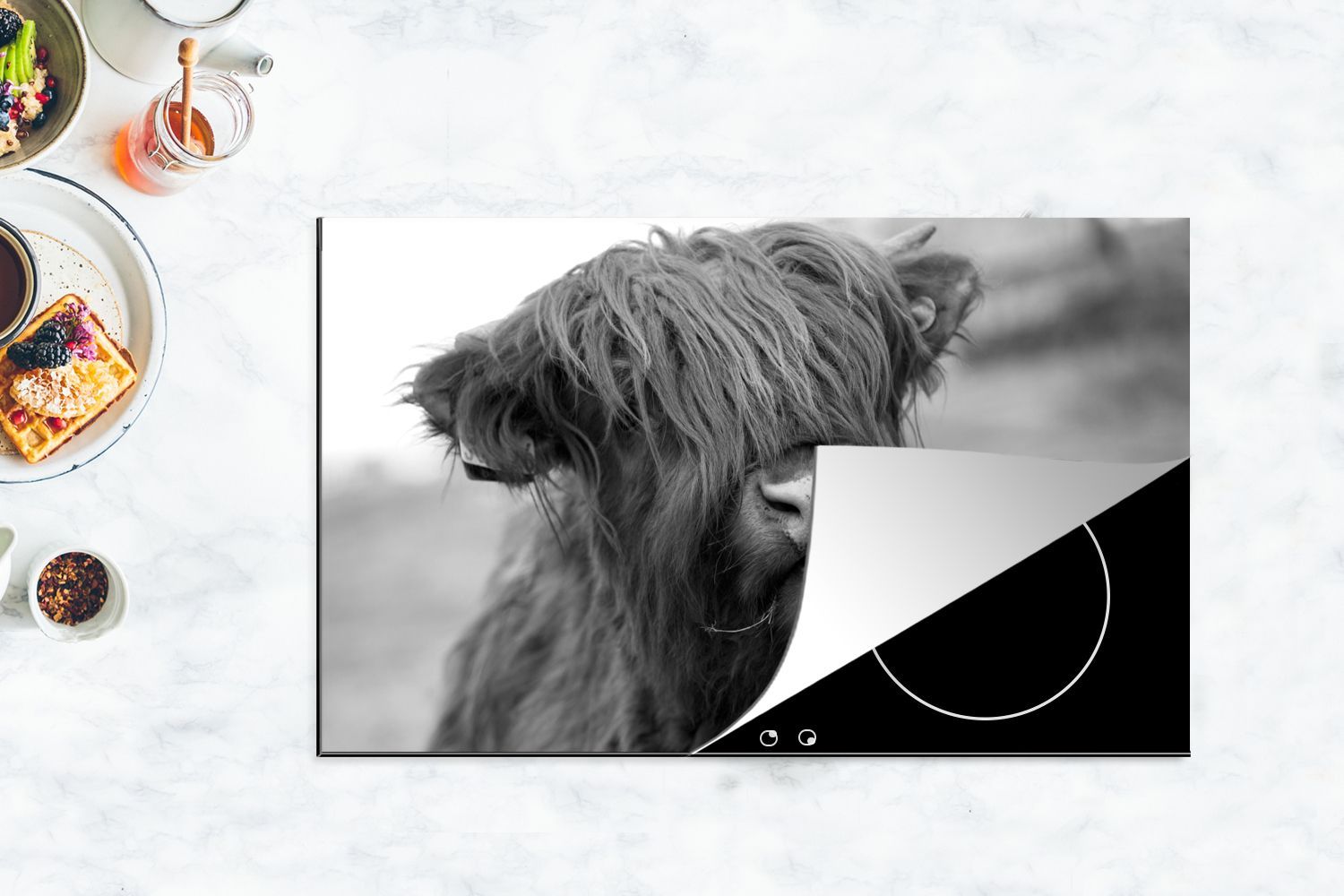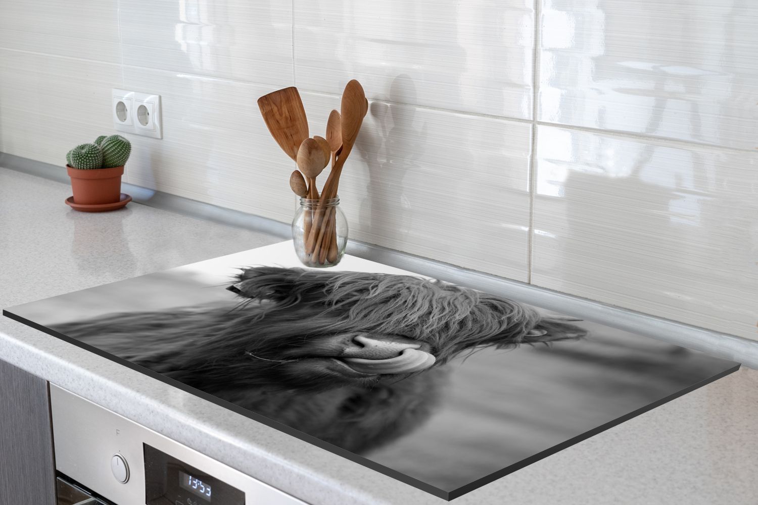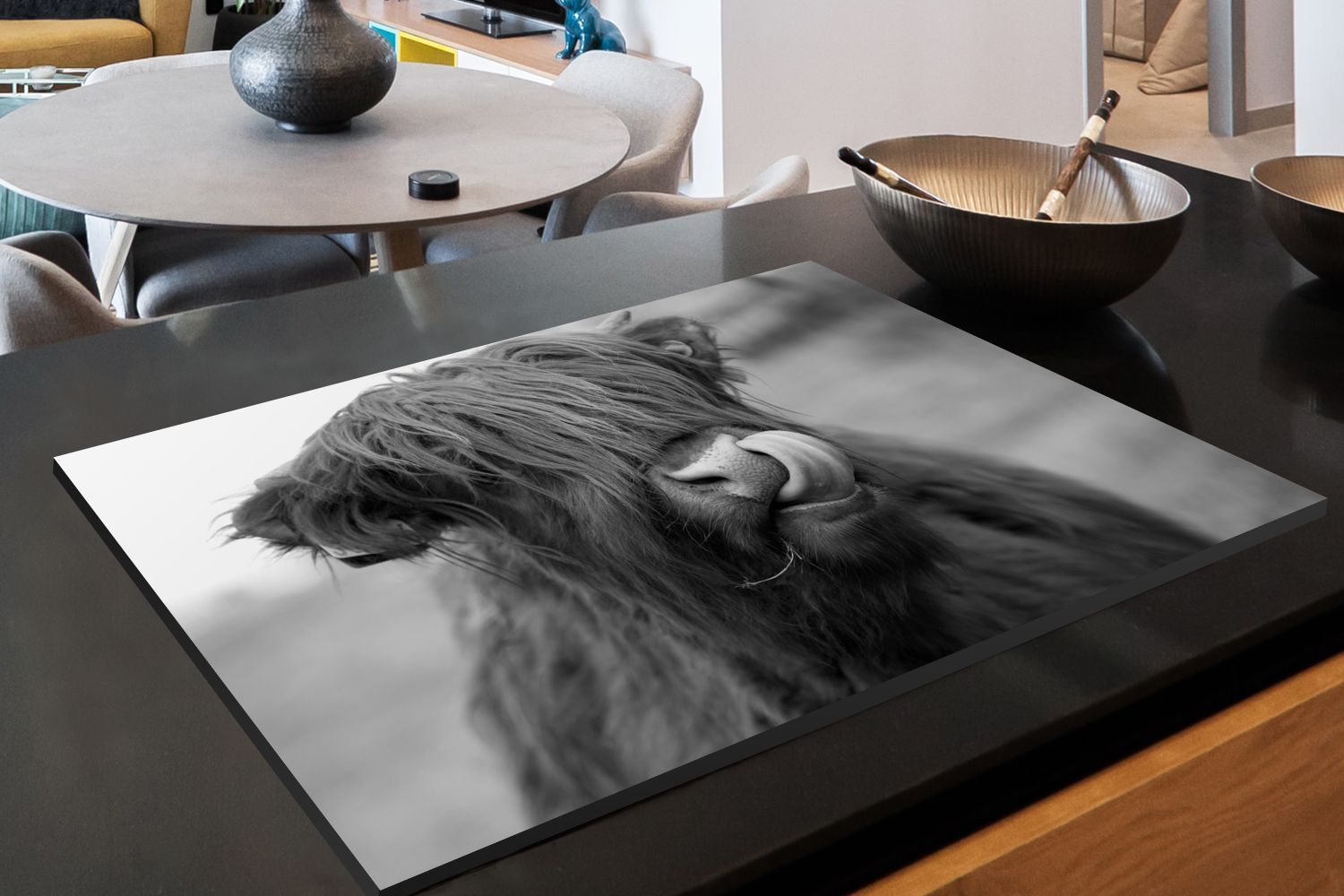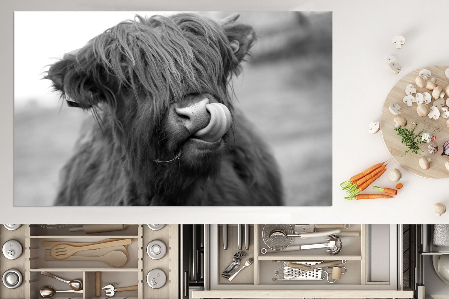 Herdabdeckplatte - 90x52 cm - Schottischer Highlander leckt sich die Lippen - schwarz
