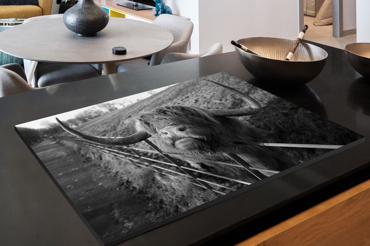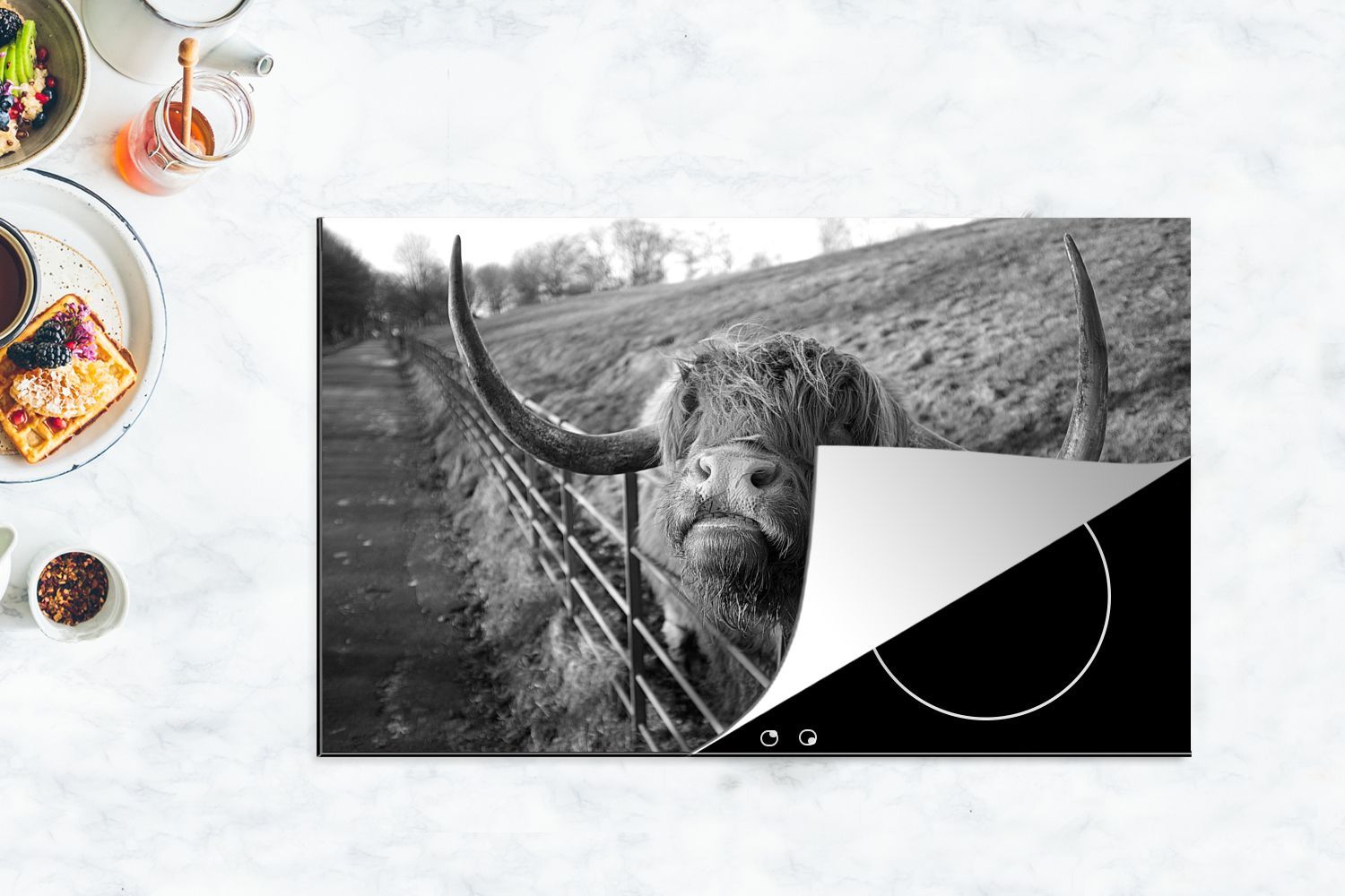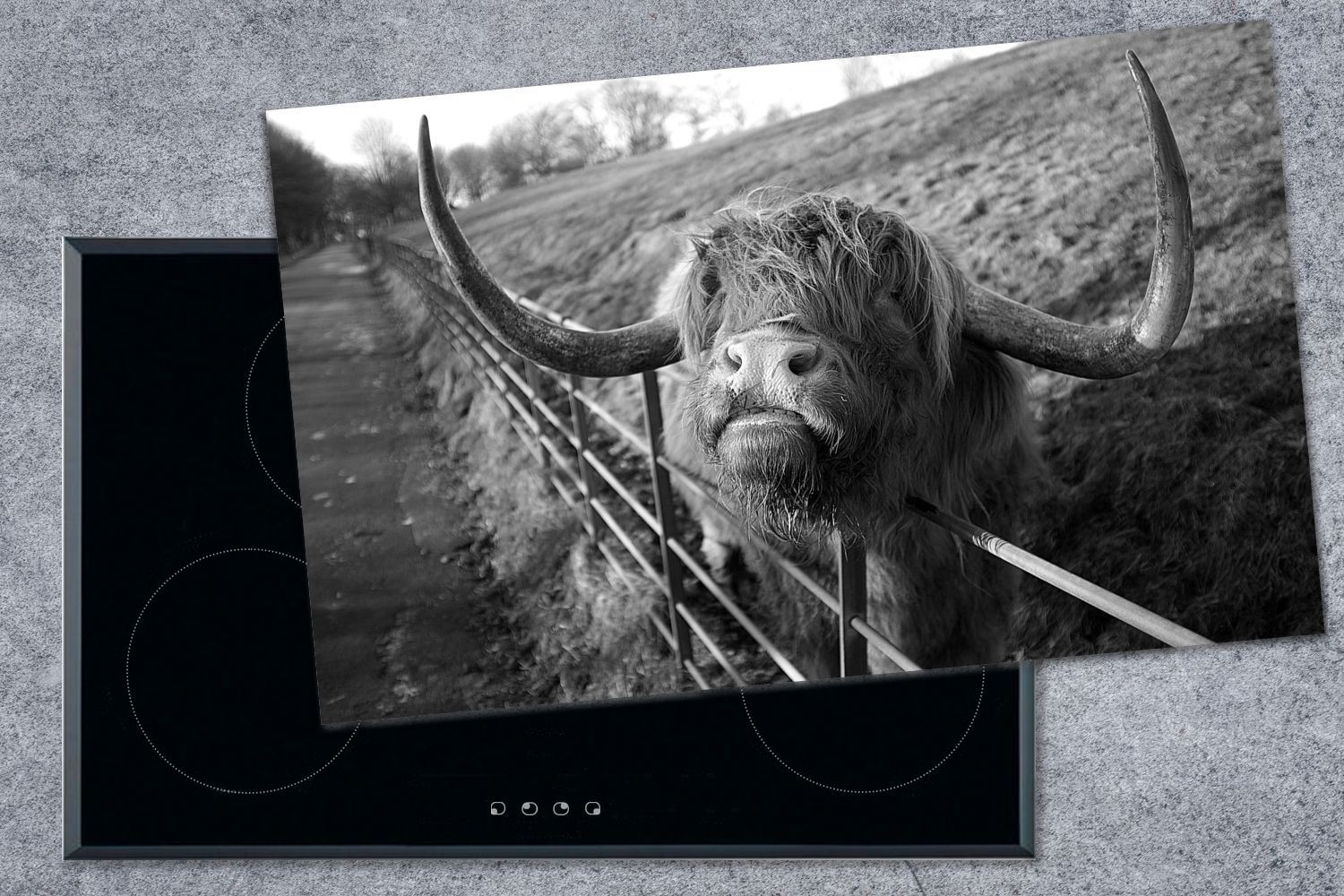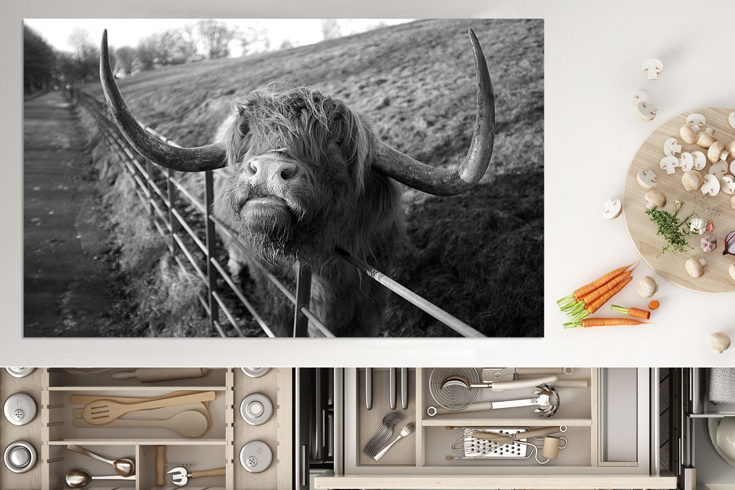 Herdabdeckplatte - 90x52 cm - Schottischer Highlander über den Zaun im Heaton Park -
