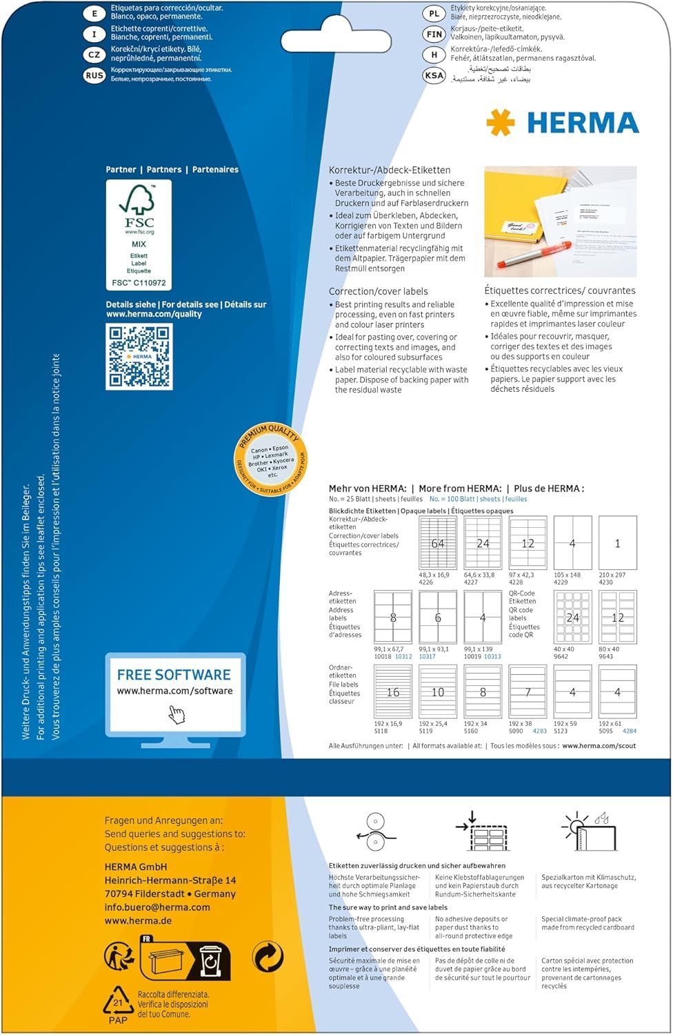 HERMA 4227 Korrekturetiketten blickdicht, 25 Blatt, 64,6 x 33,8 mm, 24 pro A4 Bogen, 600 Stück, selbstklebend, bedruckbar, matt, blanko Papier Abdeckaufkleber Etiketten, weiß Farbe weiß Größe 64,6 x 33,8 mm Material Papier Marke HERMA Oberflächentyp Klebstoff Info zu diesem Artikel Zum Überkleben, A... Mehr