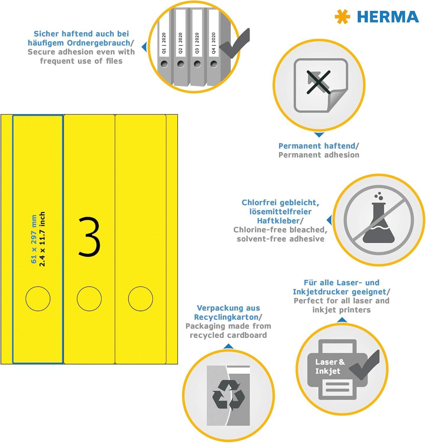 Herma HERMA 5136 Ordnerrücken Etiketten lang breit, 20 Blatt, 61 x 297 mm, 3 pro A4 Bogen,