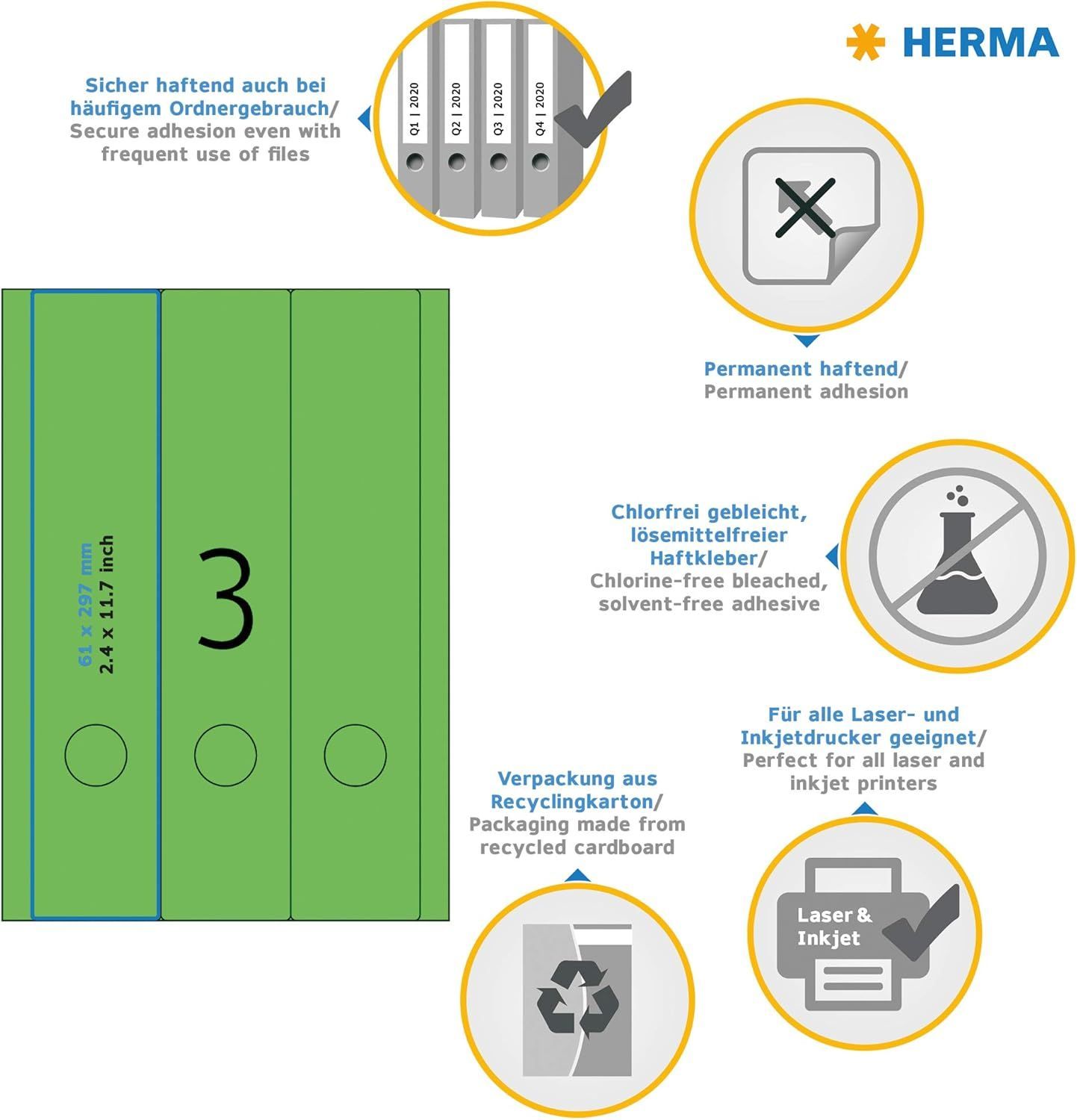 Herma HERMA 5139 Ordnerrücken Etiketten lang breit, 20 Blatt, 61 x 297 mm, 3 pro A4 Bogen,