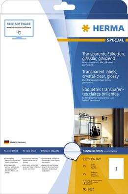 • Herma 8020 8020 Etiketten transparent glasklar A4 210x297 mm transparent klar Folie g