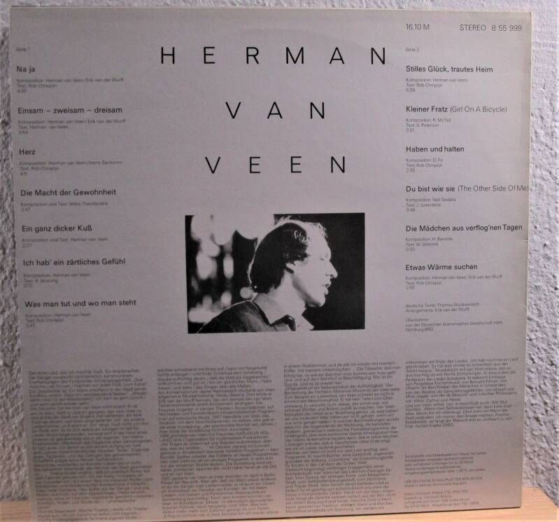 Herman van Veen - Herman van Veen Amiga 8 55 999 1983 Vinyl: VG++ Cover: VG+ Na Ja 4:00 Einsam - Zweisam - Dreisam 3:54 Herz 4:11 Die Macht der Gewohnheit 2:47 Ein ganz dicker Kuß 2:07 Ich hab' ein zärtliches Gefühl 2:12 Was man tut und wo man steht 3:47 Stilles Glück, Trautes Heim 5:08 Kleiner Frat
