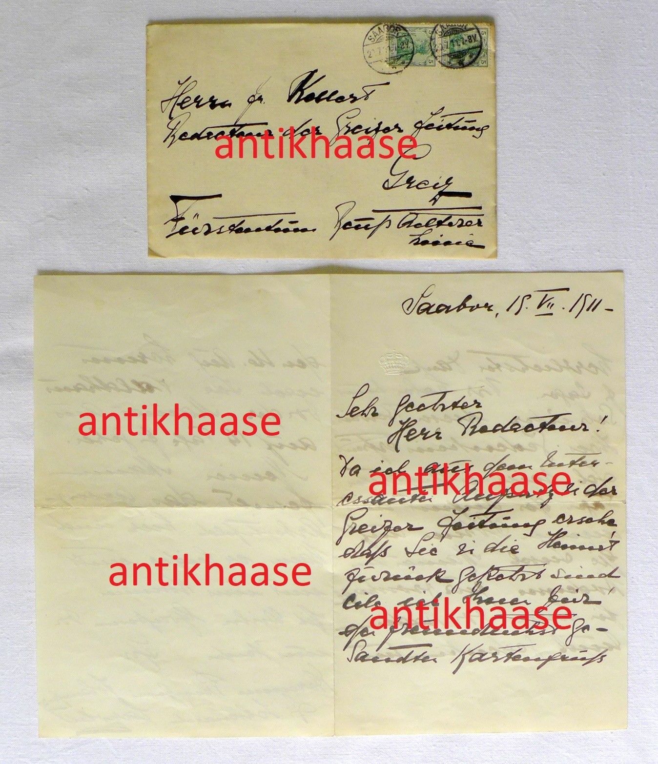 gebrauchter Zustand siehe Fotos , Brief datiert Saabor , 19. VII. 1911 , An Herrn Redakteur ( Greizer Zeitung ) und Schriftsteller Franz Kellert Greiz , Kellert war ab 1895 in Schlesien redaktionell tätig und ab 1899 Redakteur der Greizer Zeitung , Unterschrieben Hermine Prinzessin Johann Georg zu S