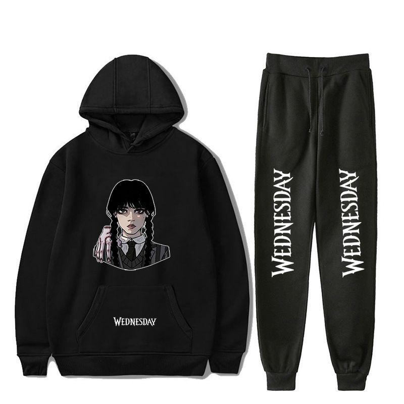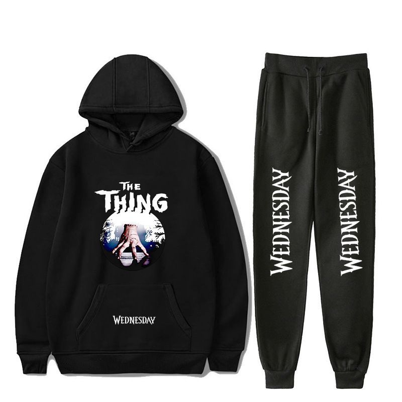 Herren 2er Set Sportanzug Wednesday Thing Addams Hoodie Hose Leggings Schwarz