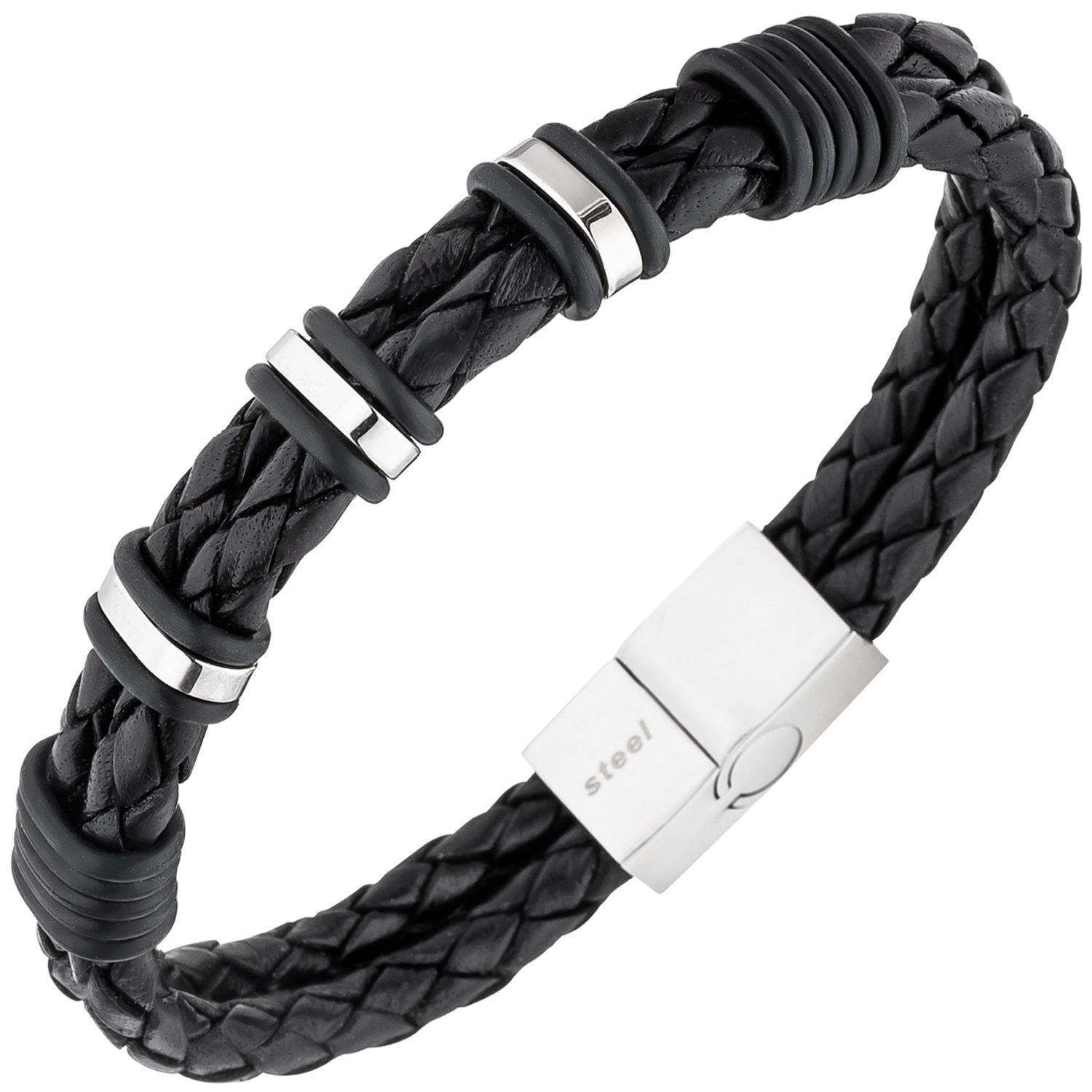 JOBO Herren Armband 2-reihig Leder schwarz mit Edelstahl 21 cm Herrenarmband