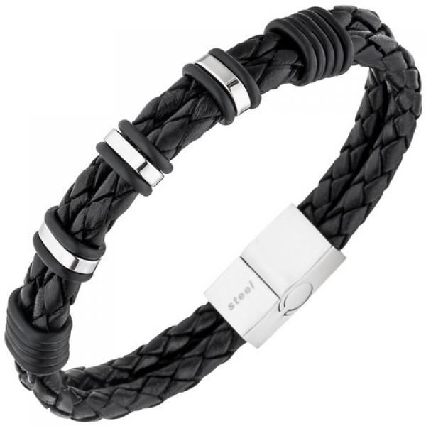 Herren Armband 2-reihig Leder schwarz mit Edelstahl 21 cm Herrenarmband