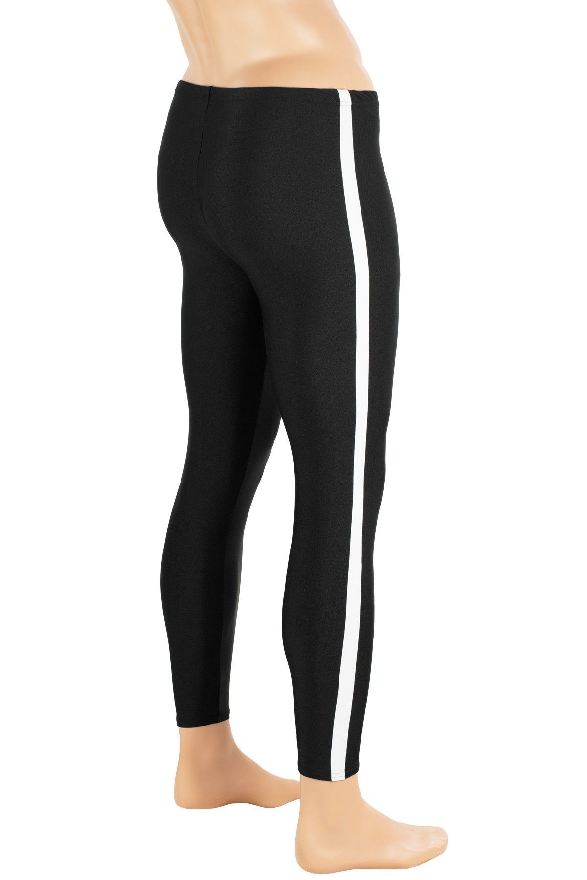 Herren Leggings mit weißen Galonstreifen aus 80% Polyamid 20% Elasthan. Elastisch und glänzend in der Farbe schwarz. Waschbar bei 30°C Maschinenwäsche Made in Germany, by us - ML-Sport24!