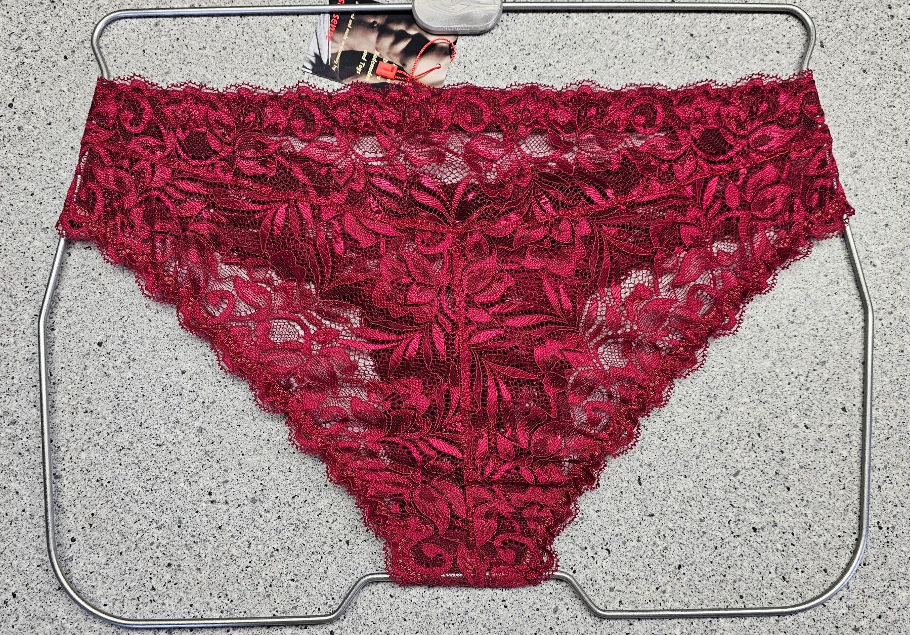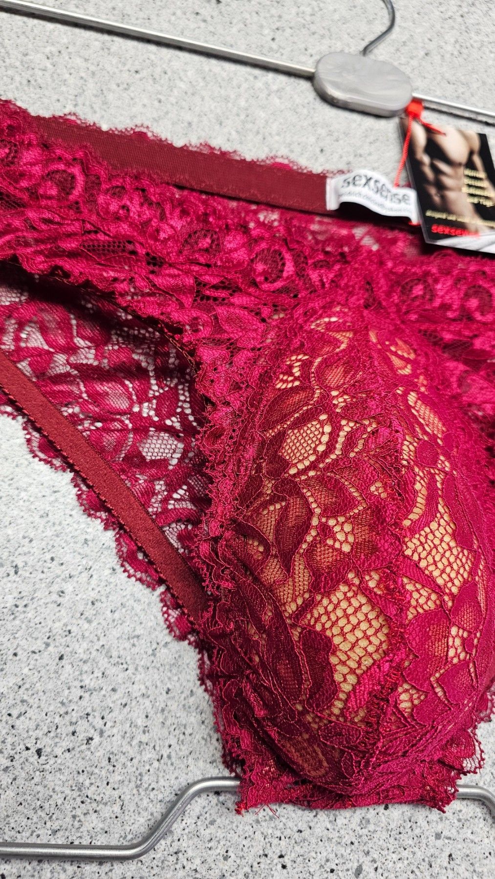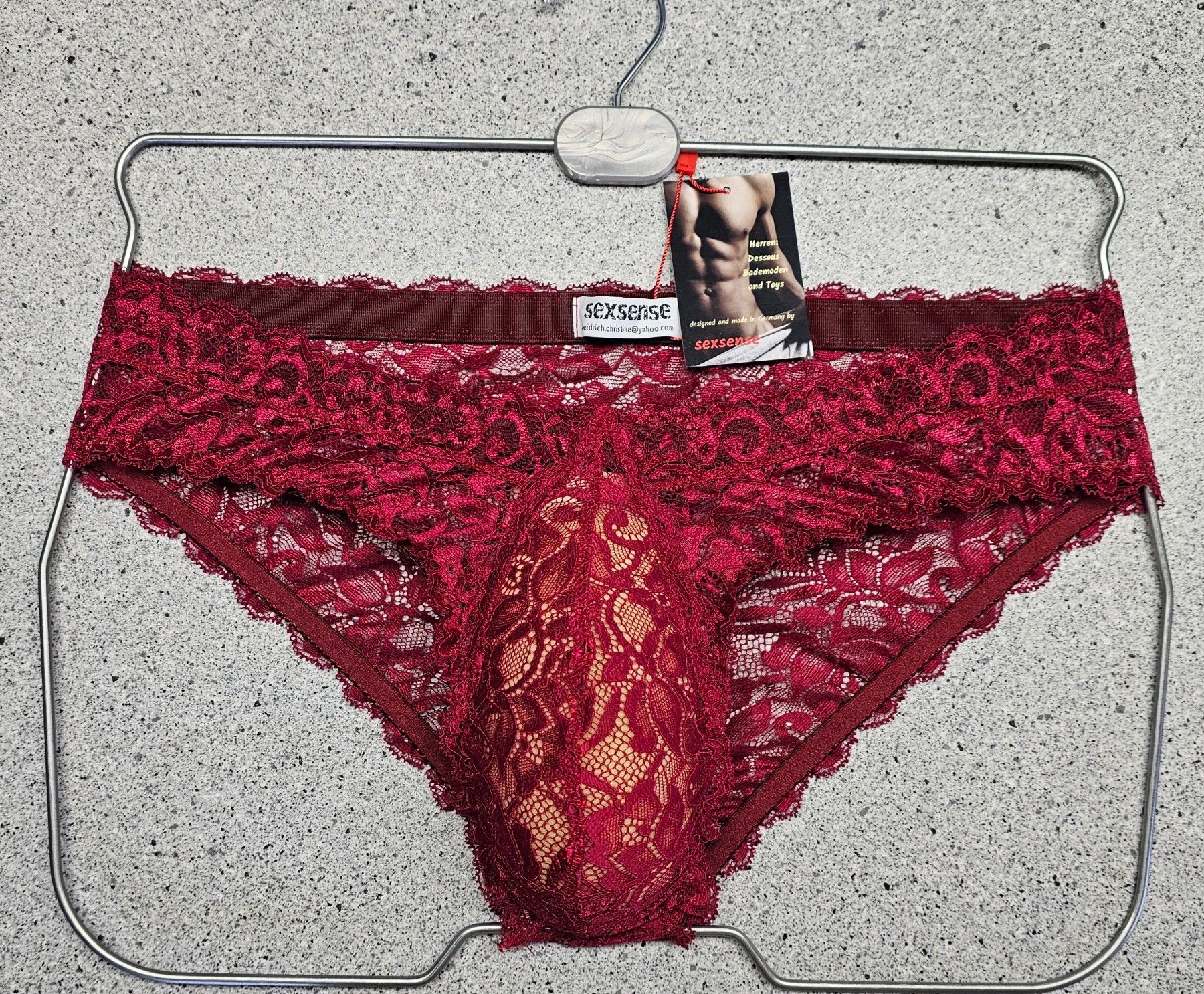Dunkelrote Spitze mit maskuliner Raffinesse Weniger Stoff, mehr Aussage: Dieser tief Rote Herren-Spitzen-Slip im Hipster-Stil verbindet weiche französische Spitze mit klarer Schnittführung für ein modernes, feminines Tragegefühl. Die originalen Spitzenabschlüsse an Bund und Beinen bleiben erhalten –