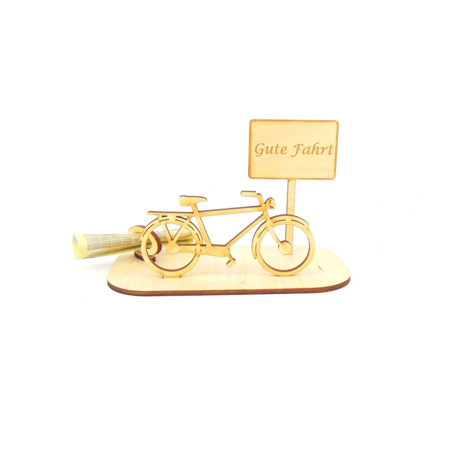 Herrenfahrrad Personalisiert aus Birkenholz für Geldgeschenk und/oder Gutscheingeschenk mit Wünschen Die Ortsschilder sind mit verschiedenen vorgegebenen Texten oder Sie teilen uns Ihre Wunschgravur mit. Sie erhalten 6 Teile aus 3 mm Birkenholz gelasert. Grundplatte 14 cm x 8 cm, einem Herrenfahrrad 10 cm lang 4 cm hoch, einem Schild mit Schriftzug 5,5 cm breit und 9 cm hoch.