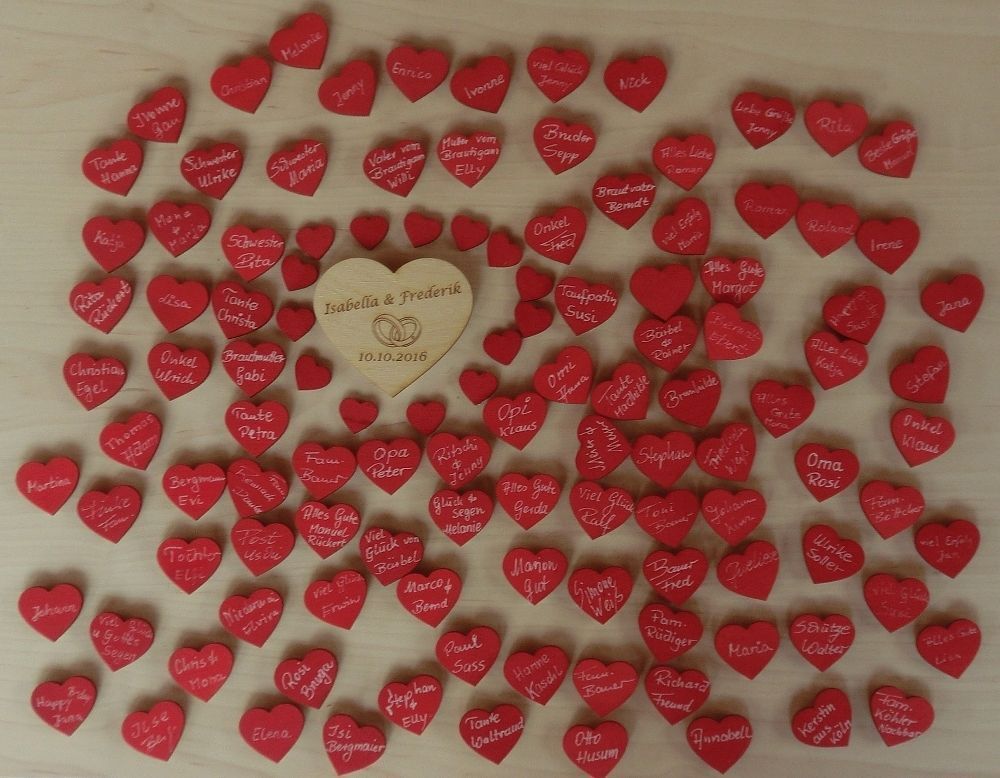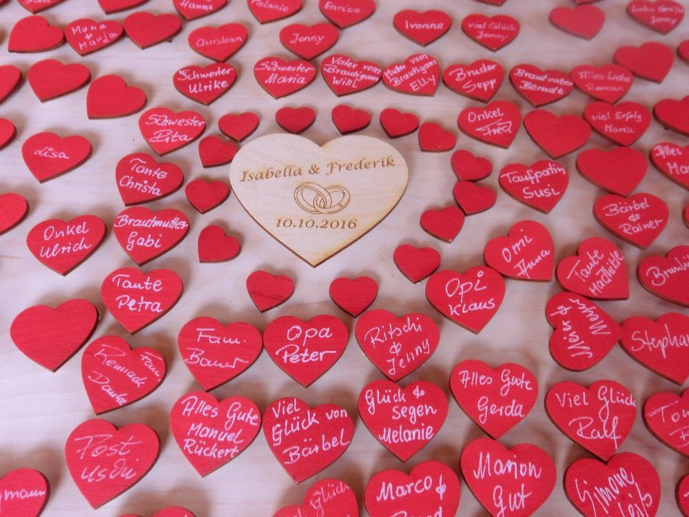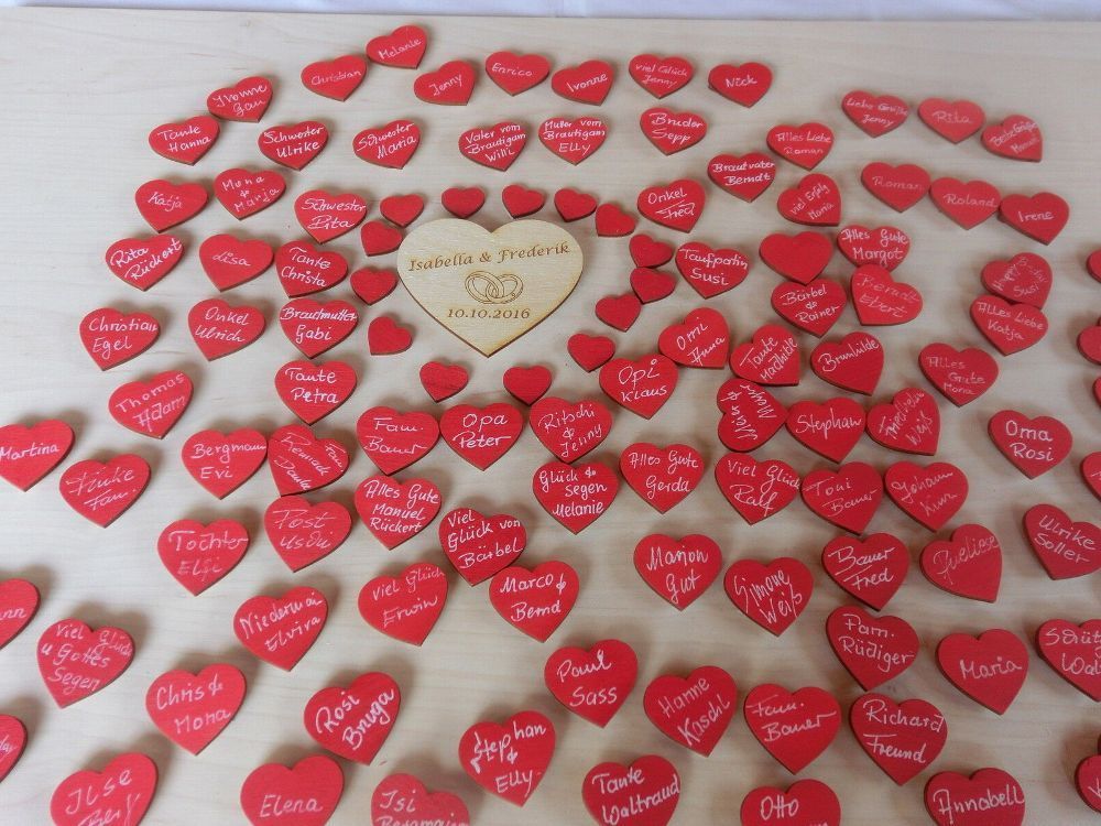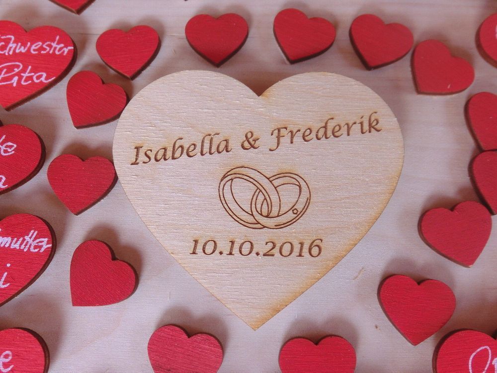 Egal ob zu festlichen Anlässen wie Hochzeit, Taufe, Jubiläum oder Valentinstag - die Herzchen sind der Hit! Wir bieten Ihnen hier wunderschöne Rote Lebkuchenherzen 50 Stück an, die aus edlem Naturholz gelasert werden. 1 Personalisiertes Herz 10 cm Breit mit den Namen der Brautleute und Datum. 1 weiß