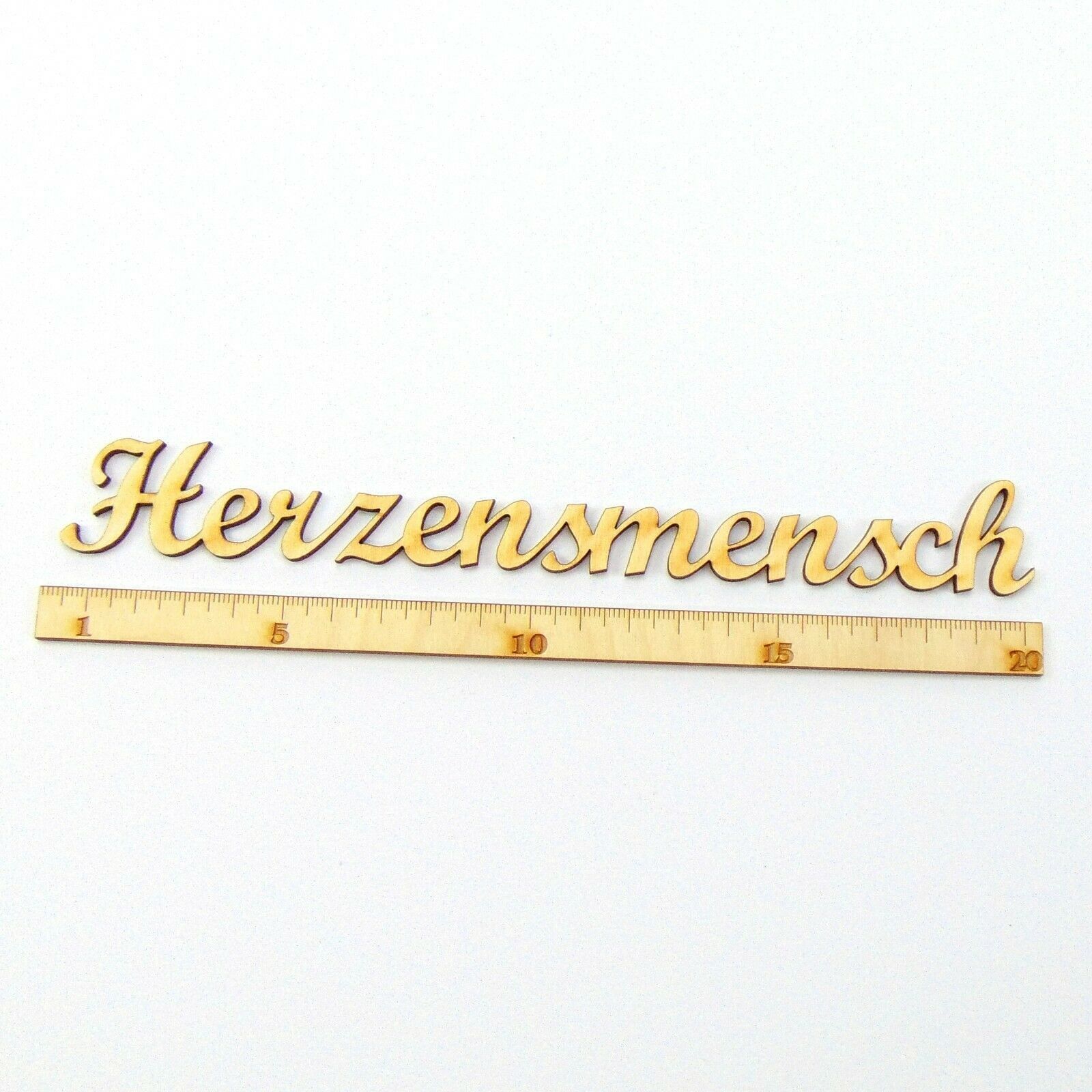 Herzensmensch als zusammenhängender Schriftzug für viele liebevolle Ideen und Gelegenheiten. Das Wort Herzensmensch hat eine Länge von 20 cm und ist 2,5 cm hoch. Aus 3 mm Birken Sperrholz hergestellt. Gestalten Sie es nach Ihren Wünschen oder lassen Sie es in Natur wirken. Zur farblichen Gestaltung