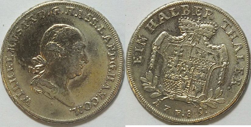 HESSEN Silber 1 2 Taler 1789 F Kopfbild Wilhelms IX., gekröntes Wappen mit Girlande auf Zweigen. Erhaltung ss+ Katalog-Nr. Schön 163