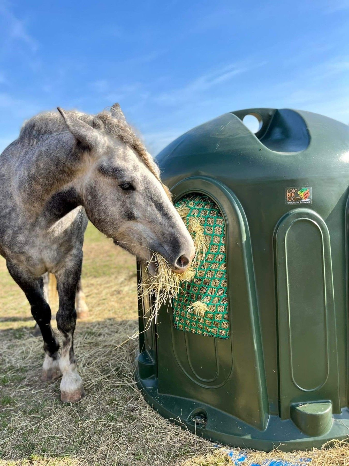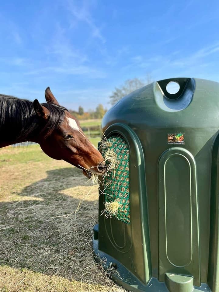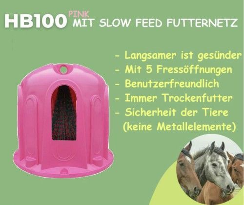 Heuglocke für Rundballen - Heuglocke HB100 SF in PINK mit slow feed Futternetz Tiere gefüttert, nicht überfressen Große Tiere sollten viel fressen, aber nicht schnell. Das ist gesünder und sicherer. Das slow feed Futternetz lässt die Tiere in einem natürlicheren Tempo fressen, ohne durch den gesamte