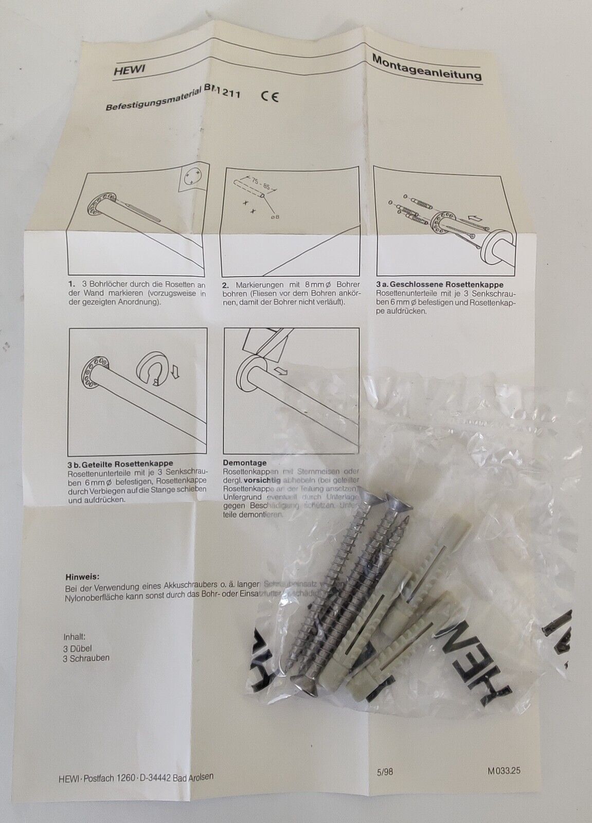 Wir bieten an: HEWI-Befestigungsmaterial 6x70 mm Sicherheitsschrauben Stangensystem BM211.5 Artikel-Nr.: BM211.5 Technische Daten Hersteller HEWI Modell BM211.5 Serie 801 805 Classic Material Edelstahl, Kunststoff Geeignet für Stangensystem 801 805 Classic Edelstahlsenkschrauben 6 x 70 mm Universal ... Mehr