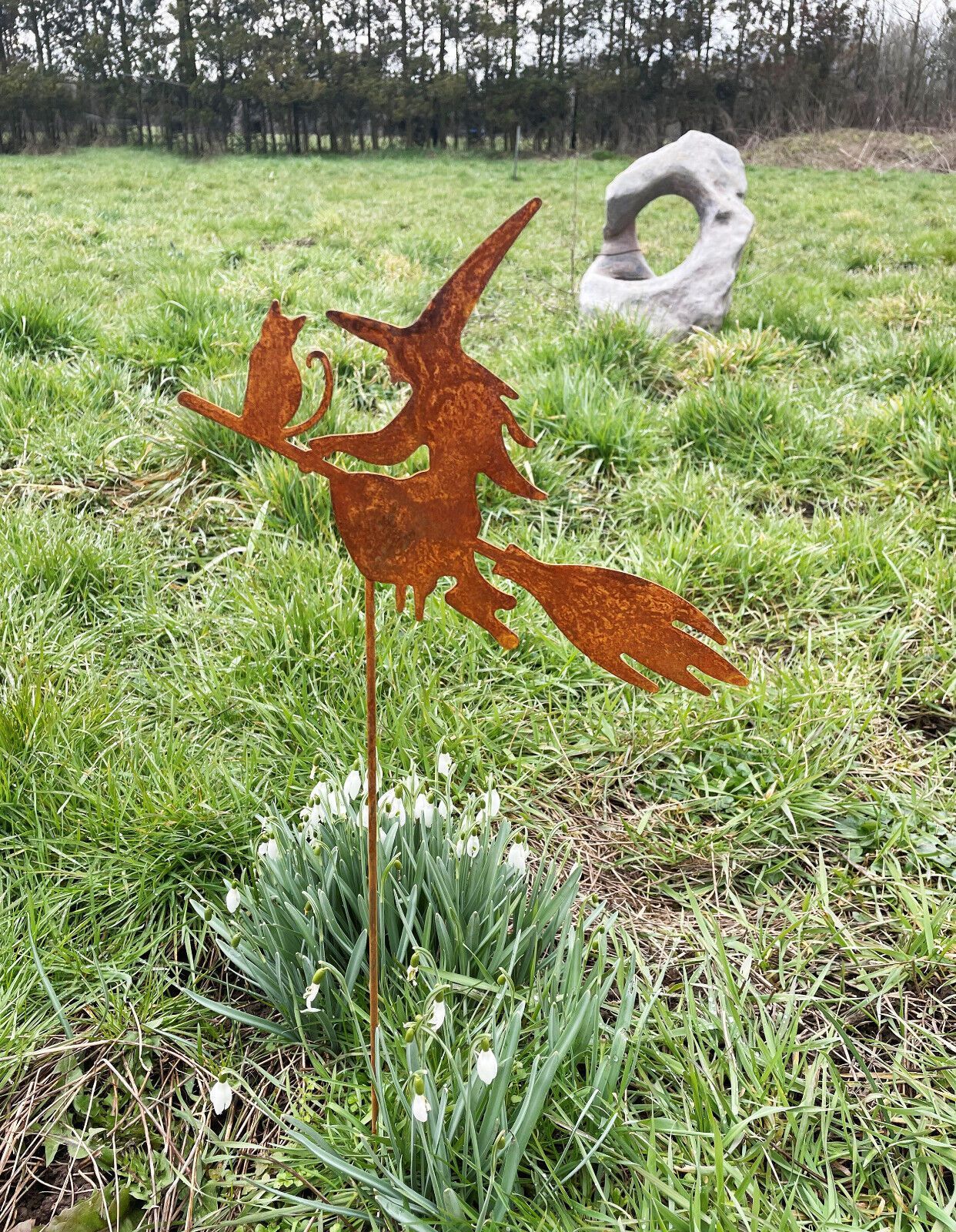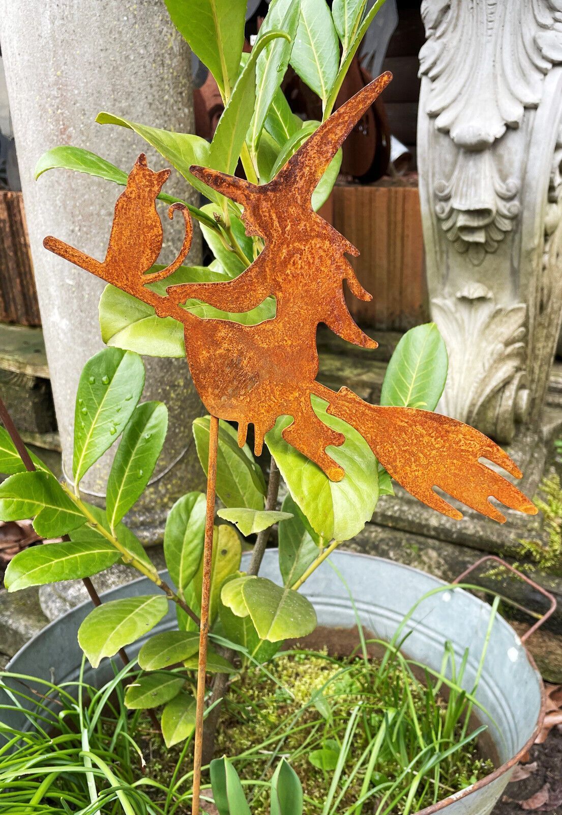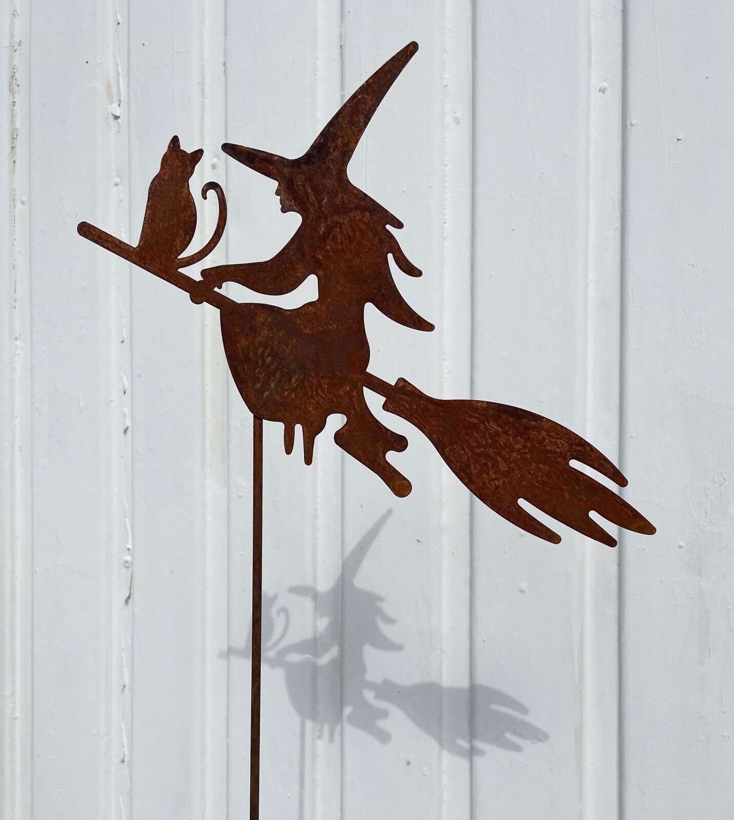 Hexe mit Katze auf Besen fliegend 20x25cm + Stab Edelrost Gartenstecker Rost