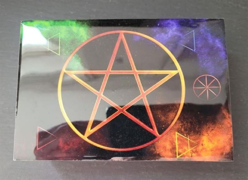 Buntes Hexenkästchen mit Pentagramm für Tarotkarten oder all Ihre schätzenswerten Dinge. Maße : 12,2 cm x 10,2 cm x 5,2 cm.