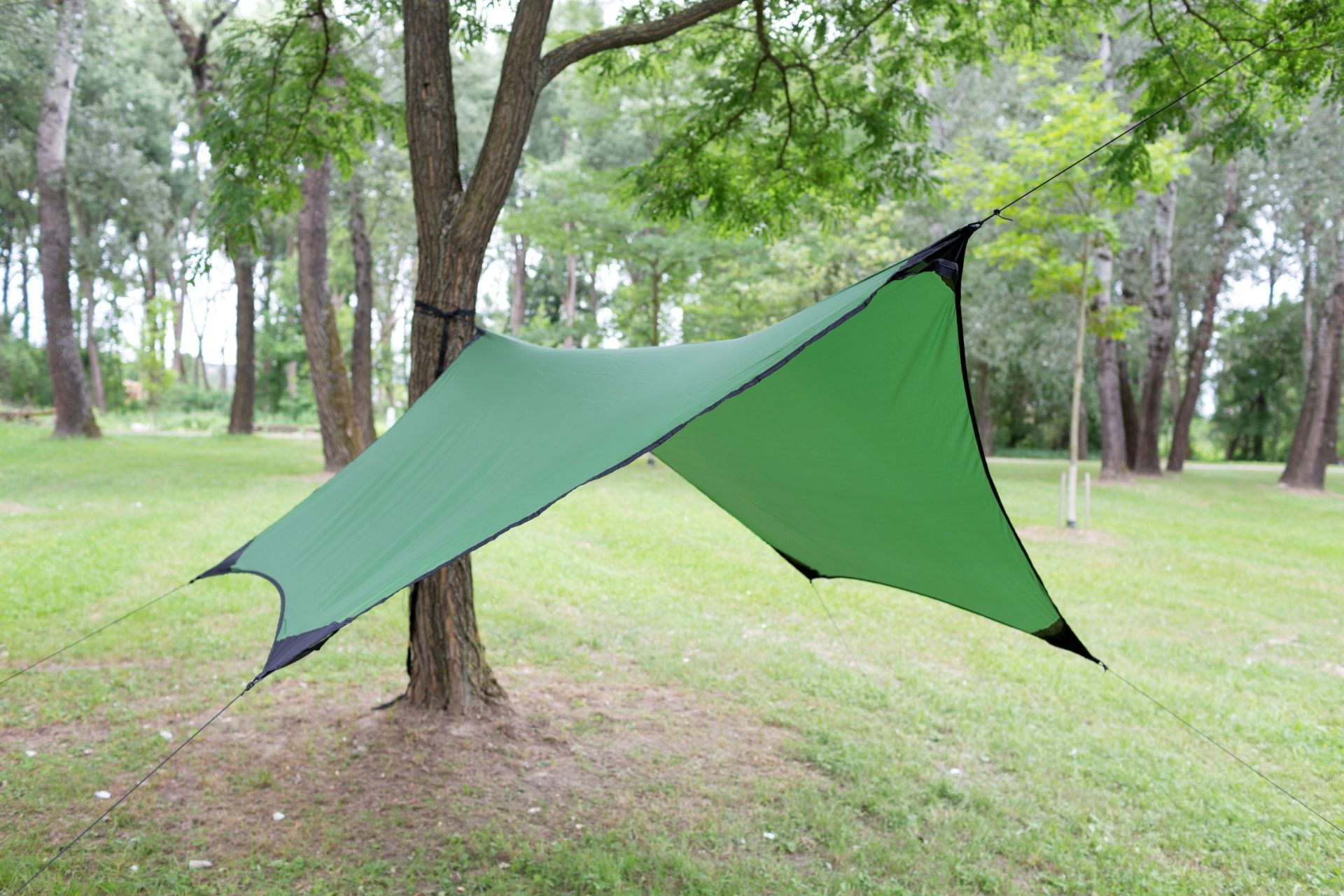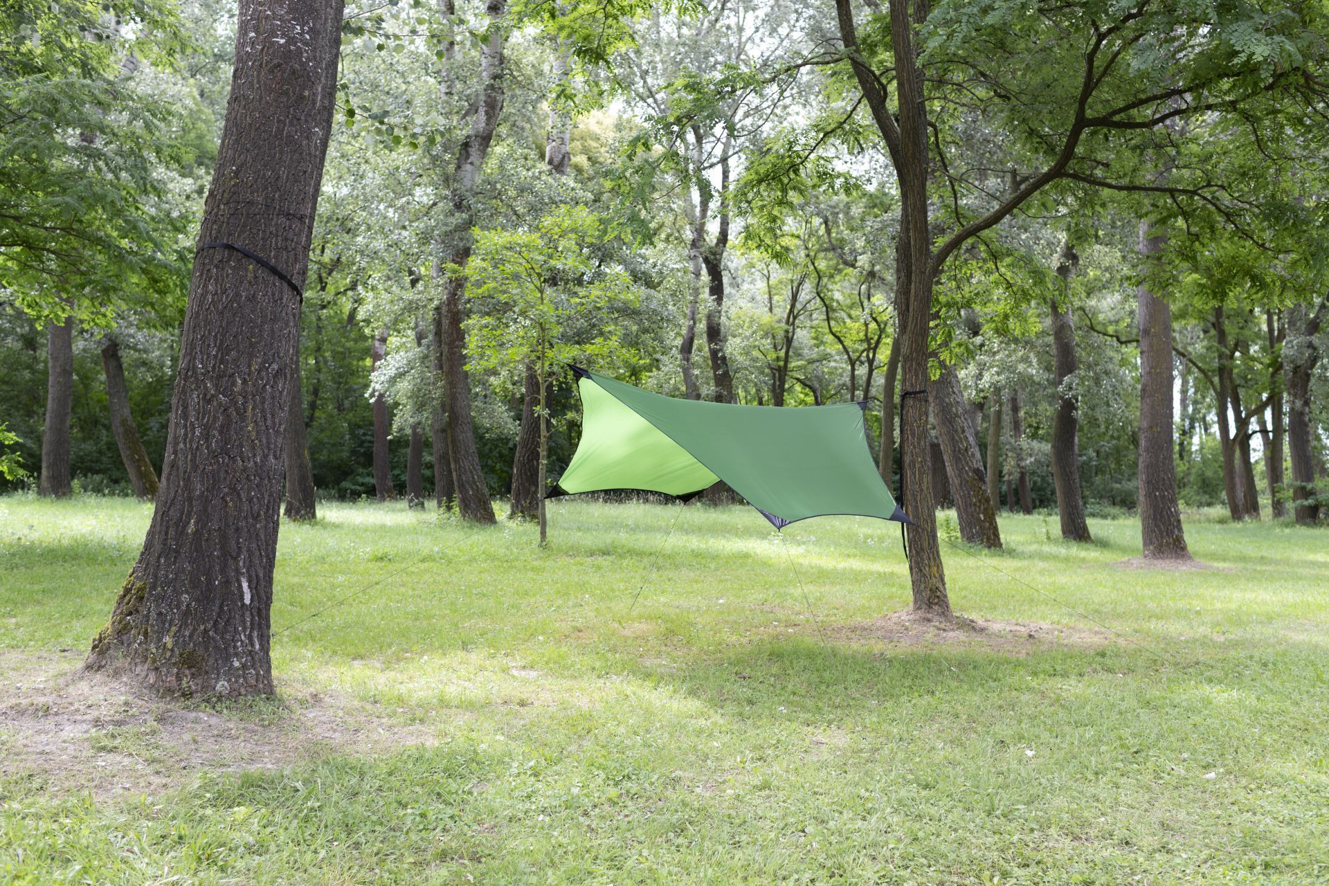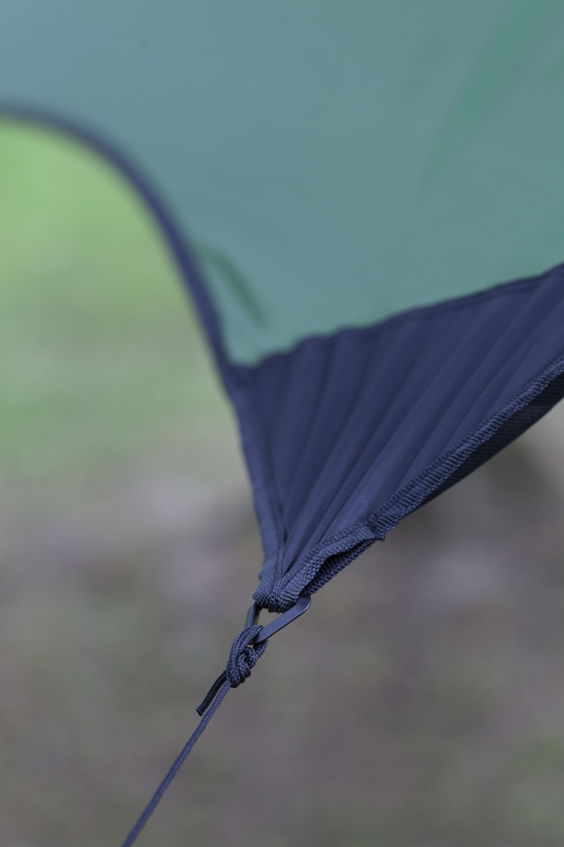 Dieses Tarp ist ein praktischer Regenschutz beim Campieren im Wald oder Urlaub am Campingplatz. Die Stromlinienform spart Gewicht und lässt Regenwasser gut abfließen. Das Zeltdach hält eine Person mit Gepäck trocken. Das leichte Ripstop Nylon Material ist PU beschichtet und hält einer Wassersäule vo