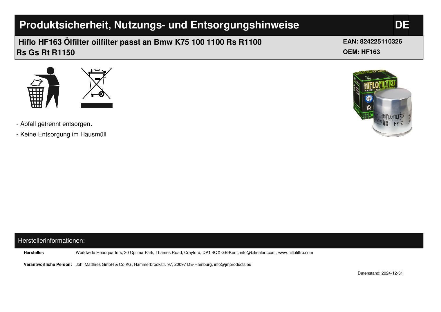Hiflo HF163 ?lfilter passt an Bmw K75 100 1100 1200 K1 Rs R1100 Rs Gs Rt R1150